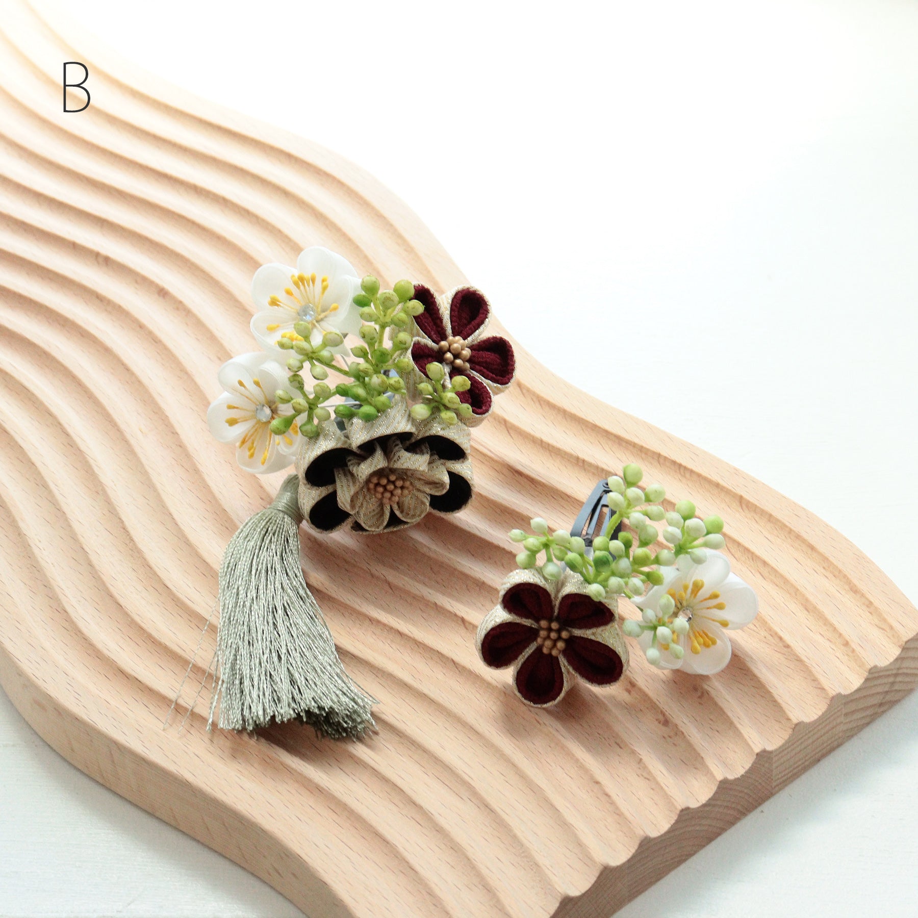髪飾り ヘアアクセサリー スリーピン2点セット 梅&実タッセル つまみ細工 日本製 (5432608401)