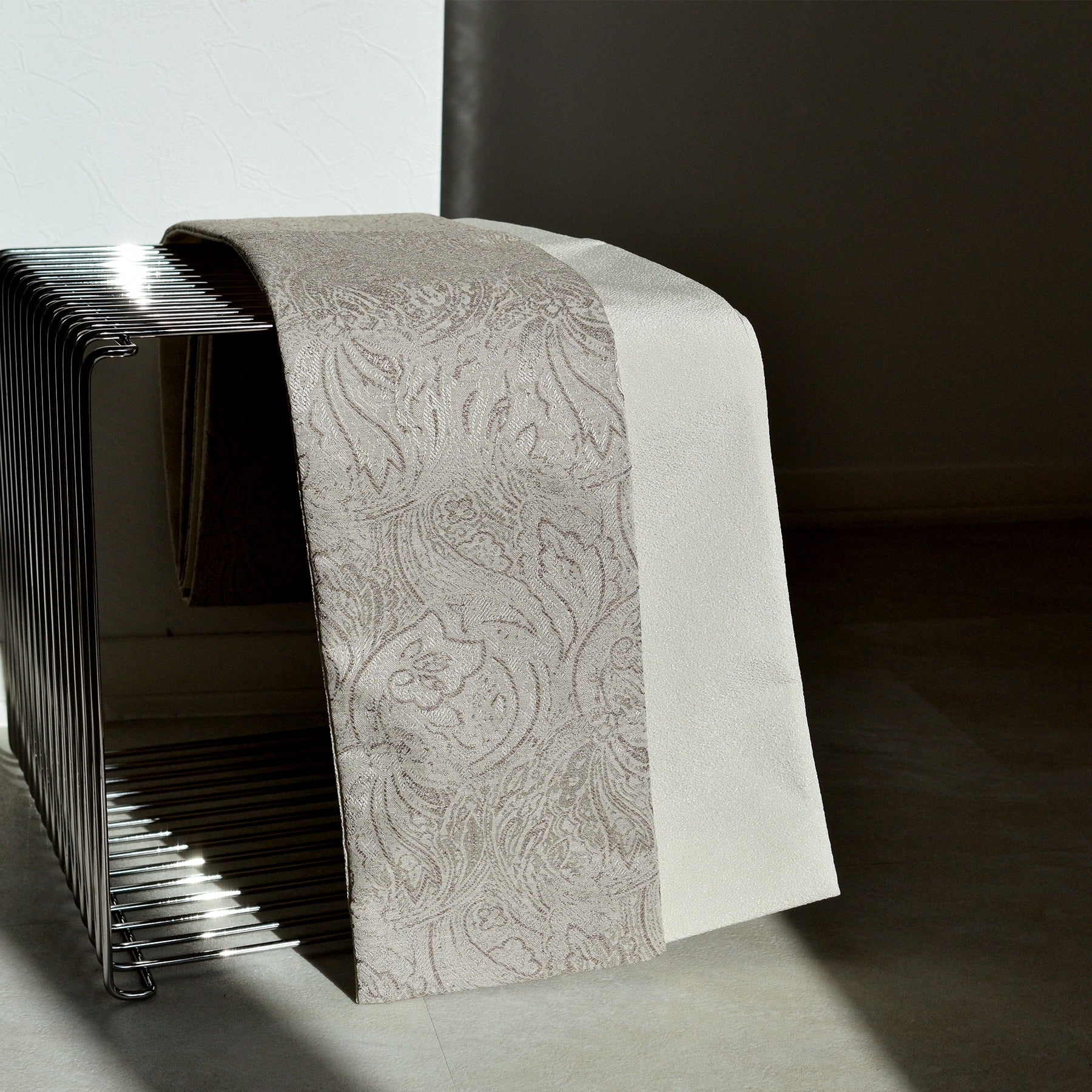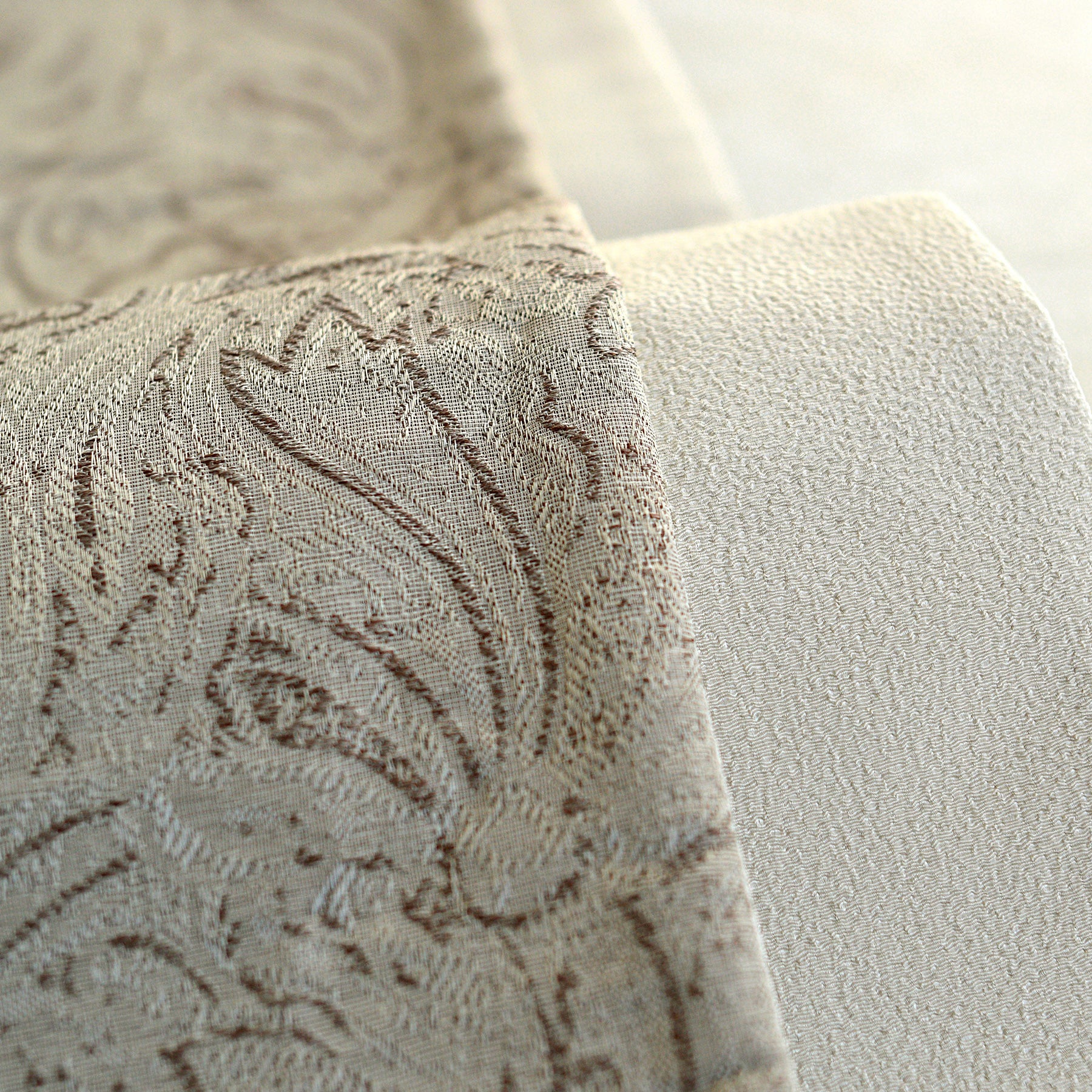 繊細な織りのジャガード生地を使用した小袋帯(半幅帯)。