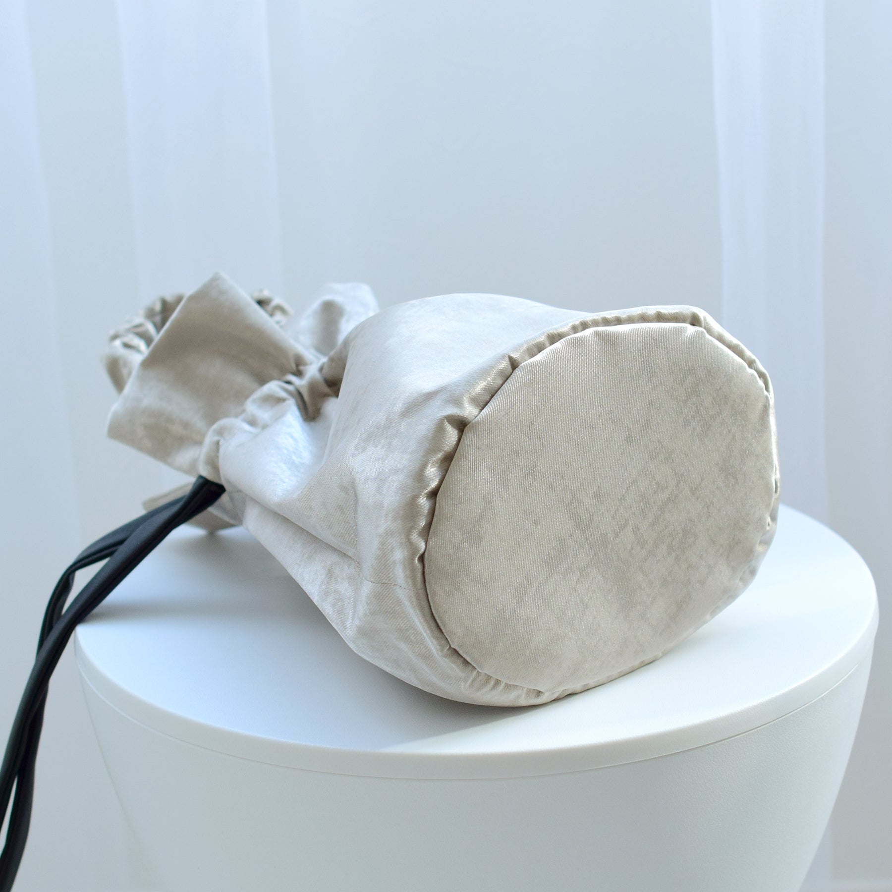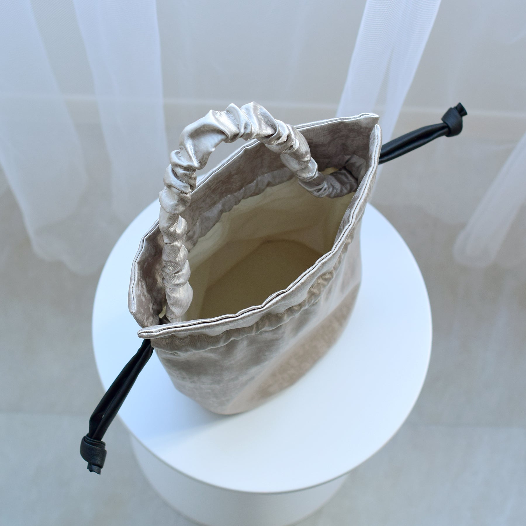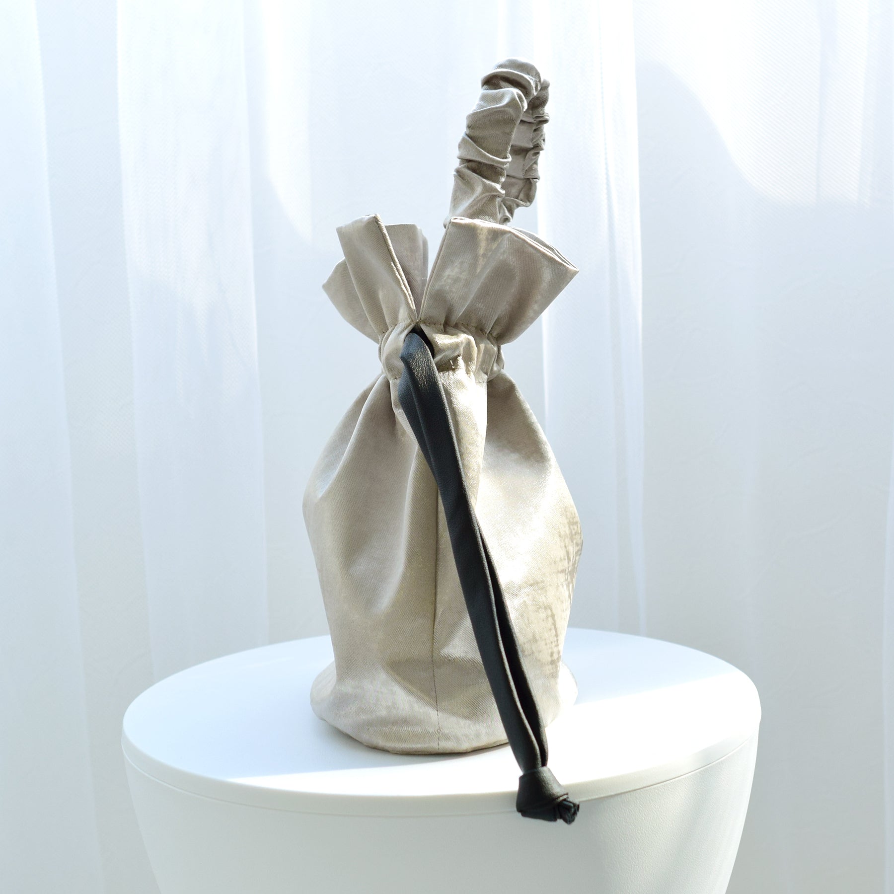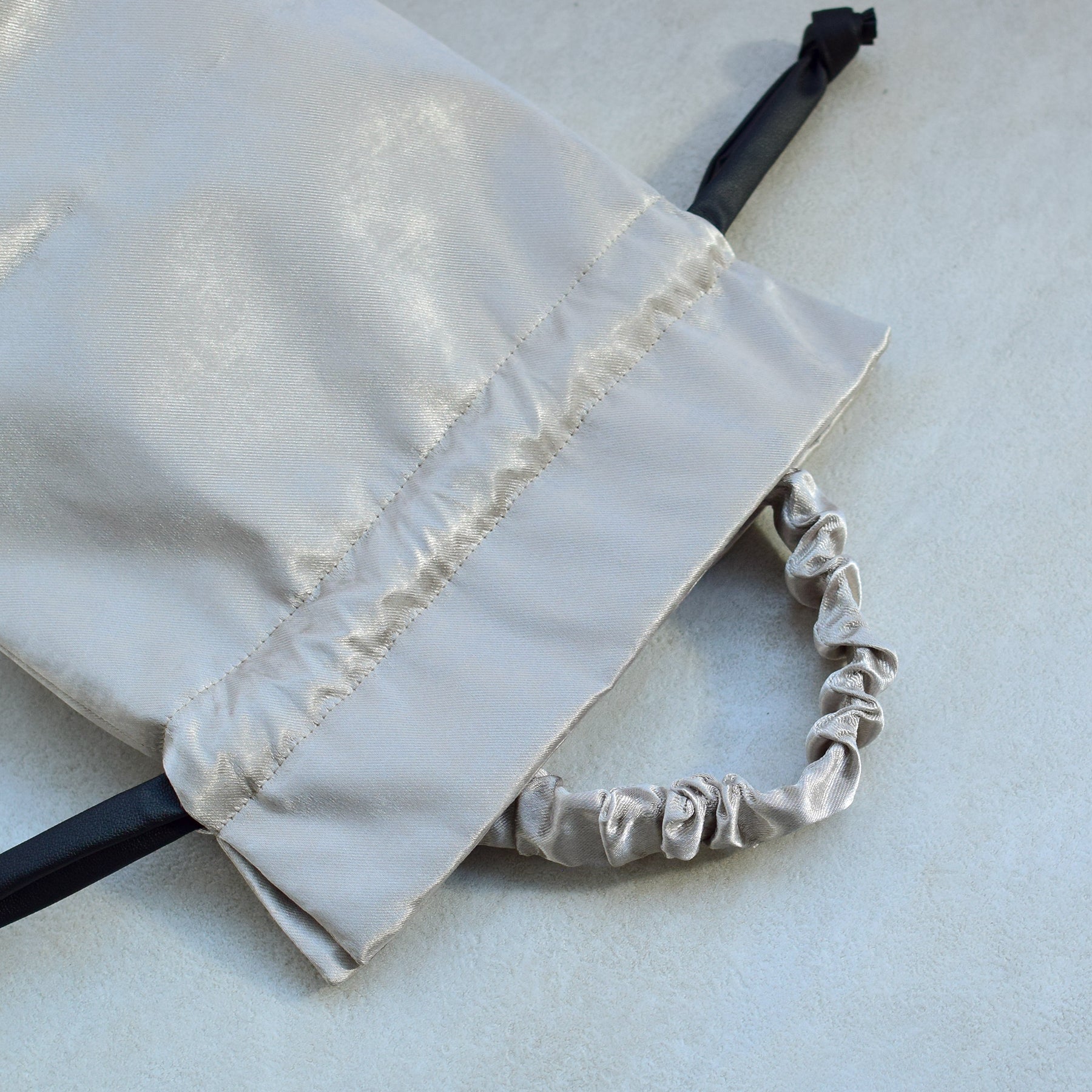 くしゅくしゅのギャザーハンドルに、レザー調のコードがアクセント。
