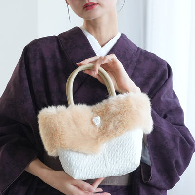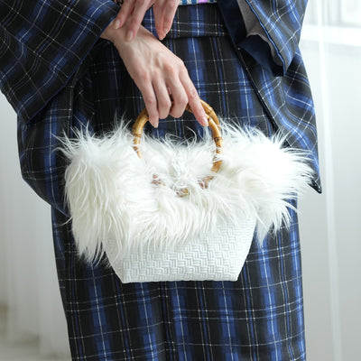 【ファー付ミニトートバッグ】バンブーリングハンドル×プレミアムリサイクル ビジョンフリーゼホワイト フェイクファー和装 カジュアル(2690607900)
