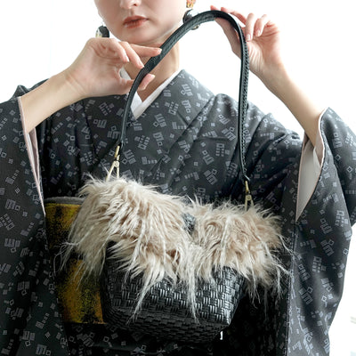 【ファー付2wayミニショルダーバッグ】かごバッグ 羊革×プレミアムリサイクル ブラック×シュナウザーグレー フェイクファー和装 カジュアル(2690607300)
