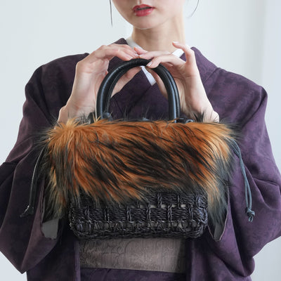 【ファー付ミニトートバッグ】かごバッグ 羊革×ラフィア ブラック×ブラウンテリア フェイクファー和装 カジュアル(2690607400)