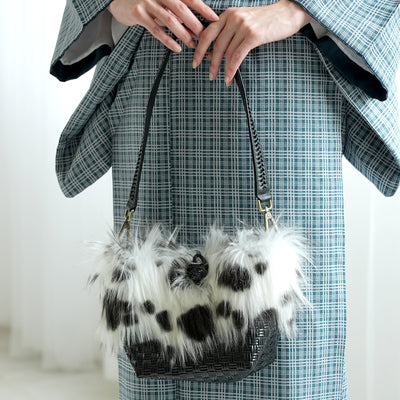 【ファー付2wayミニショルダーバッグ】かごバッグ 牛革×プレミアムリサイクル ブラック×ダルメシアン フェイクファー和装 カジュアル(2690607500)