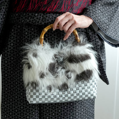 【ファー付ミニトートバッグ】バンブーリングハンドル×プレミアムリサイクル シルバー×ダルメシアン フェイクファー和装 カジュアル(2690608100)