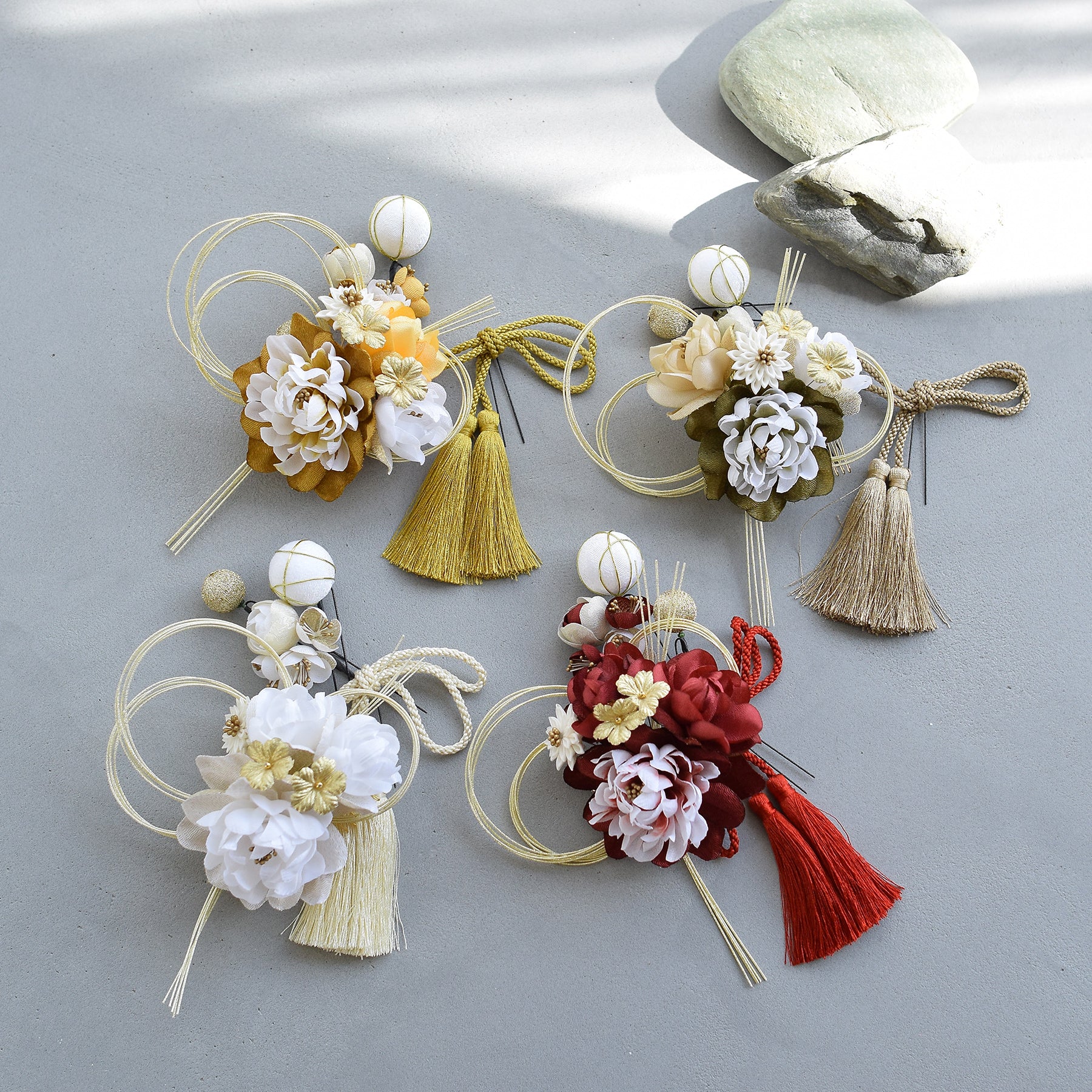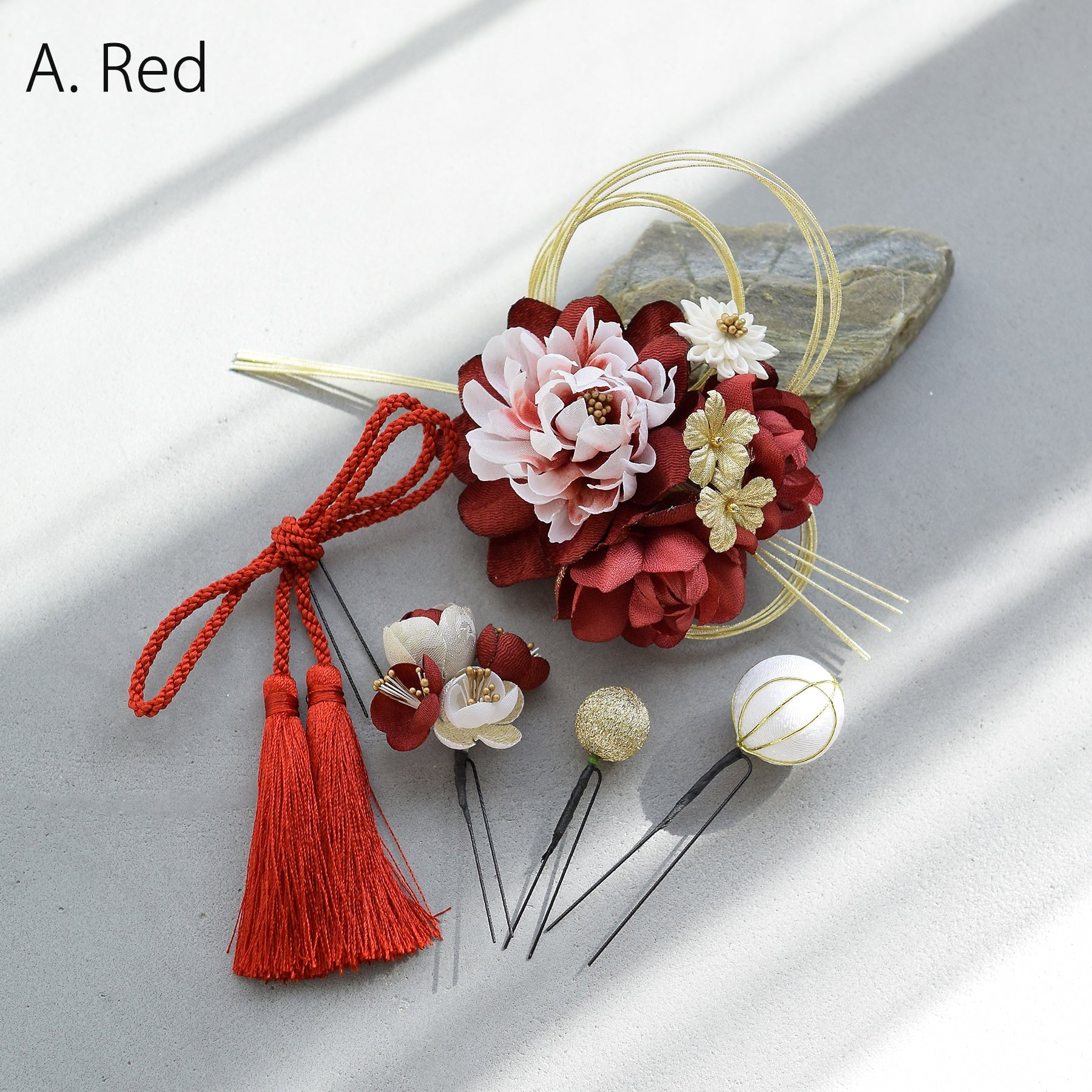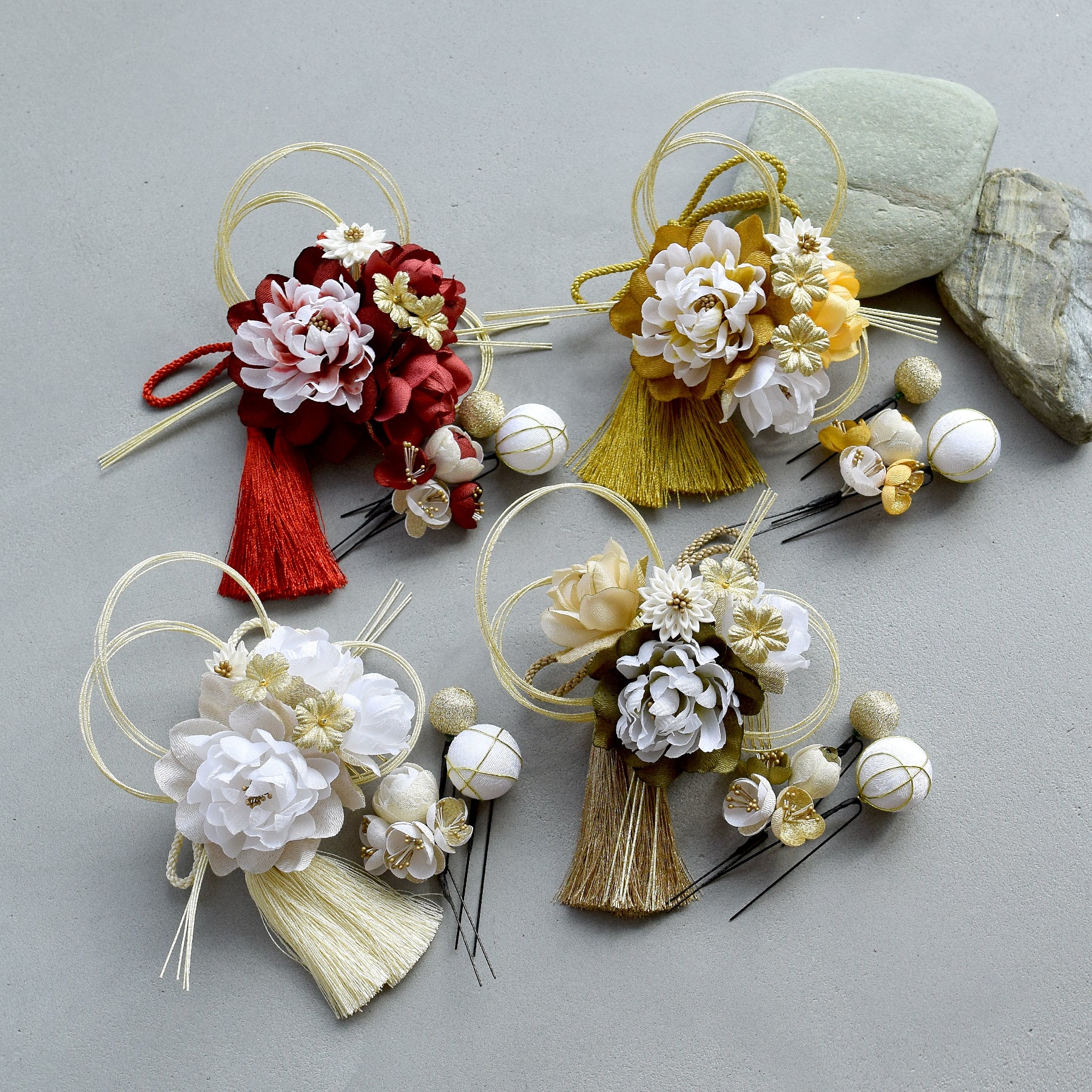 【髪飾り 牡丹・梅・桜&水引・タッセル コームUピン5点セット】花 水引 玉 タッセル ヘアアクセサリー 日本製 成人式振袖や卒業式袴にも(5432637801)【取り寄せ品】