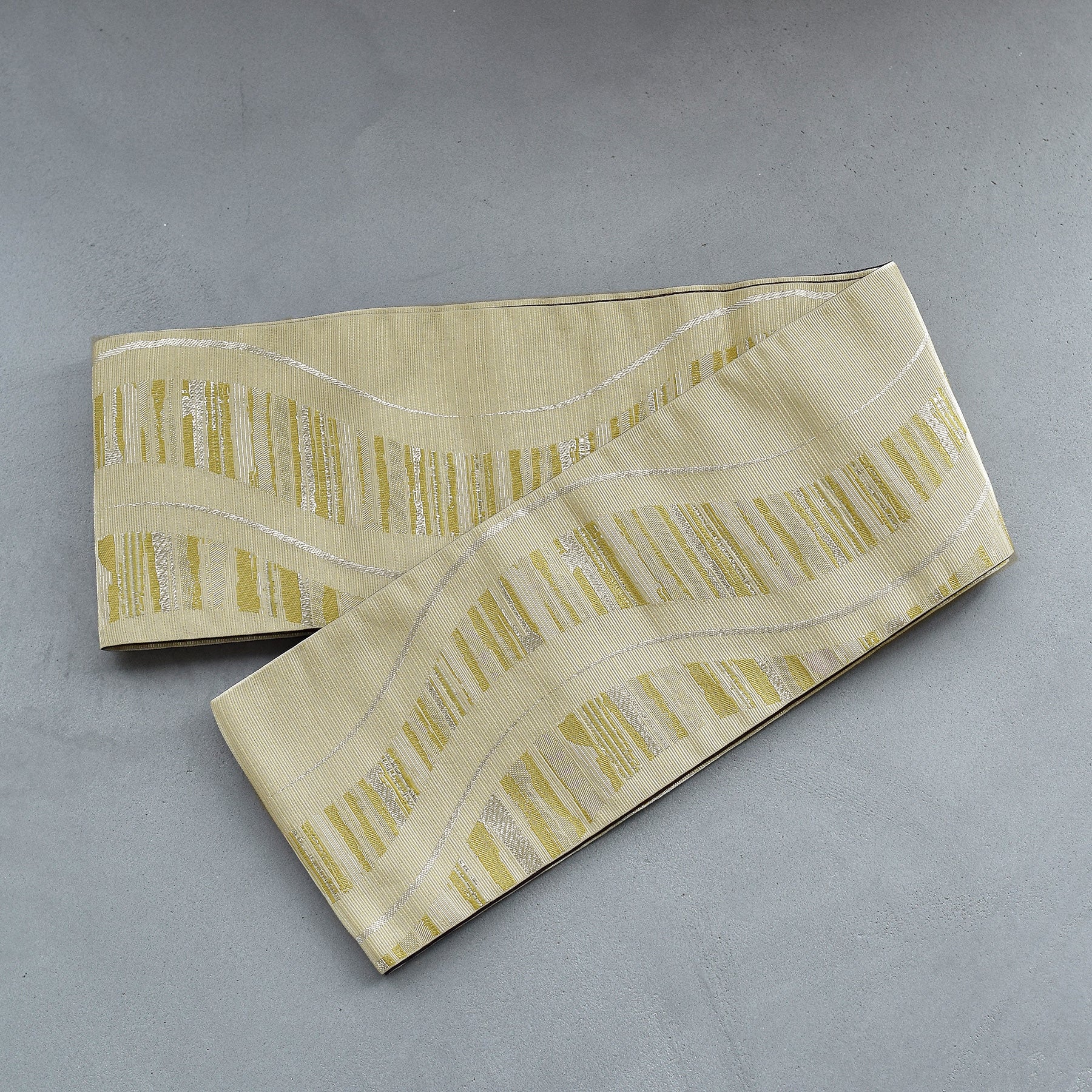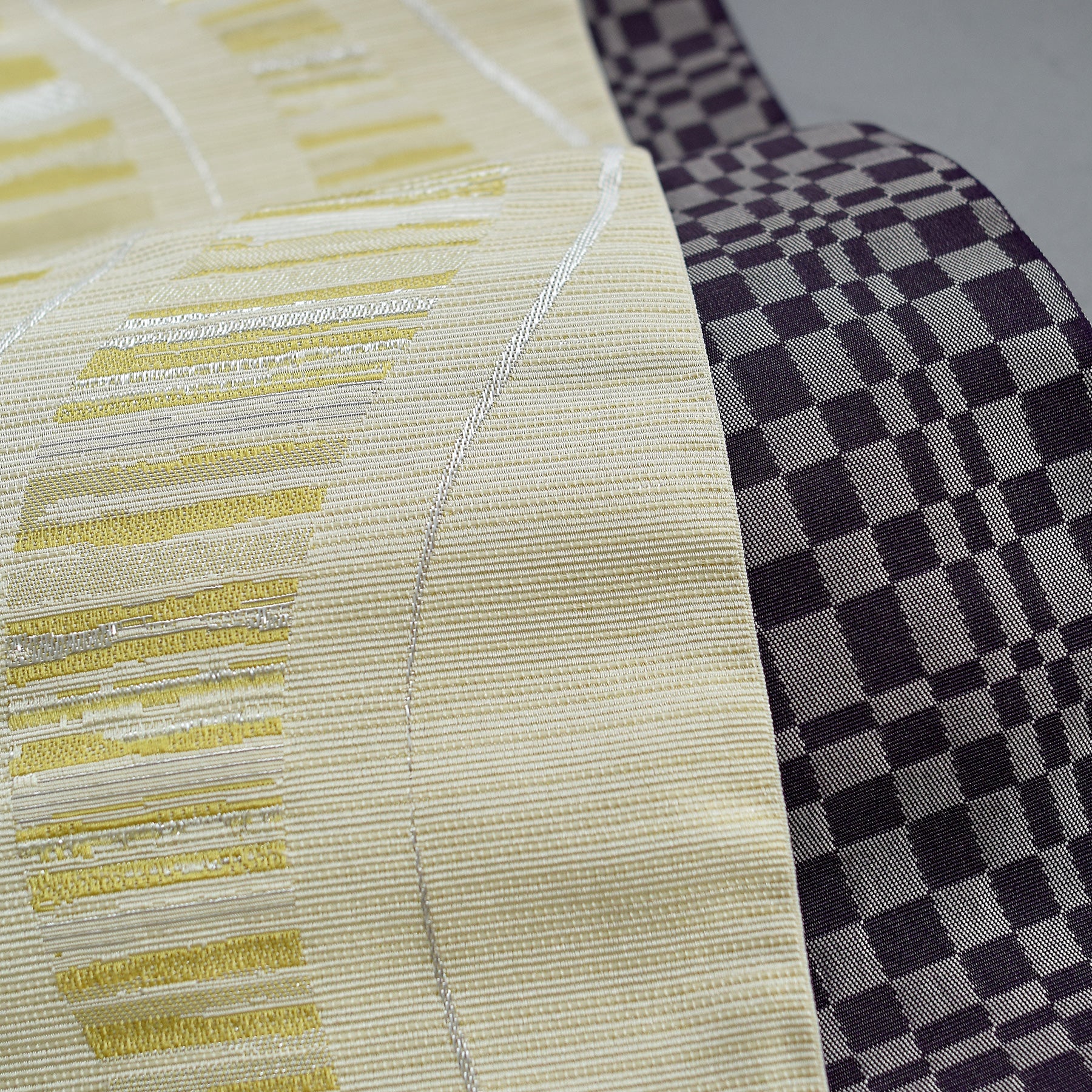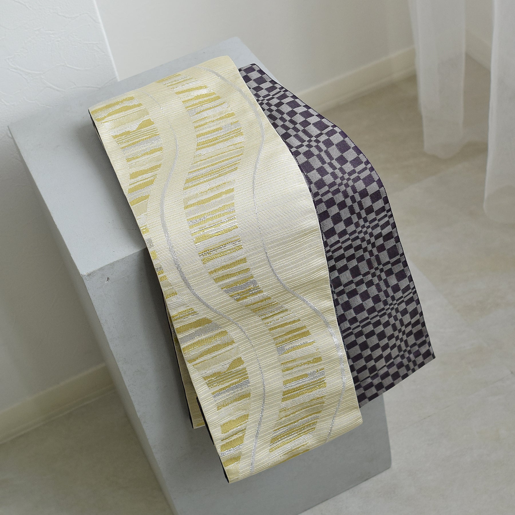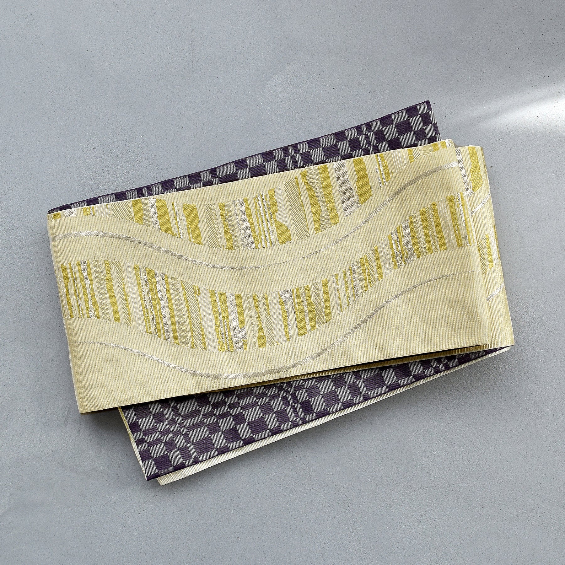 【半幅帯 リバーシブル 淡黄流光】帯単品 小袋帯 長尺 日本製 細帯 オールシーズン 浴衣 紬 小紋 着物 イエローベージュ 紫 グレー(5279627000)