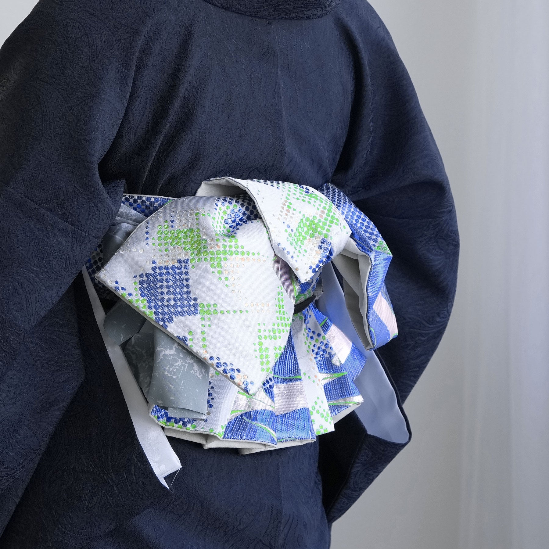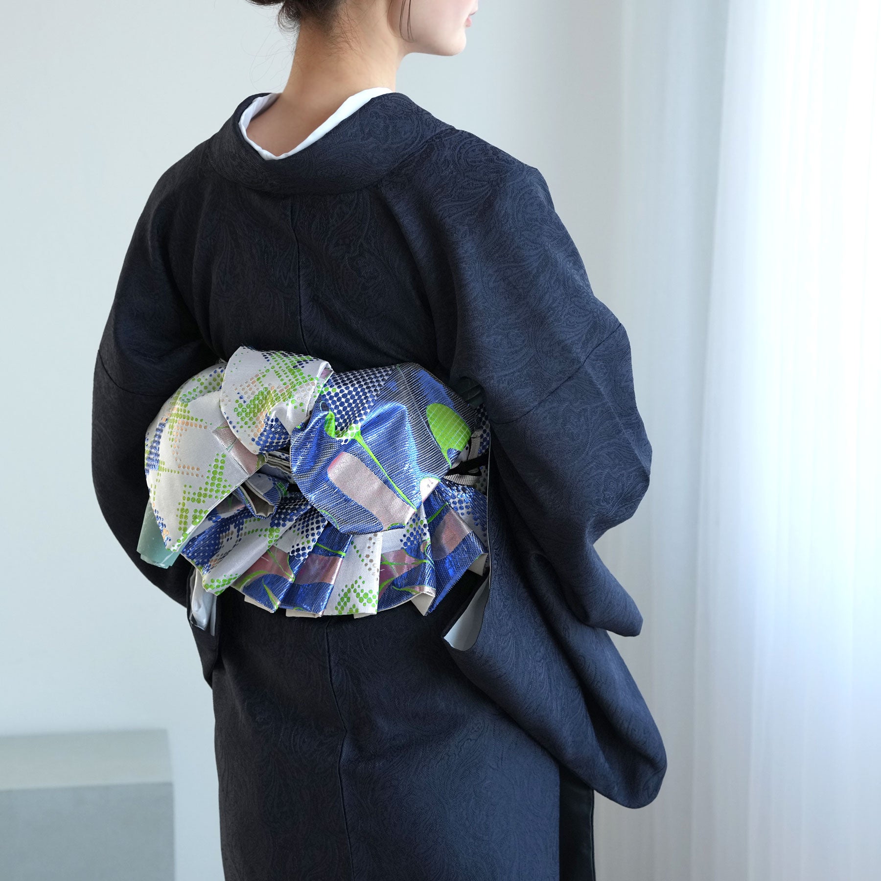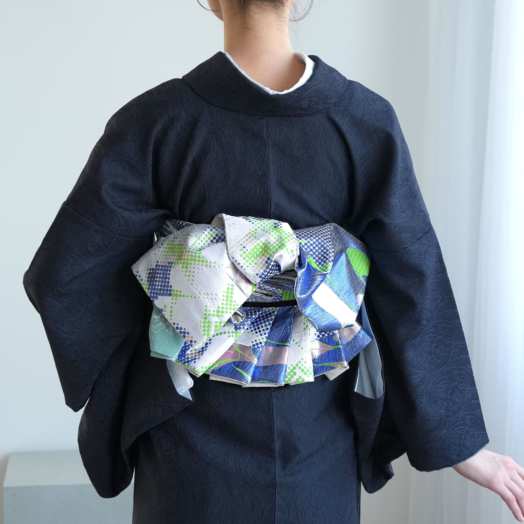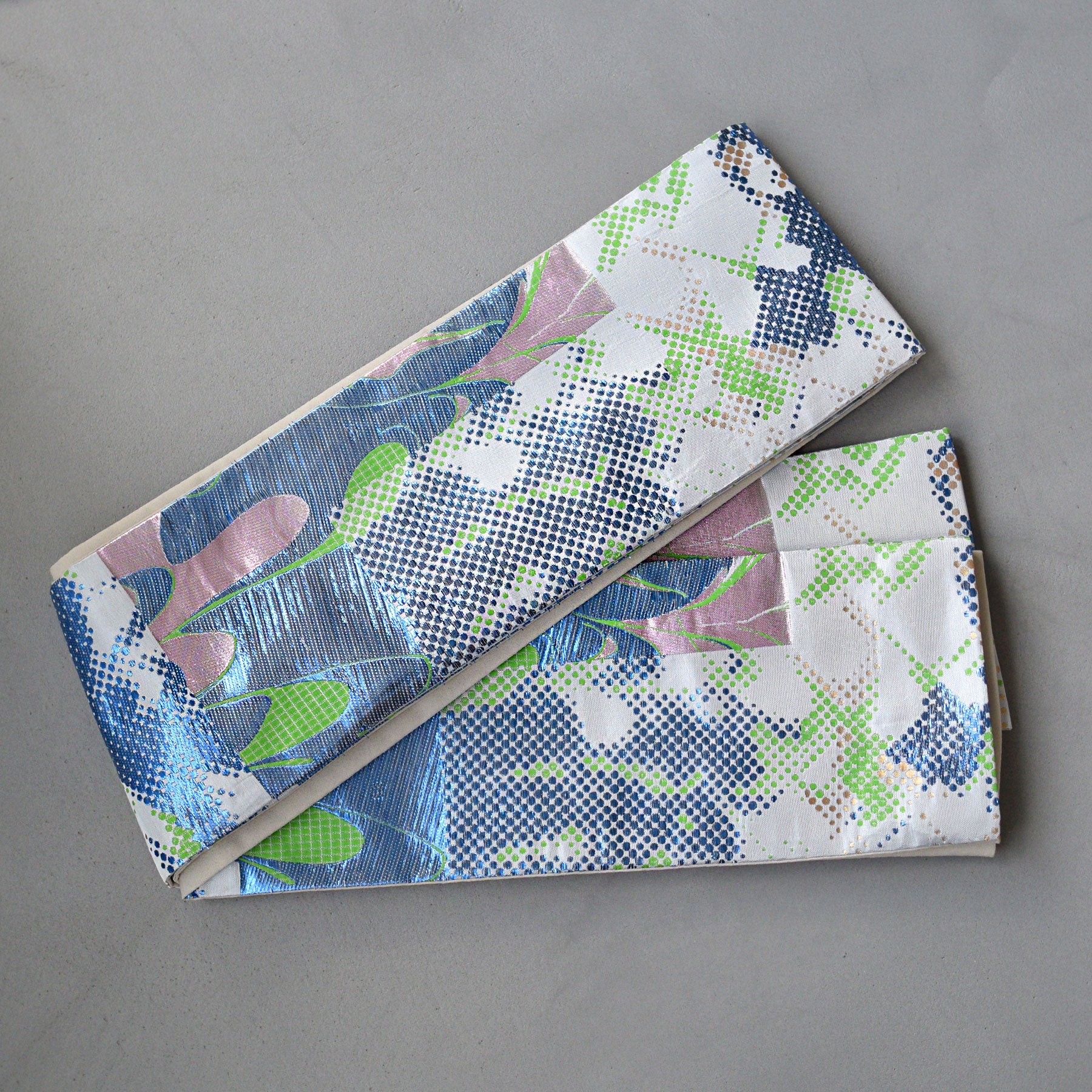 結び方によってはラメ糸がキラキラと輝いて存在感のある帯に仕上がっています。