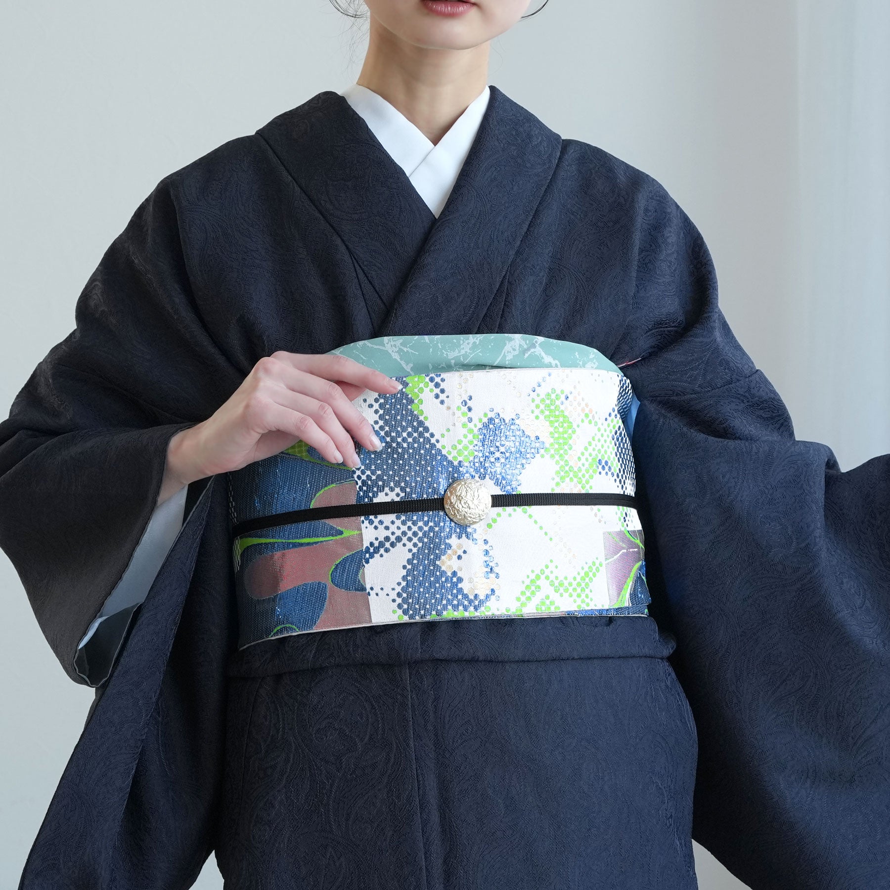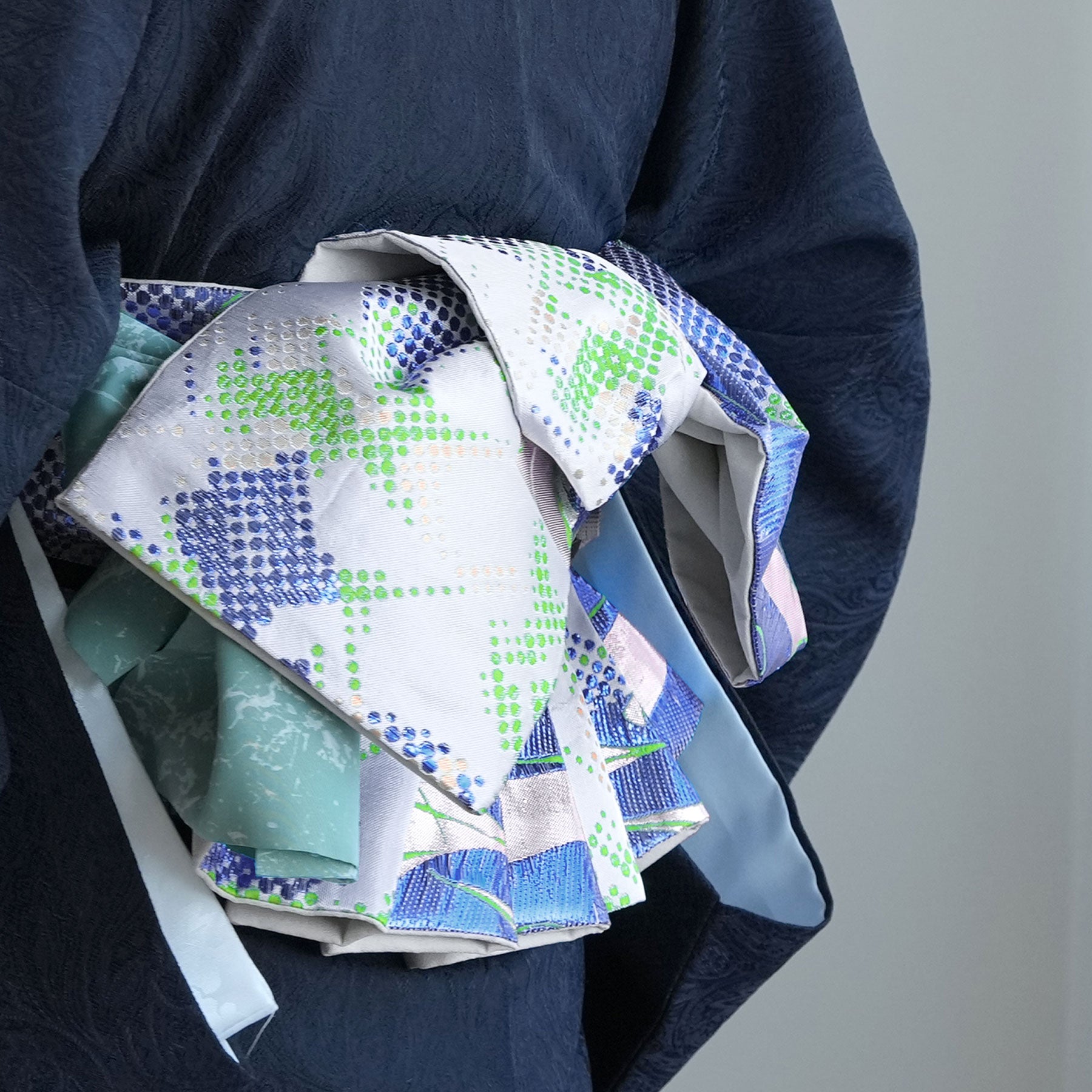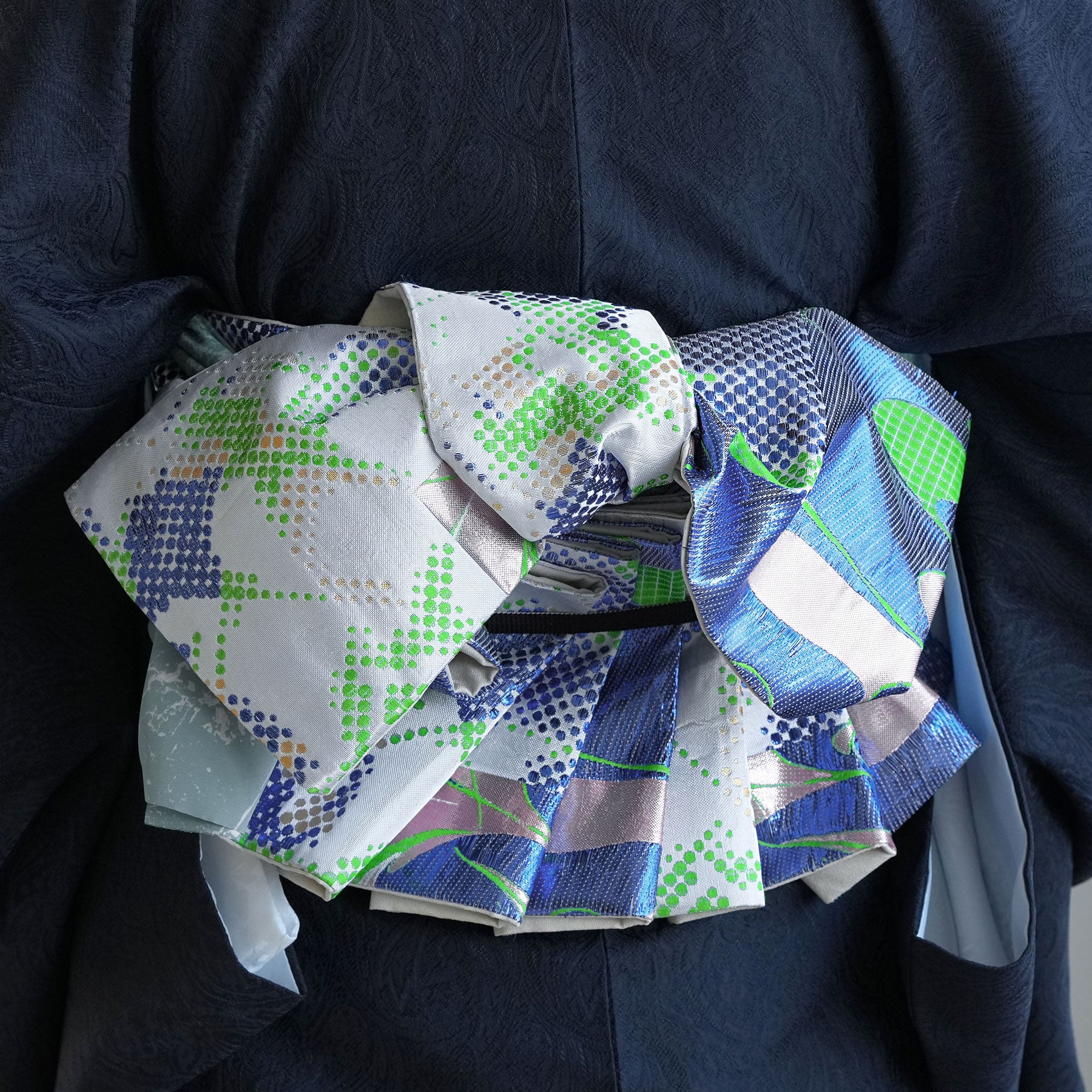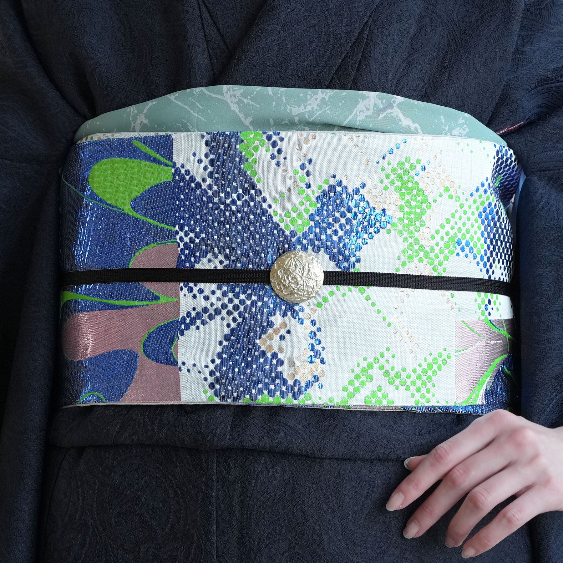 結び方によってはラメ糸がキラキラと輝いて存在感のある帯に仕上がっています。