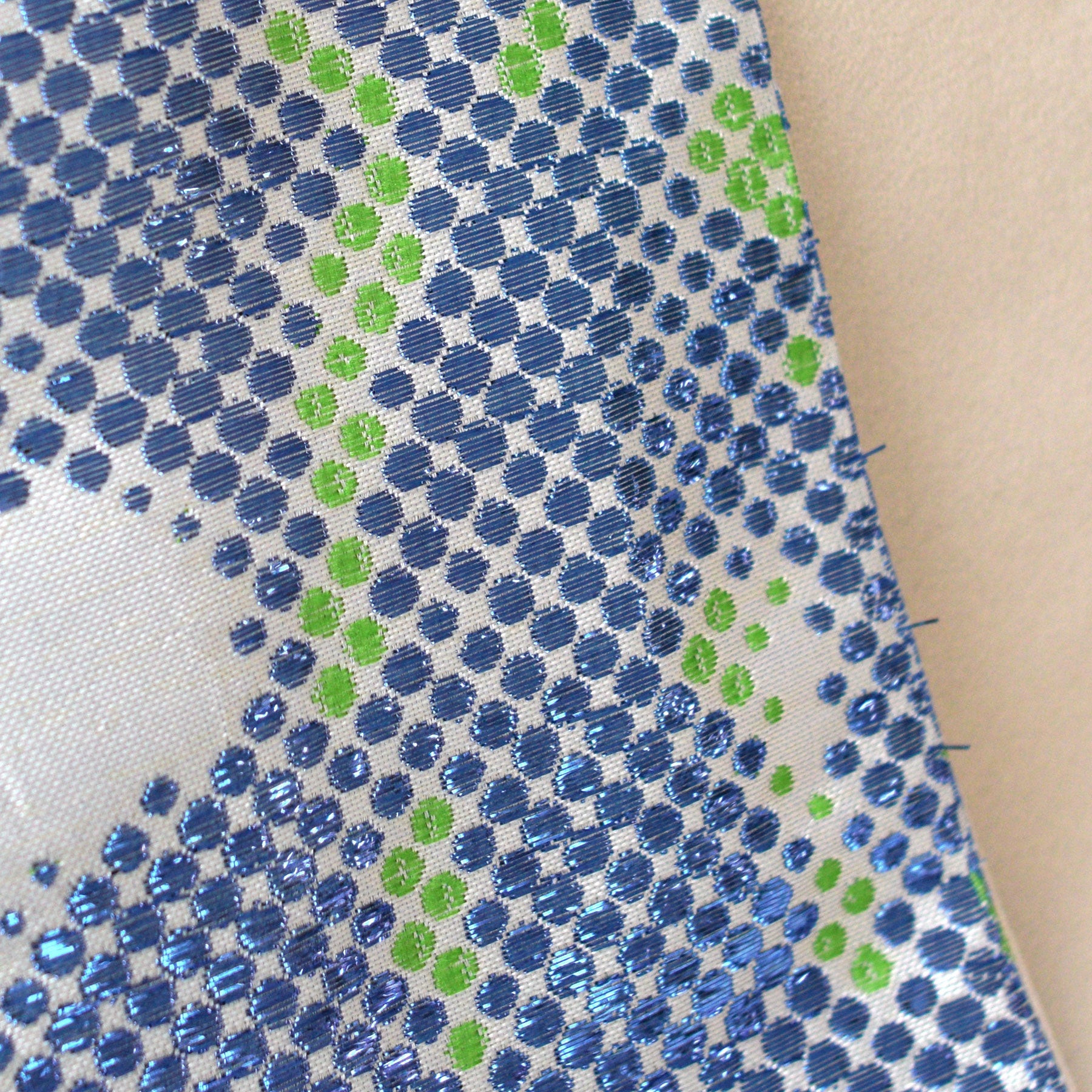 色鮮やかな蒼のラメ糸と明るい黄緑色のドット柄が