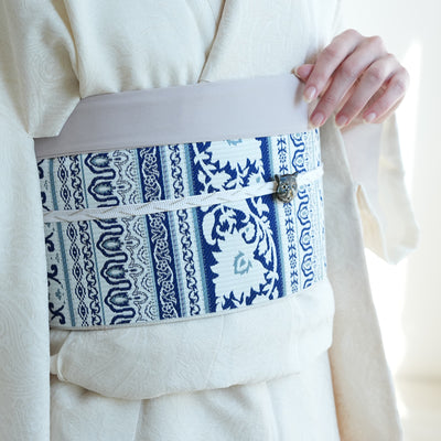 【半幅帯 博多織 インド更紗献上 ホワイト】帯単品 小袋帯 長尺 正絹 リバーシブル 日本製 本場筑前博多織 紋小巾袋帯 証紙付き(5279625400)