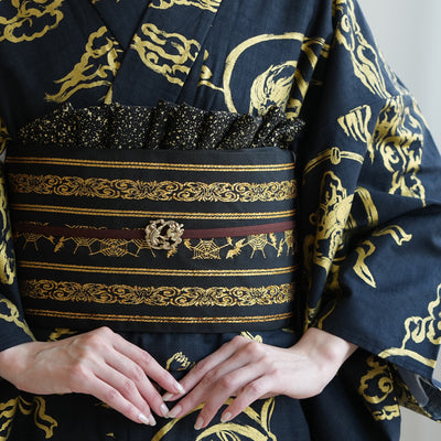 【半幅帯 リバーシブル 壁画調 蜘蛛の巣】帯単品 小袋帯 長尺 日本製 細帯 オールシーズン 浴衣 紬 小紋 着物 ブラック 金(5279627400)