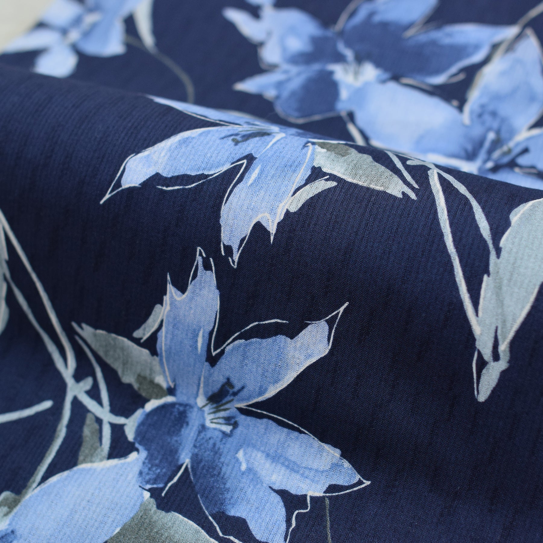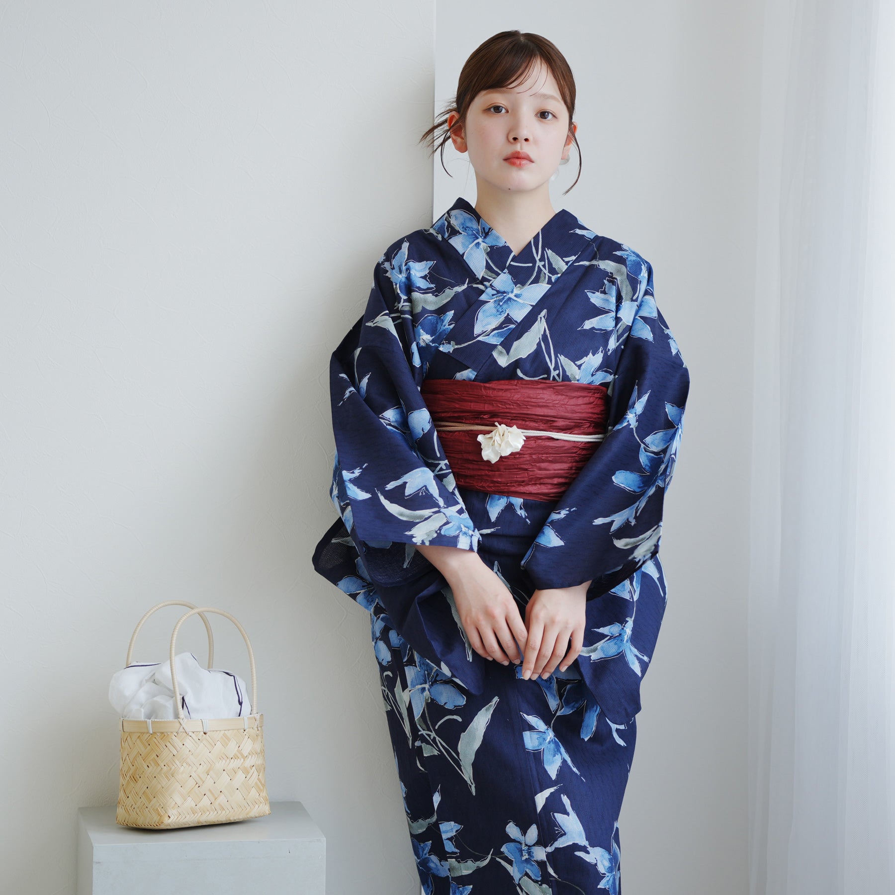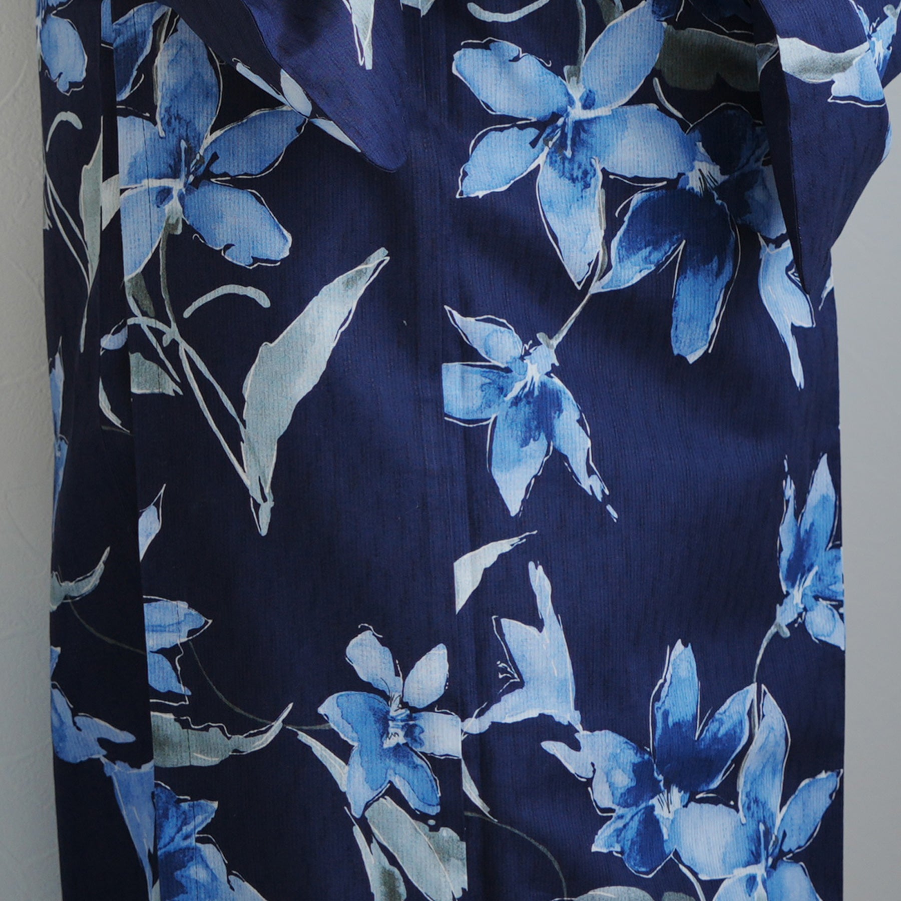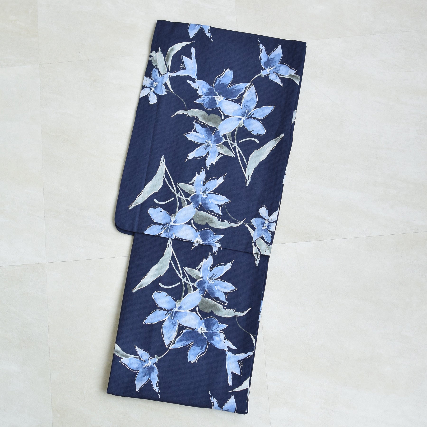 【高級変わり織 浴衣3点セット ( ゆかた・帯・下駄 ) 紺地に揺れるブルーの花】 コットン100% フリーサイズ(5010286011)
