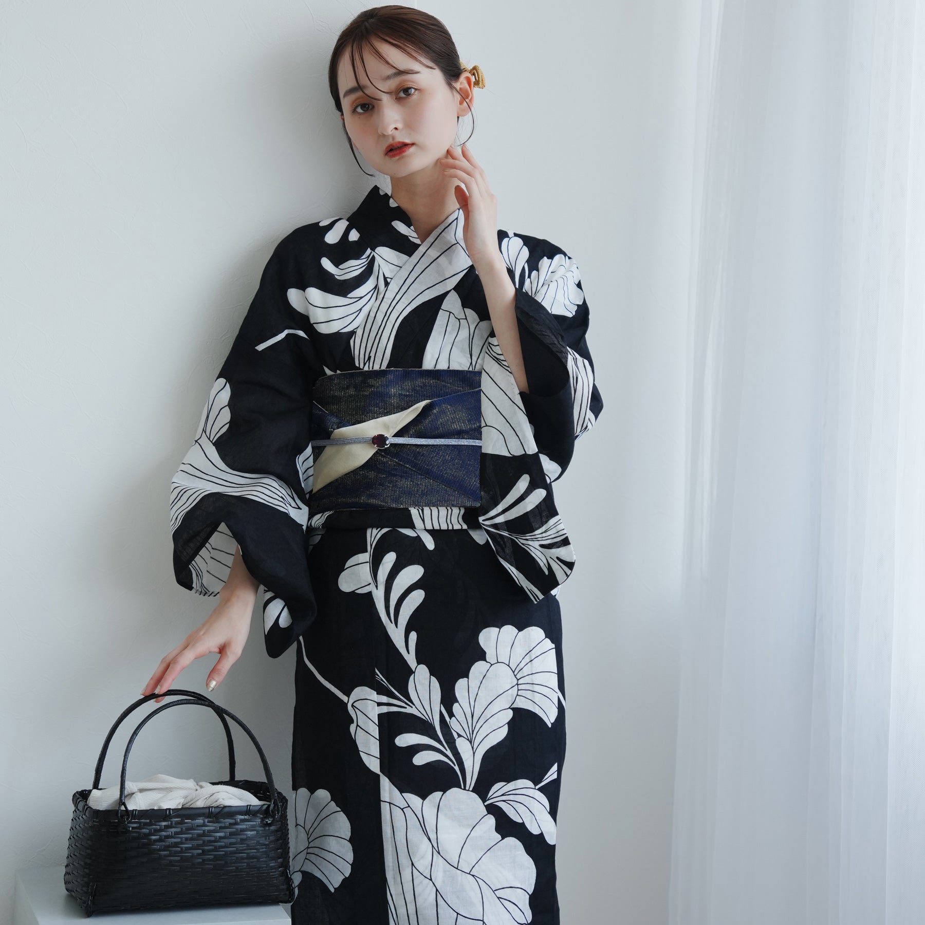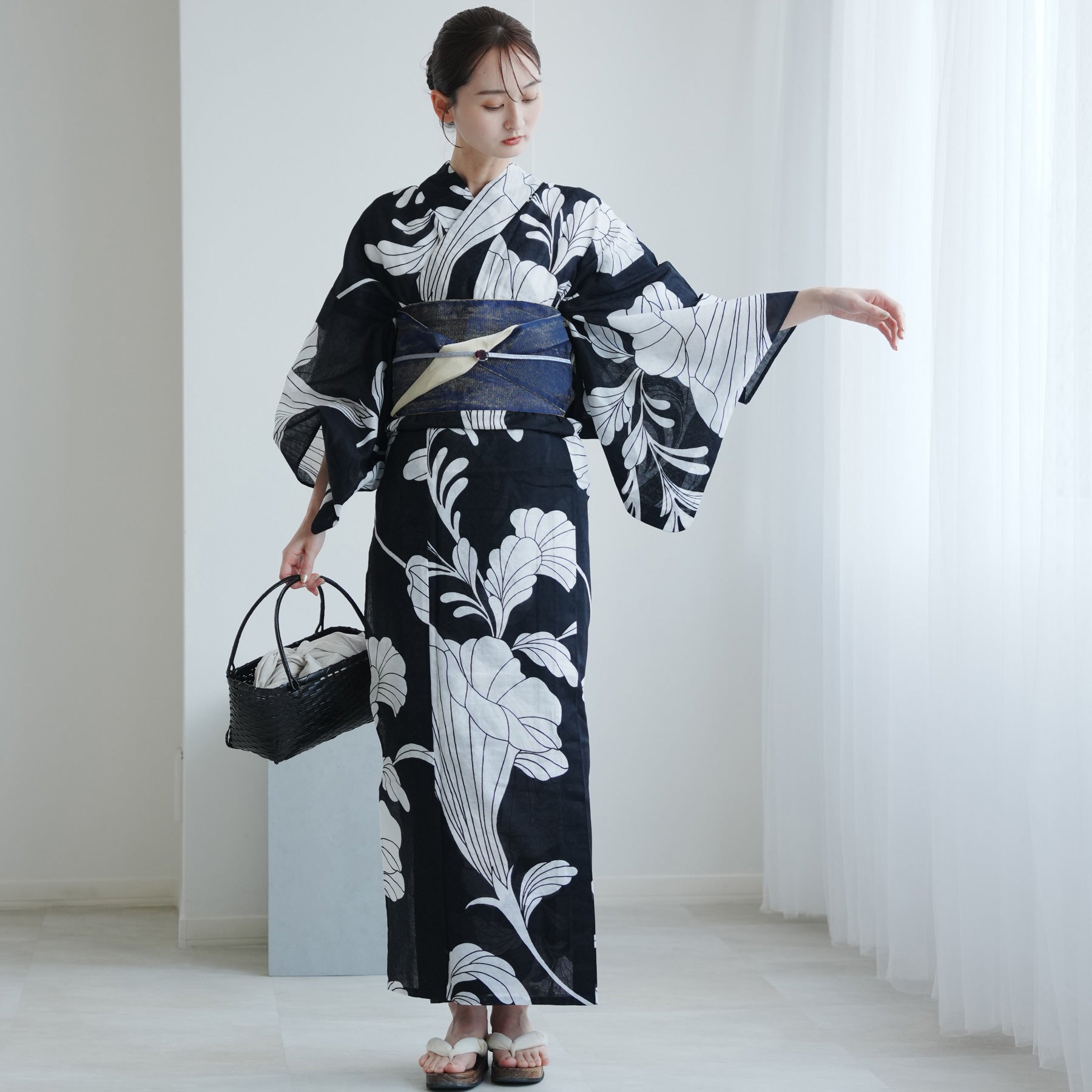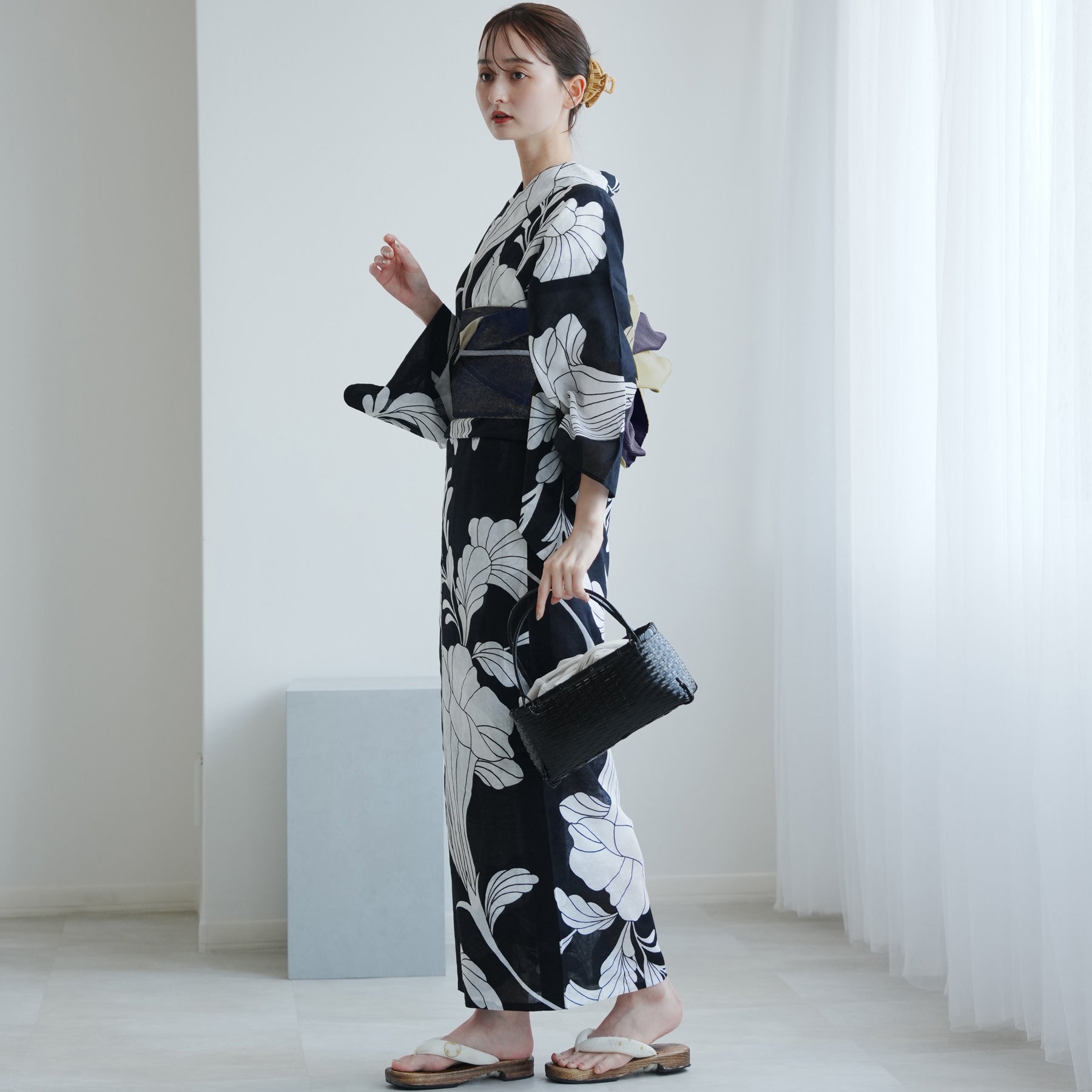 【誉田屋源兵衛  浴衣3点セット(浴衣/帯/下駄)シルエットロマンス 黒/白】日本製小幅生地使用  フリーサイズ 手縫い併用国内縫製(5010289112)