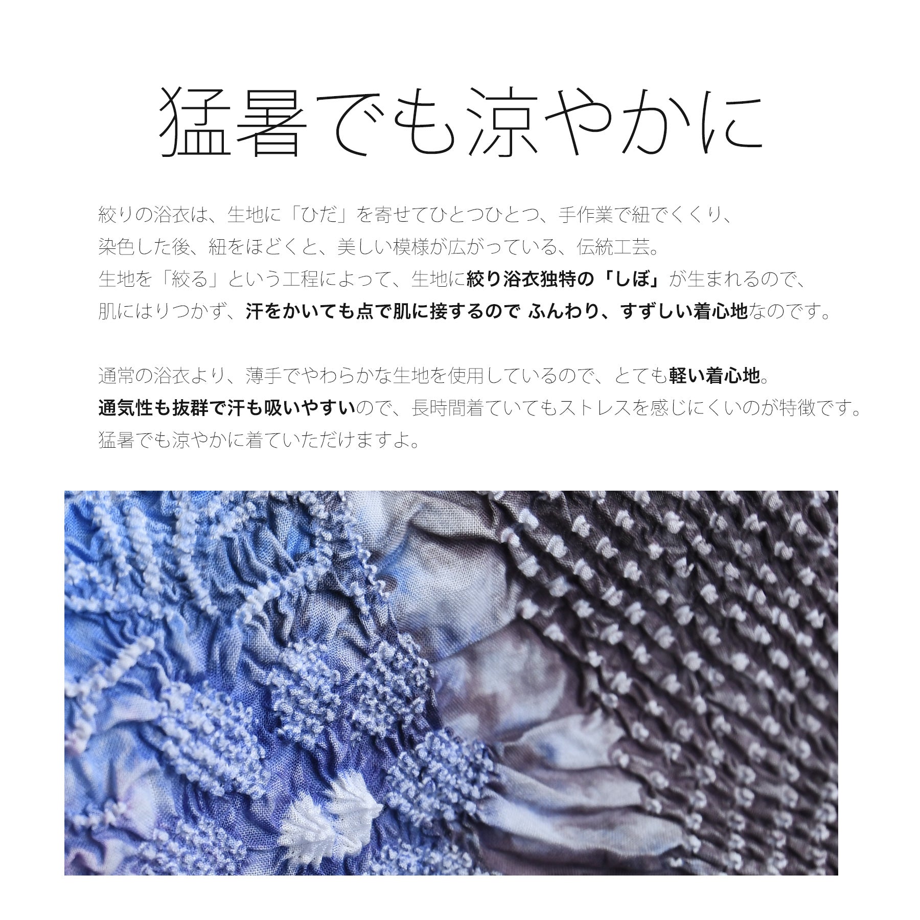 有松絞りの凹凸が肌に張りつかず、風が通ります。
