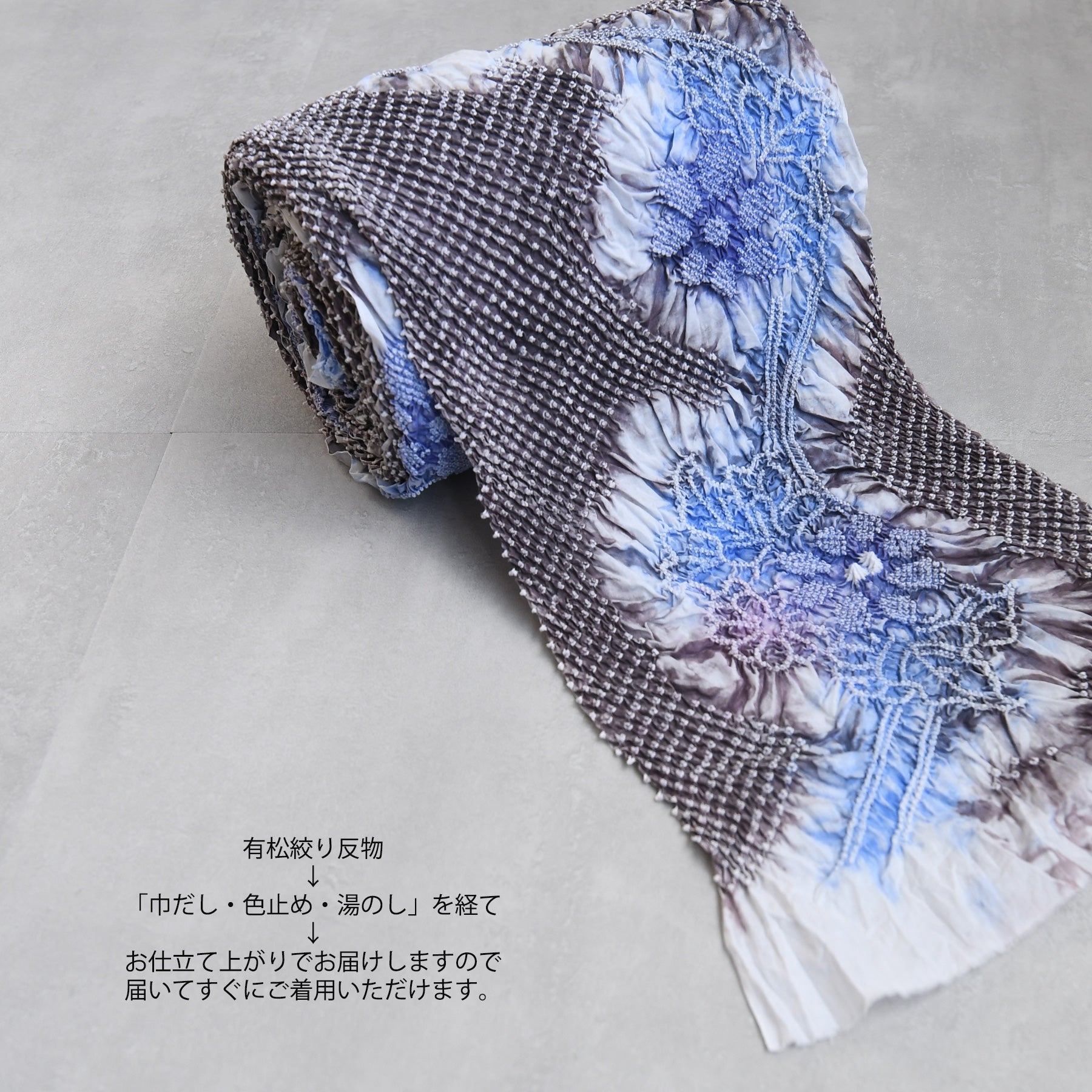 こちらは、日本の伝統工芸 有松絞り を用いて染め上げた浴衣。