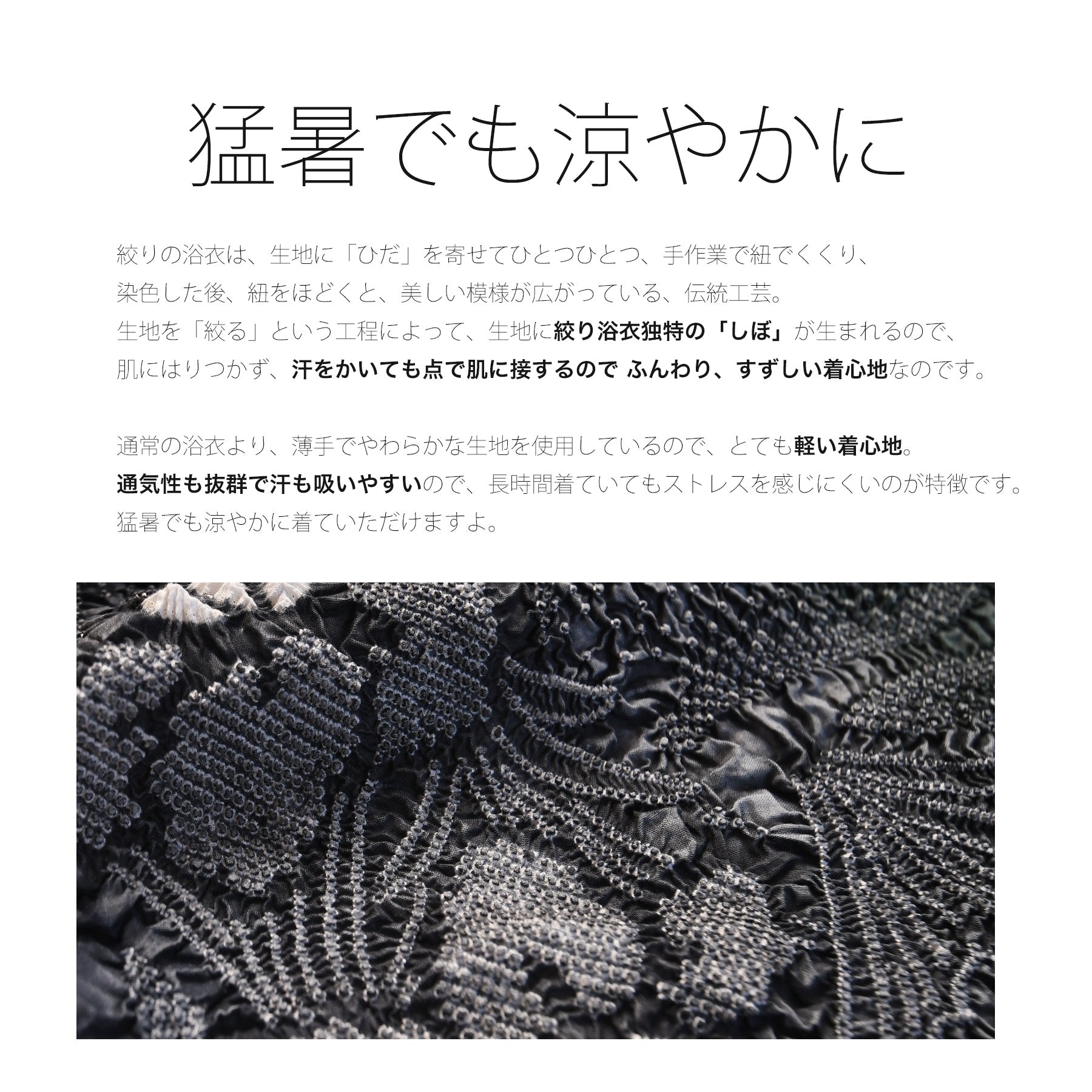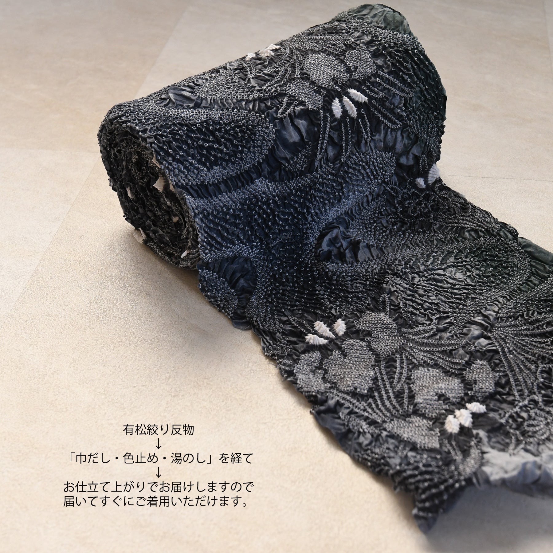 墨のような深い地色に、月明かりを浴びて浮かび上がる菖蒲の花が、ミステリアスで気高い美しさを放ちます。国内の熟練和裁士が手縫い併用で仕立てることで、絞り生地特有の伸縮性を最大限に活かした、吸い付くような極上のフィット感を実現しました。