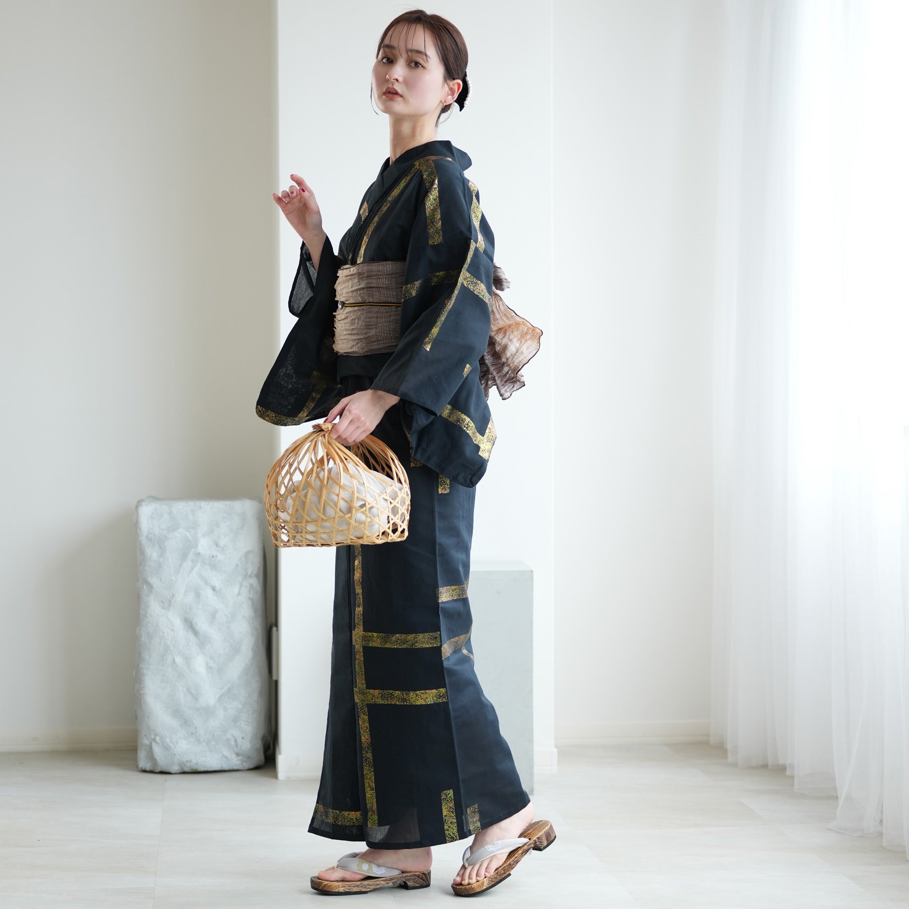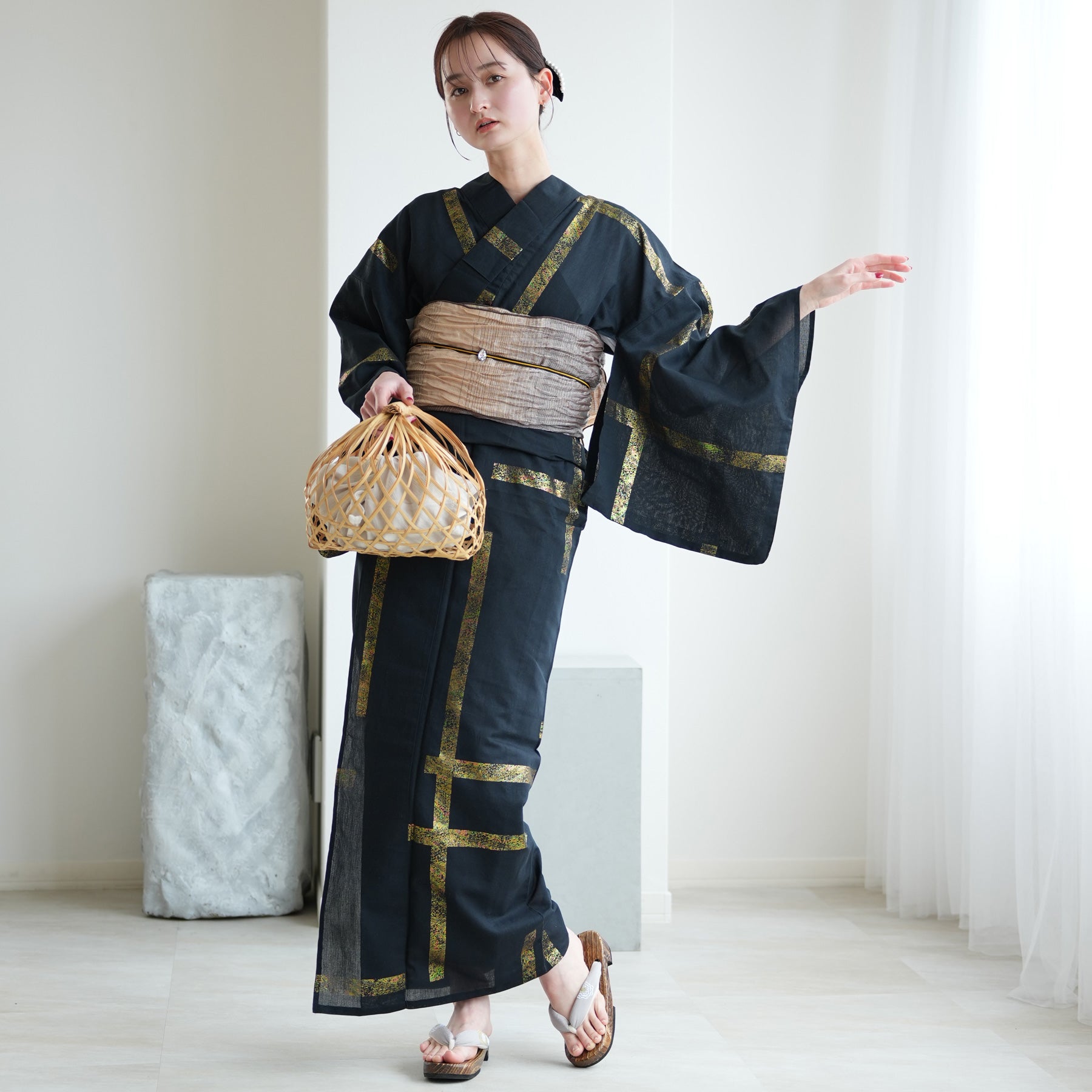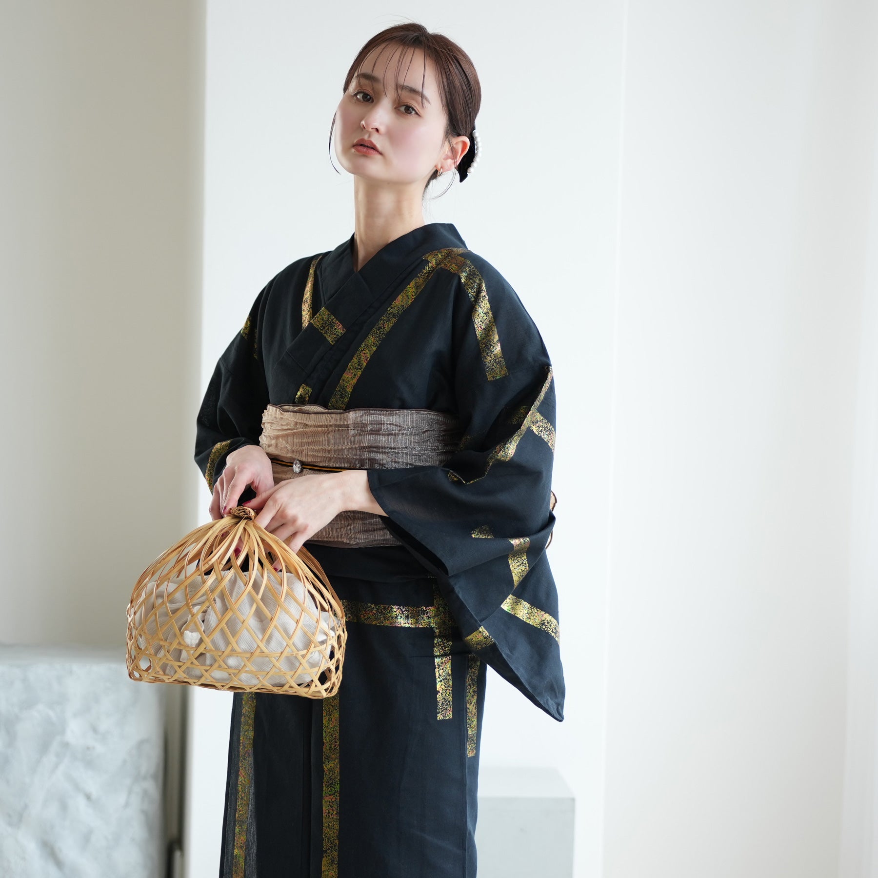 帯締めには、あえて存在感のある黒や銀の飾りを選び、全体を「作品」のように構築するのがおすすめ。足元は白足袋で夏着物として完成させ、ヘアスタイルはミニマルにまとめて、浴衣の意匠を主役にしてください。