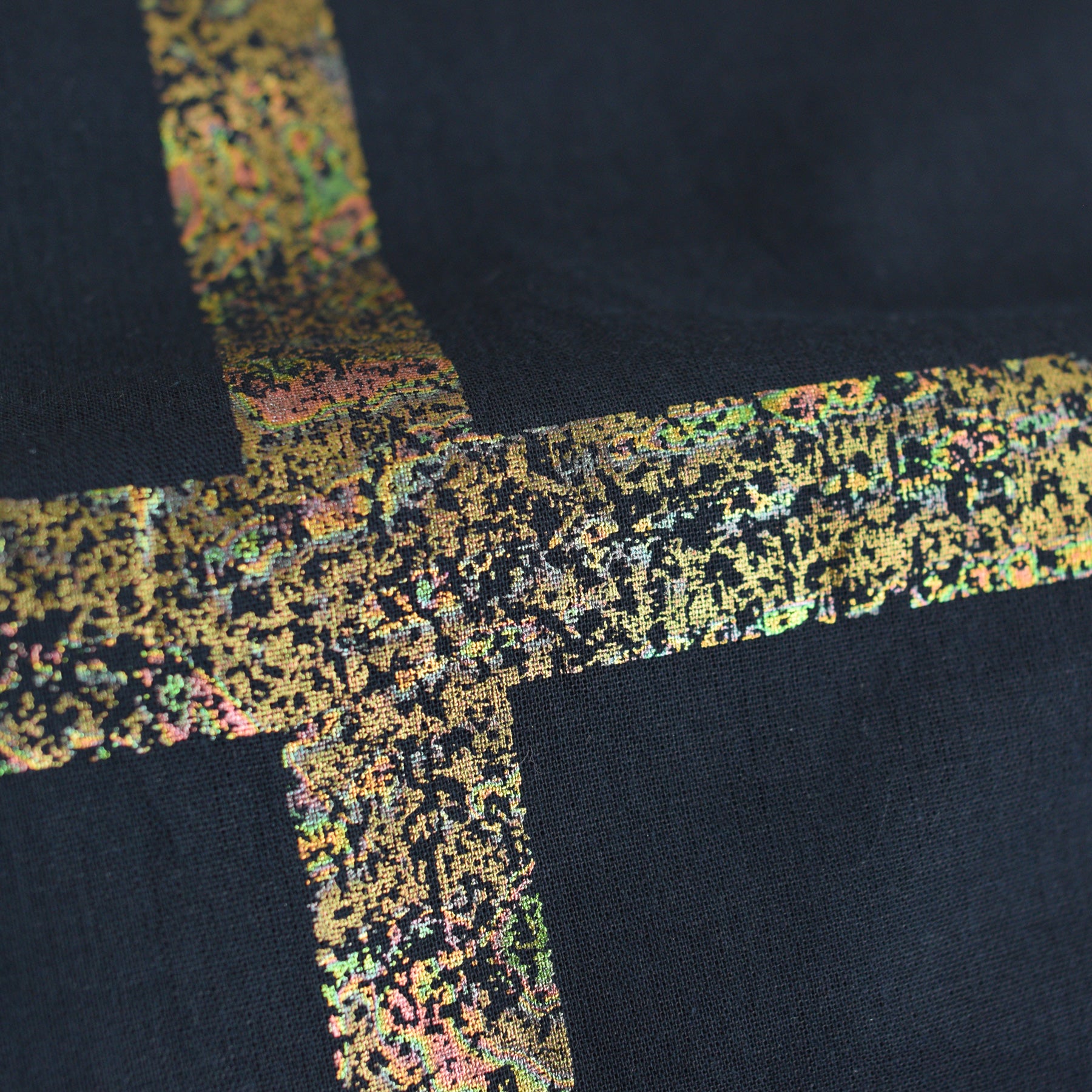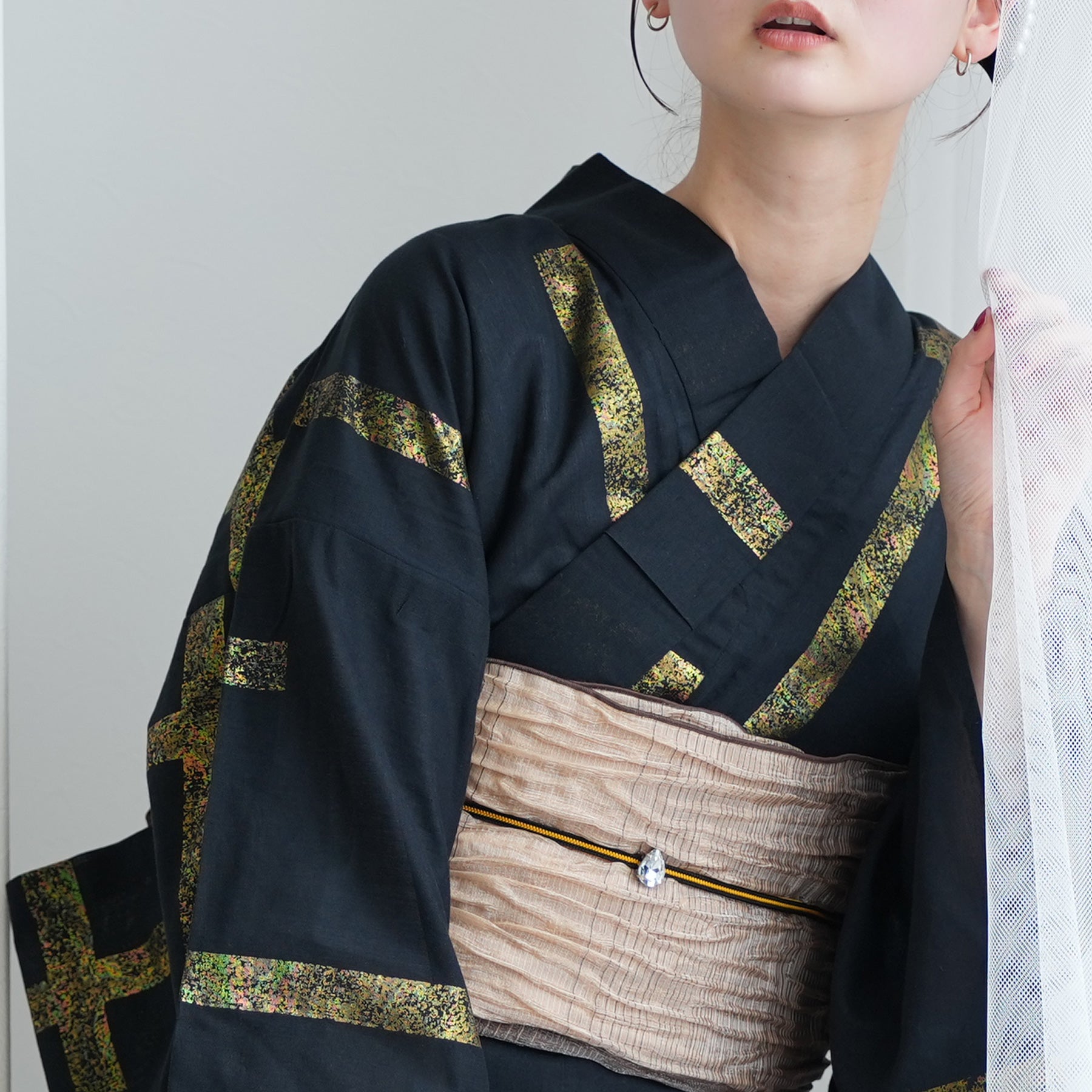 帯の老舗、誉田屋源兵衛の真骨頂ともいえるのが、この「破れ格子V箔」です。江戸時代から続く「破れ格子」の文様を、山口源兵衛氏の感性でダイナミックに再構築。漆黒の地に打ち込まれた貝箔の黄金のラインは、見る角度によって生命力あふれる輝きを放ちます。