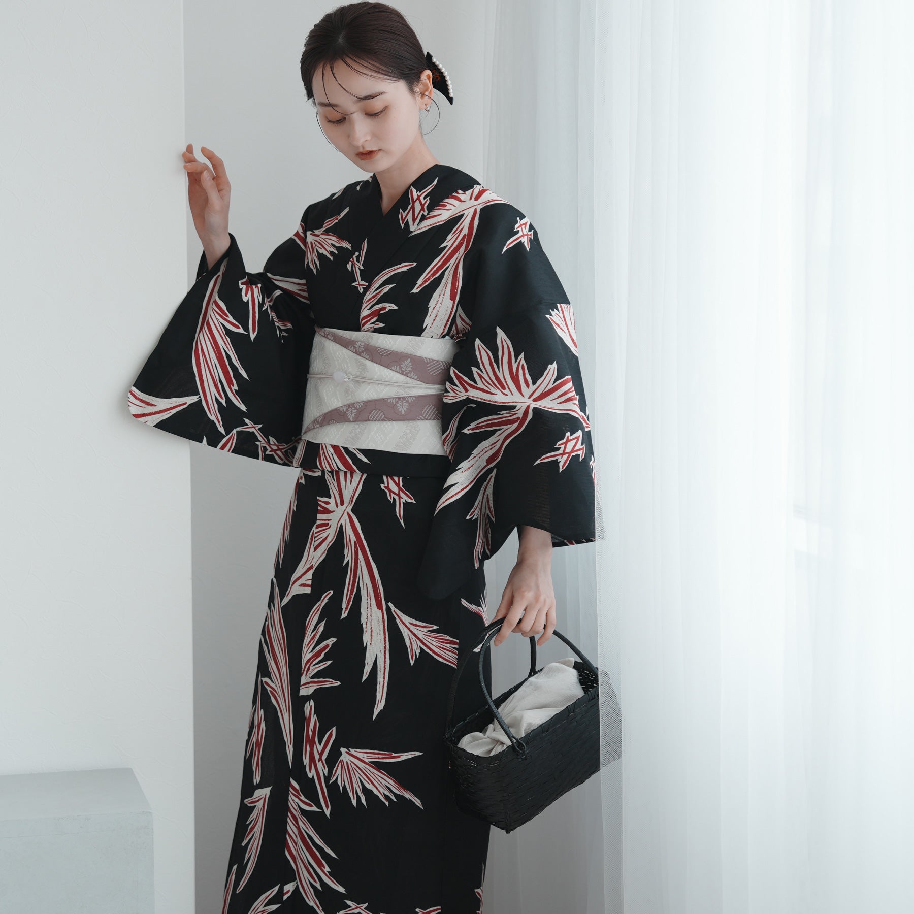 黒地の浴衣は重くなりがちですが、赤と白のモチーフと余白が抜け感を作ってくれるので、