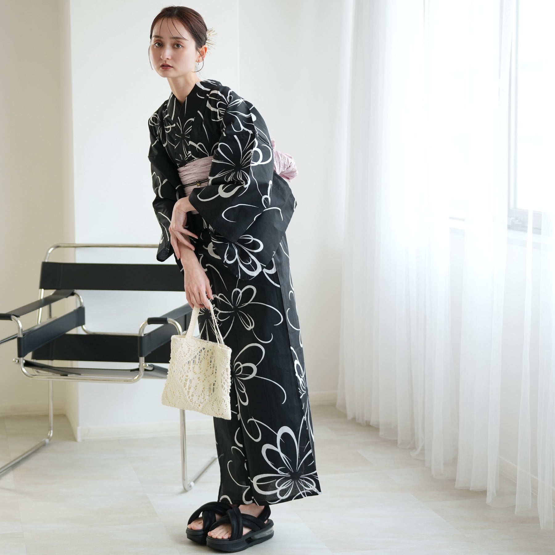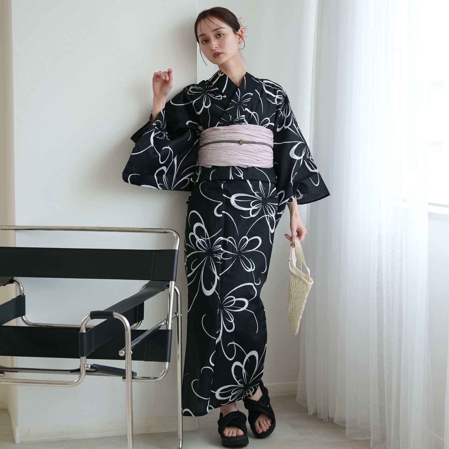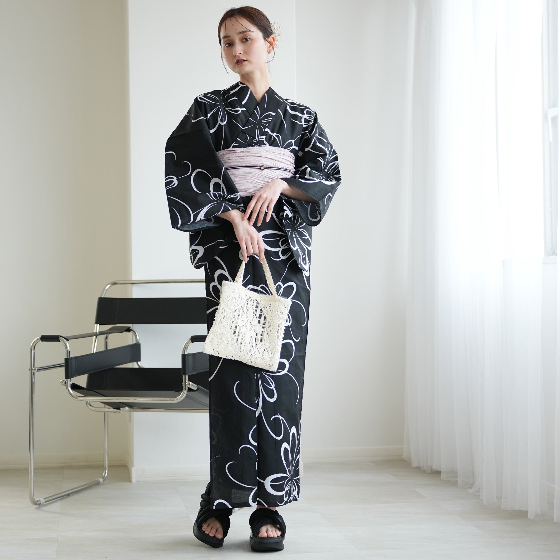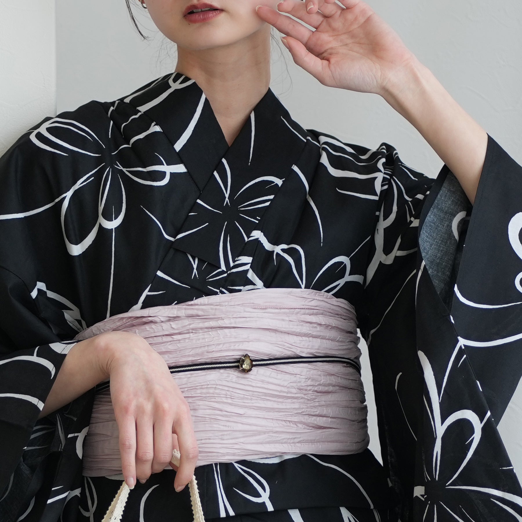 デフォルメされた白菊のモダンな柄行きに、帯のニュアンスカラーが加わることで、知的な色香を醸し出します。サンダル合わせを前提とした、ミニマルな2点セット。