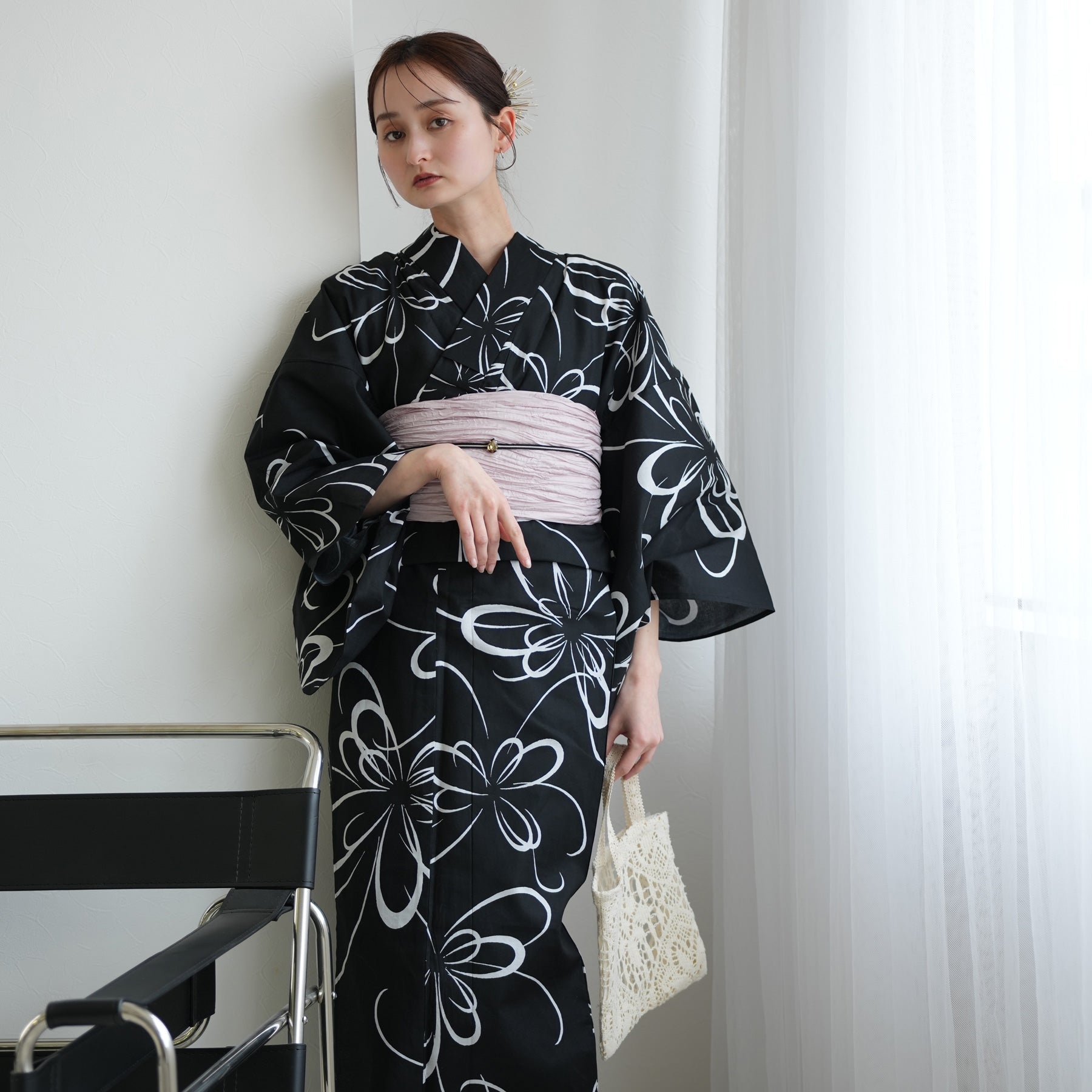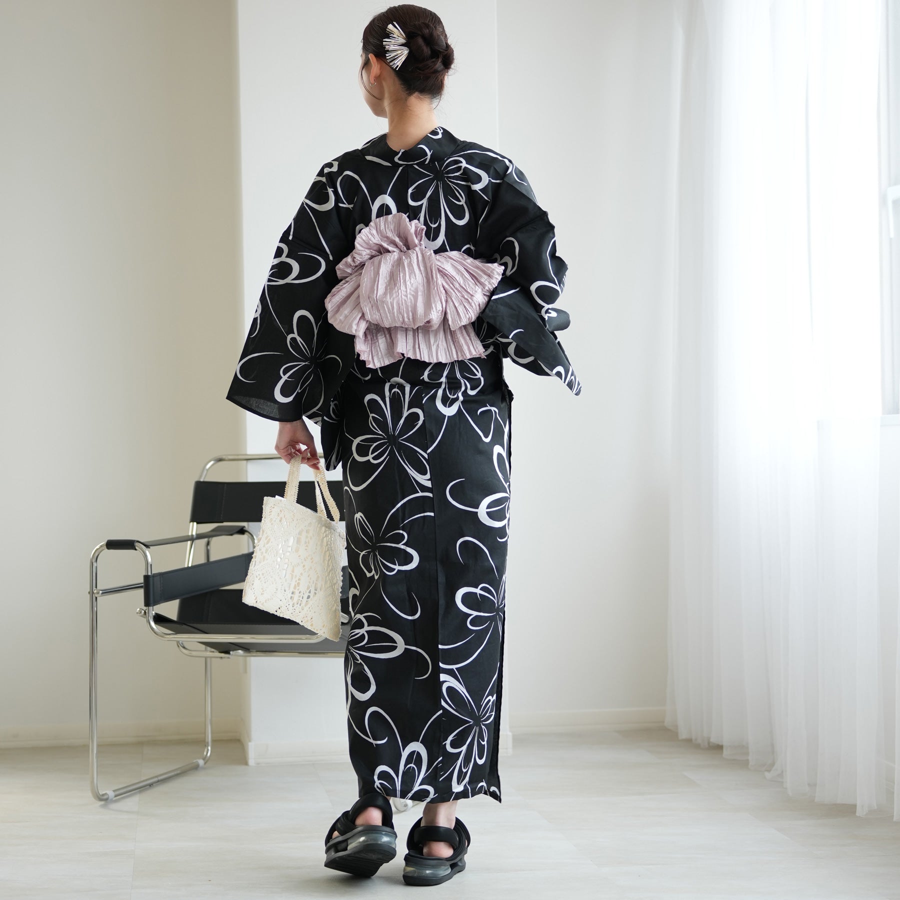 強さを感じさせる黒地の浴衣に、儚げなスノーラベンダーの兵児帯。