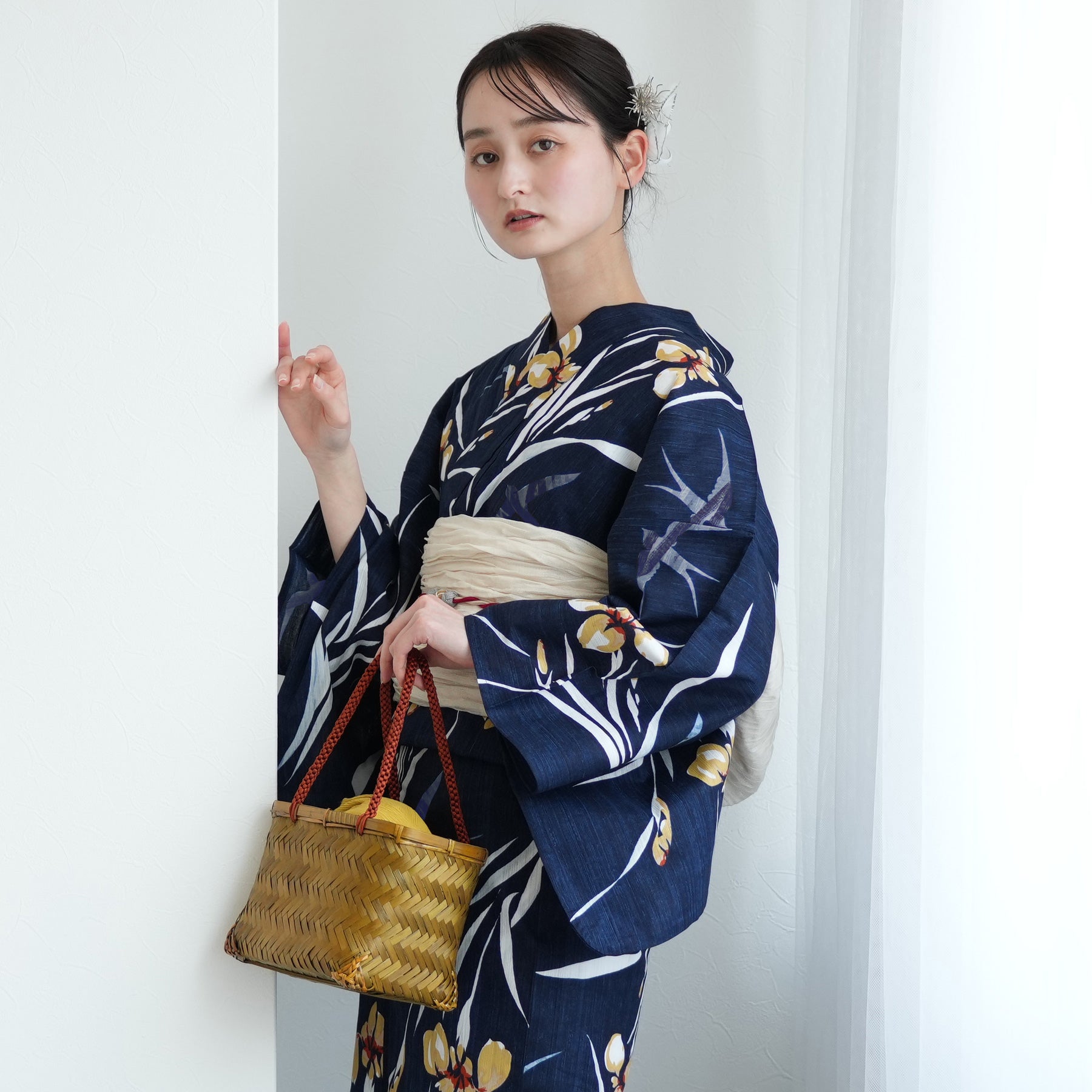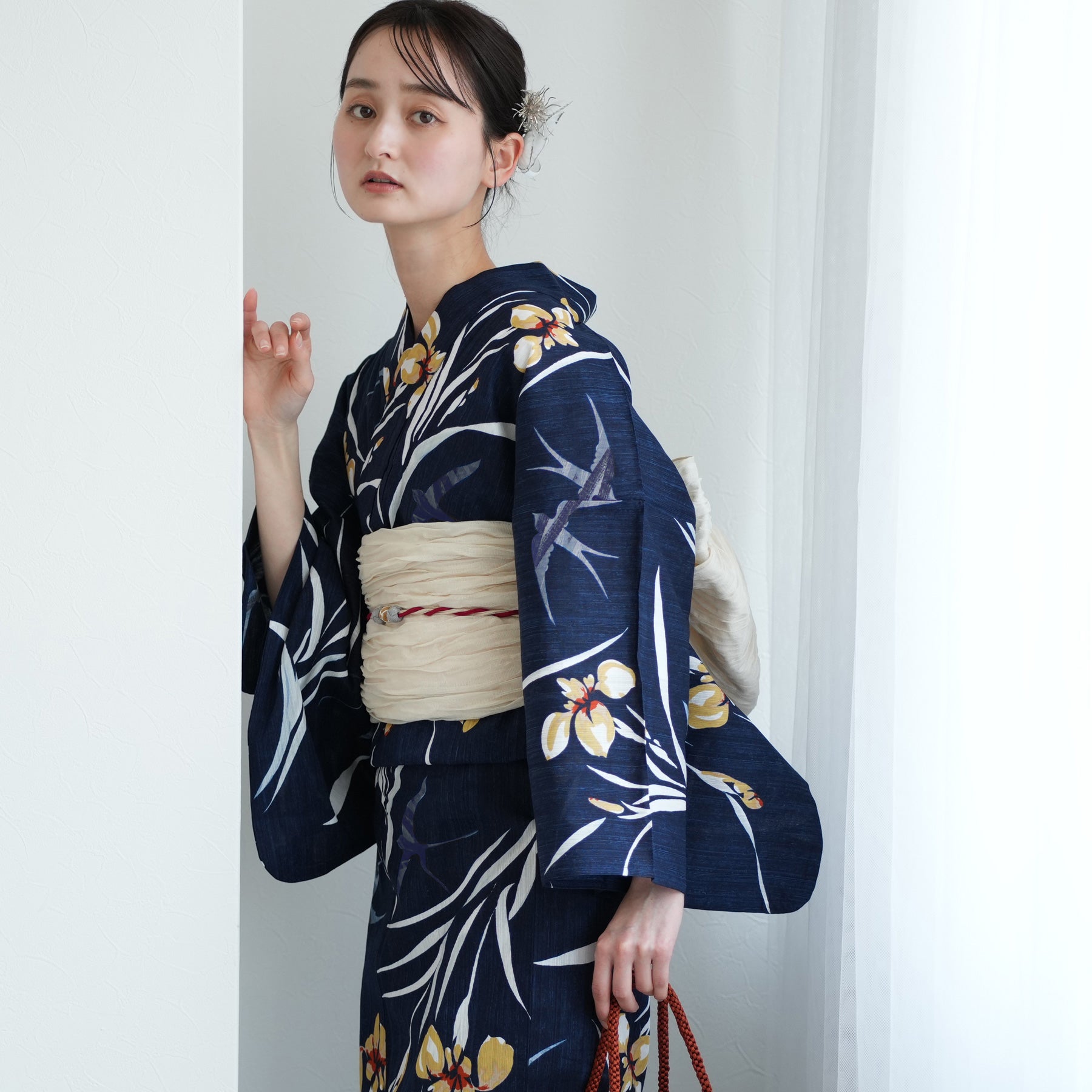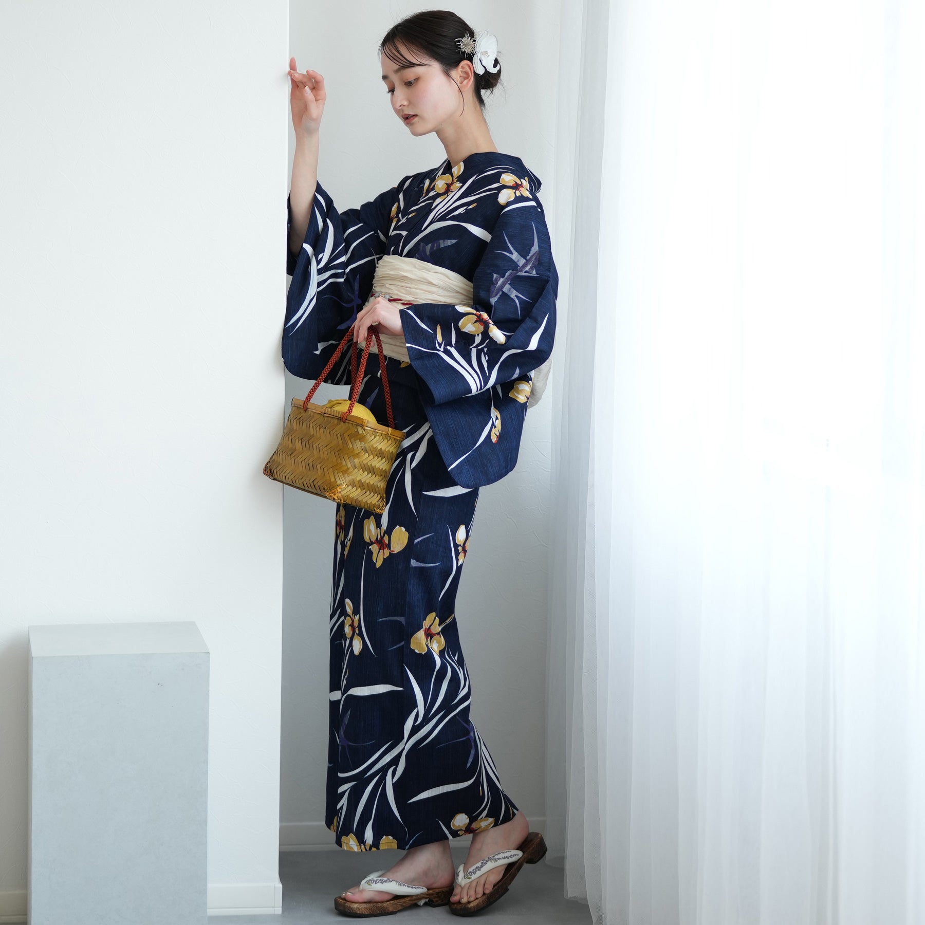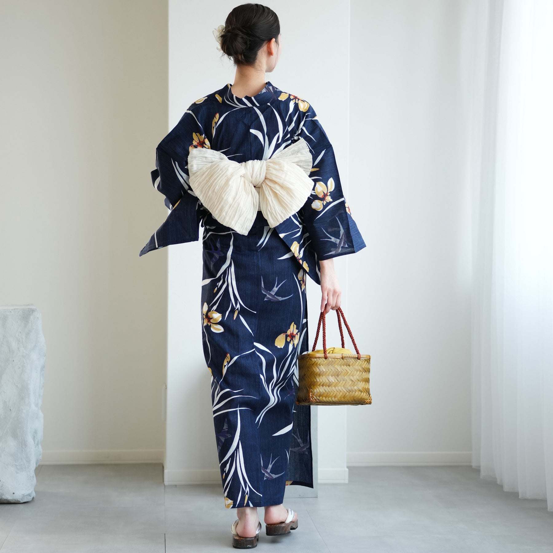 【ニコアンティーク 高級変わり織 浴衣3点セット ( ゆかた・帯・下駄 ) 紺地に菖蒲とつばめ】 フリーサイズ 国産生地 国内染色 個性派きもの(5010282911)