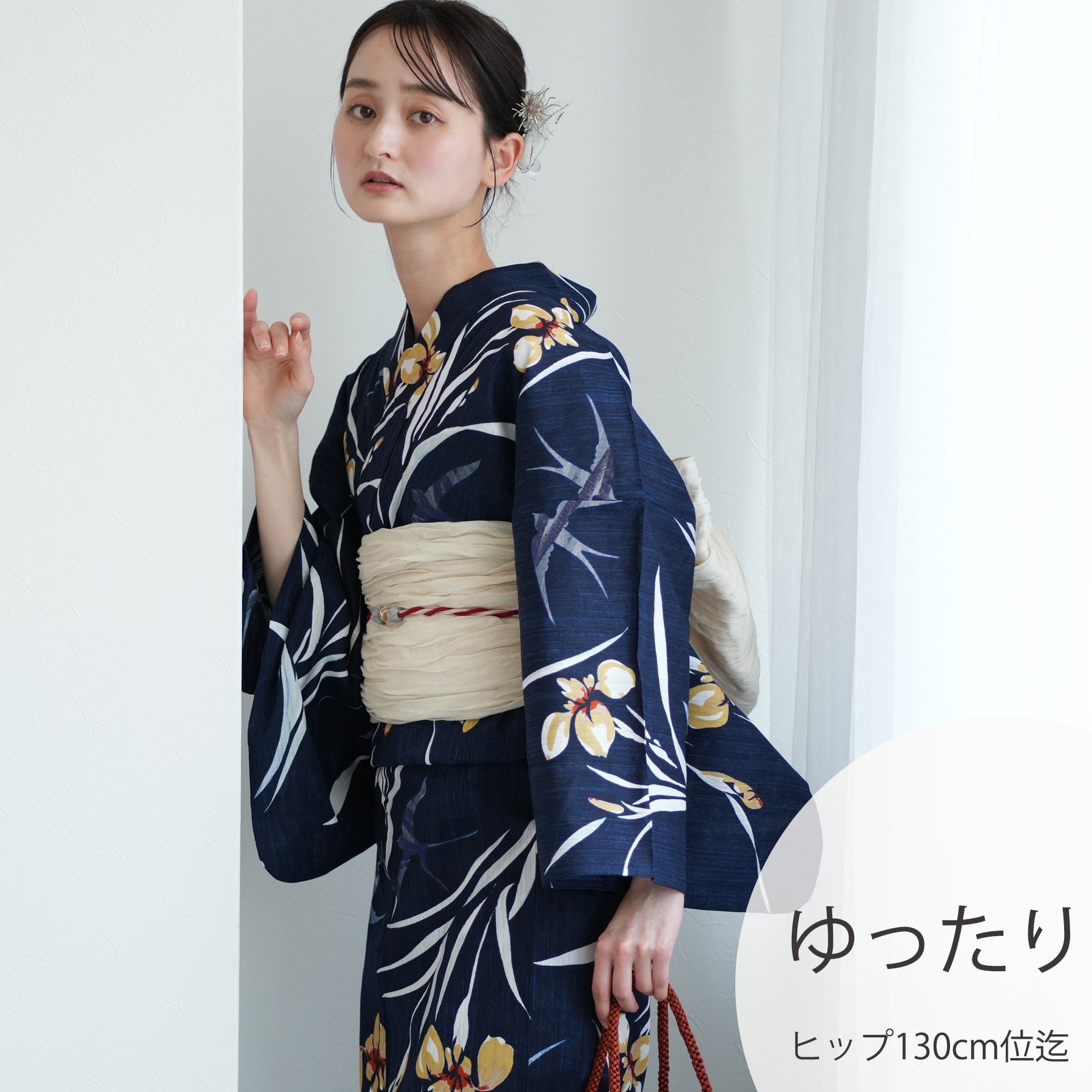 【ニコアンティーク 高級変わり織 浴衣3点セット ( ゆかた・帯・下駄 ) 紺地に菖蒲とつばめ】 3Lサイズ(ヒップ約130cm位まで対応)国産生地 国内染色 個性派きもの(5013282911)