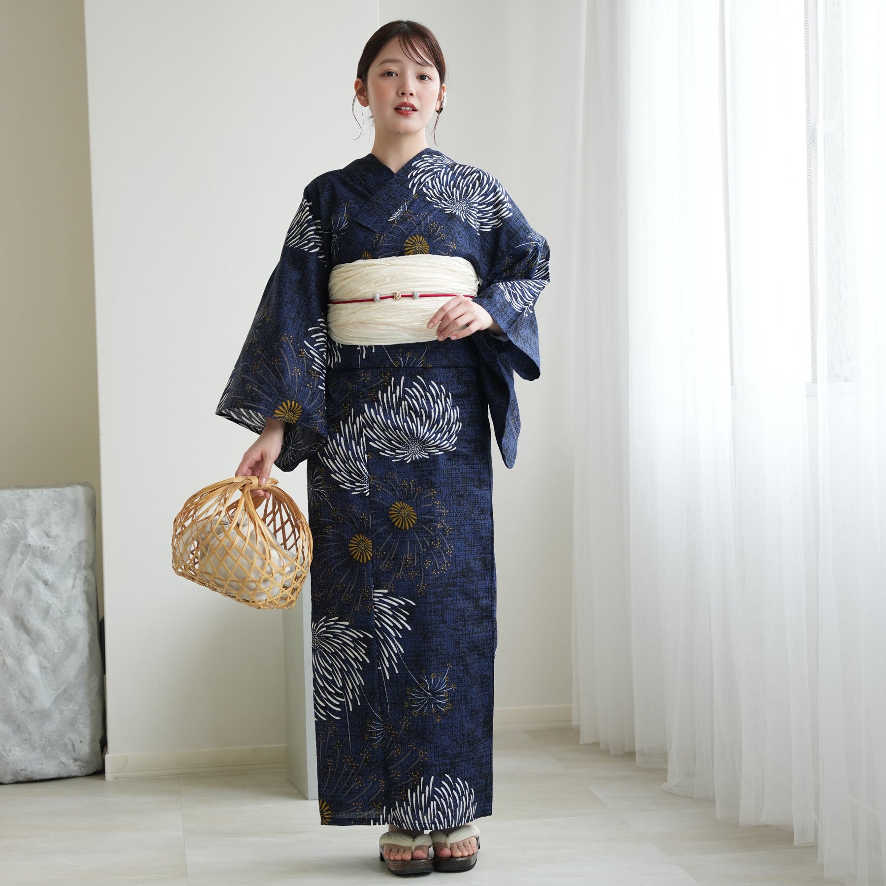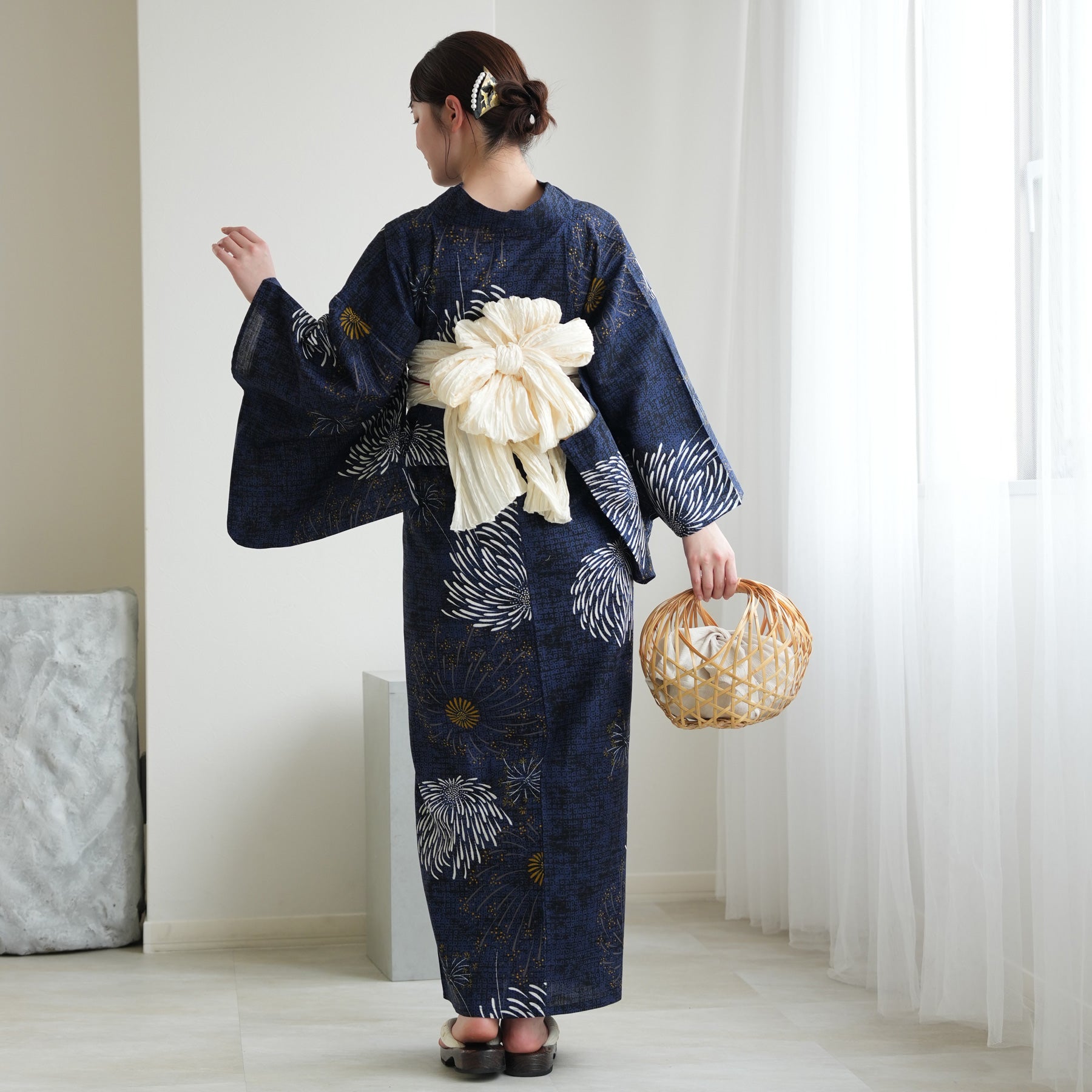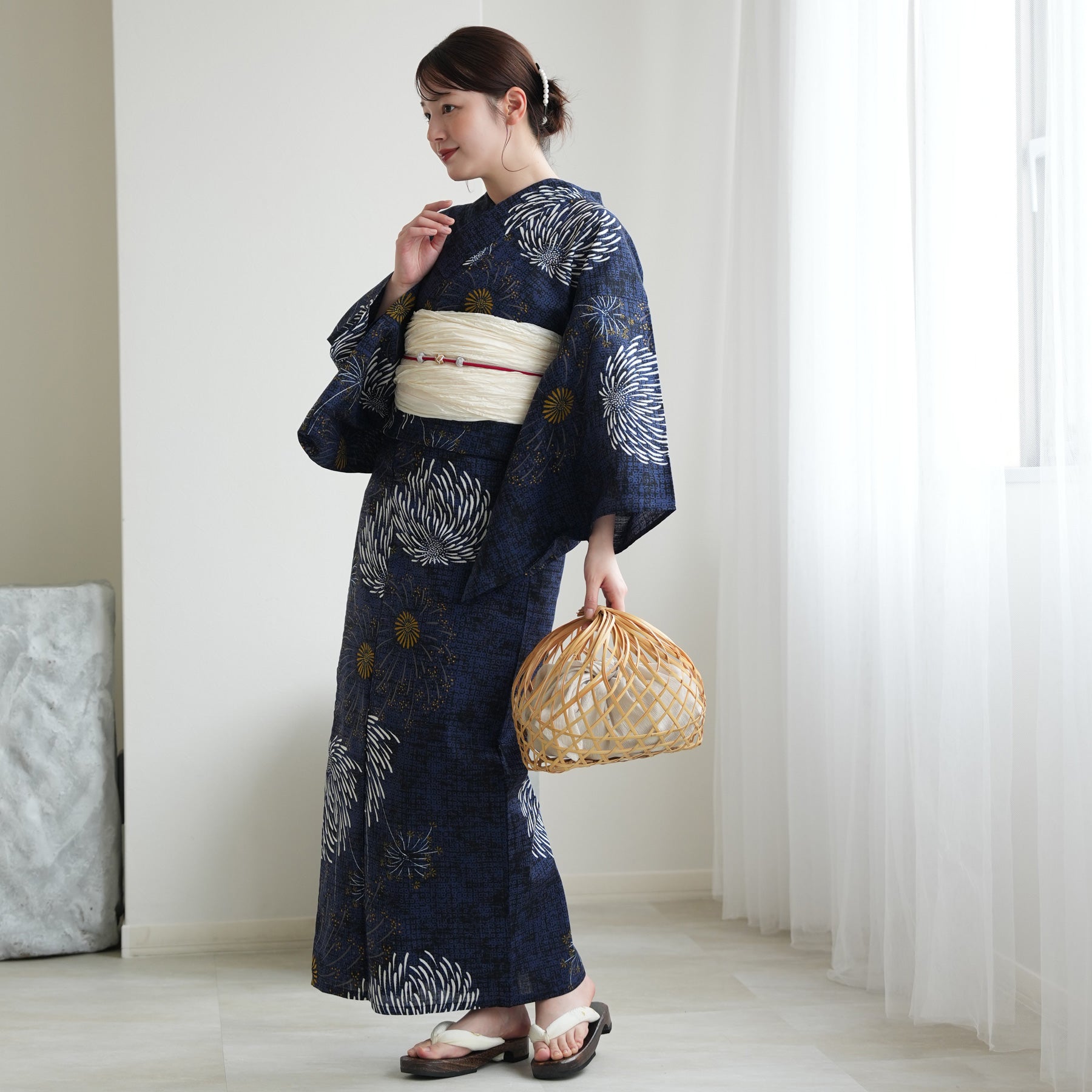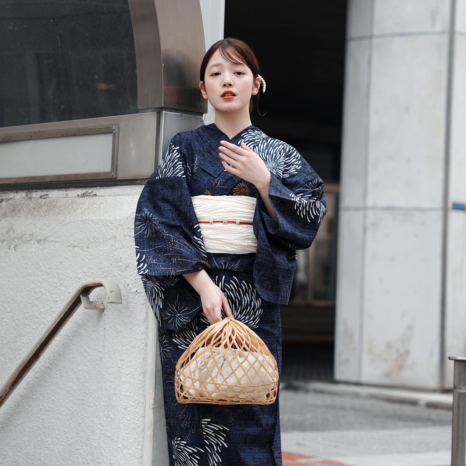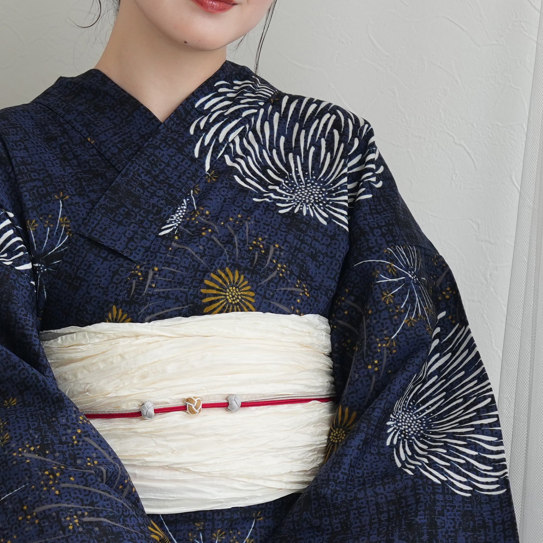 帯には清潔感あふれる白を差し色に。凛としたネイビーとのコントラストが、まとう人の透明感を引き立てます。