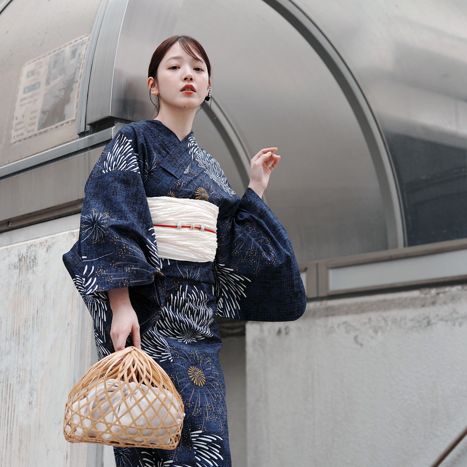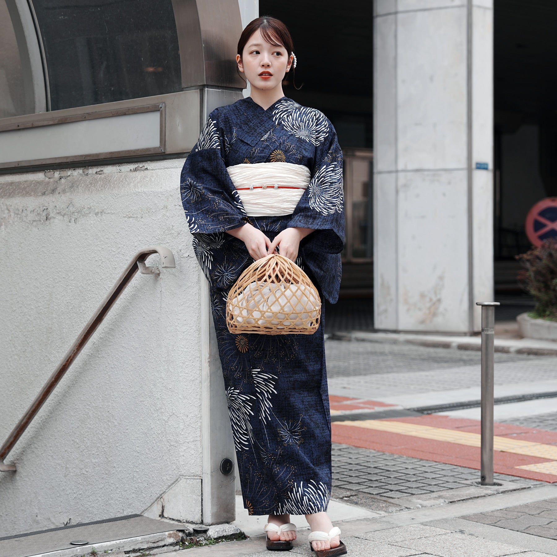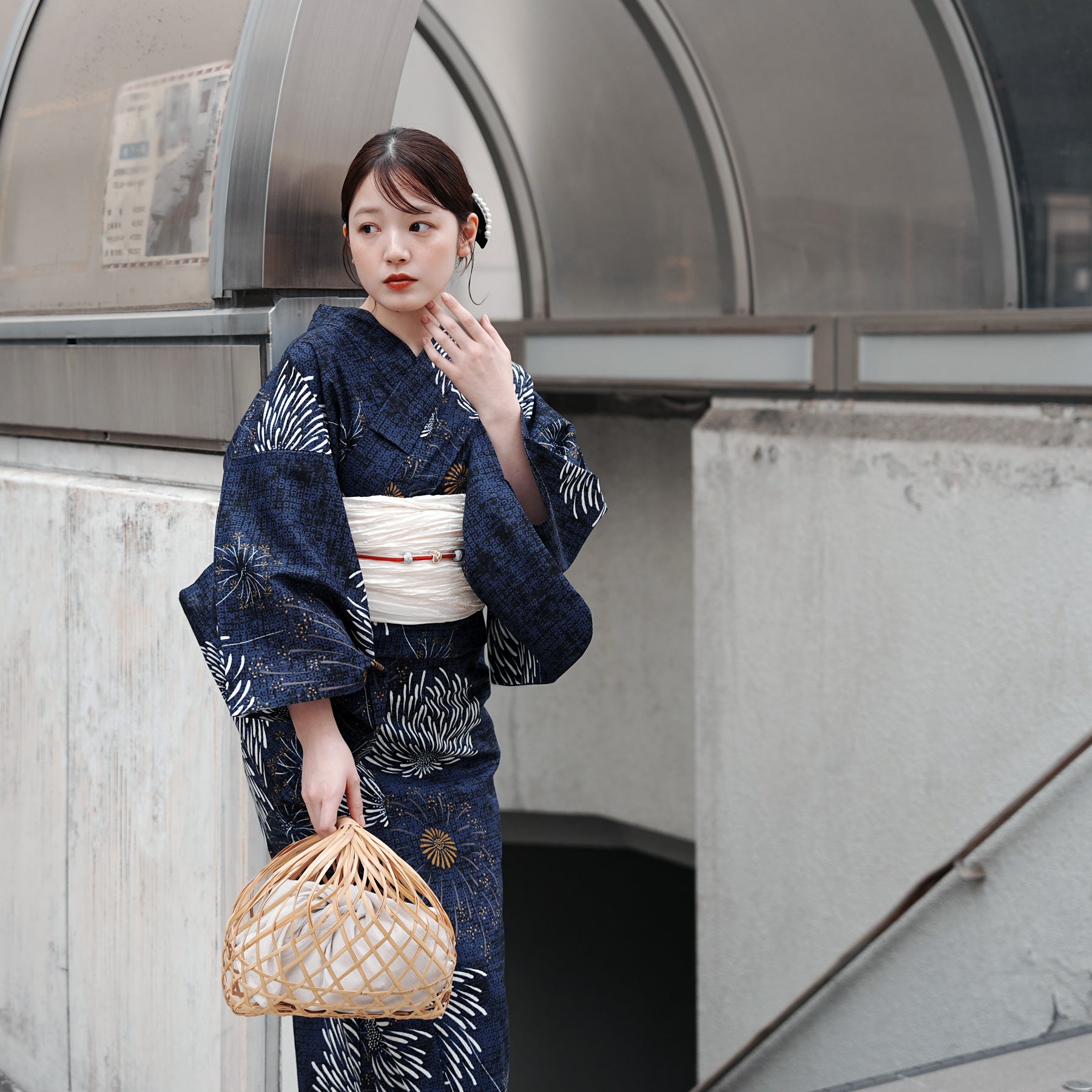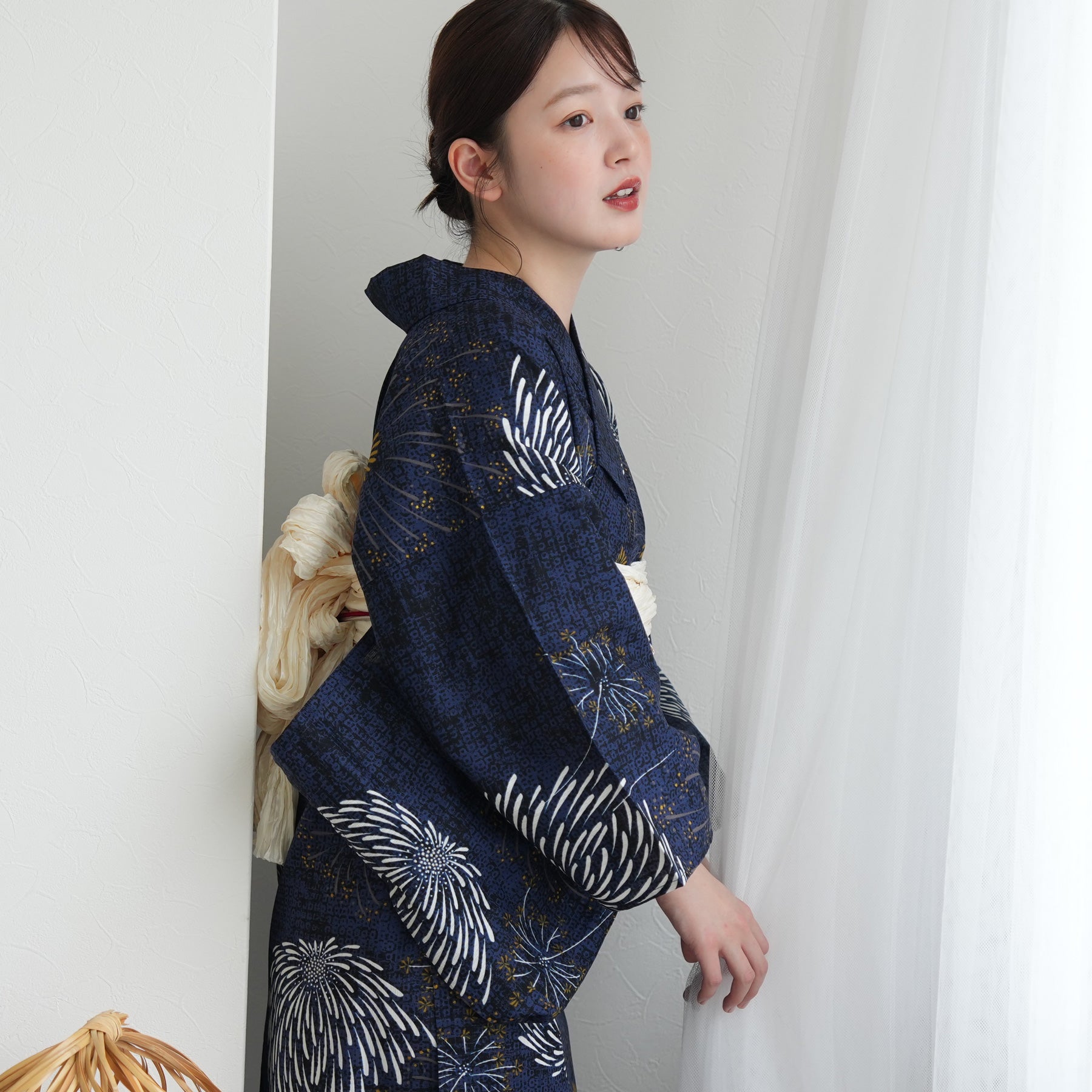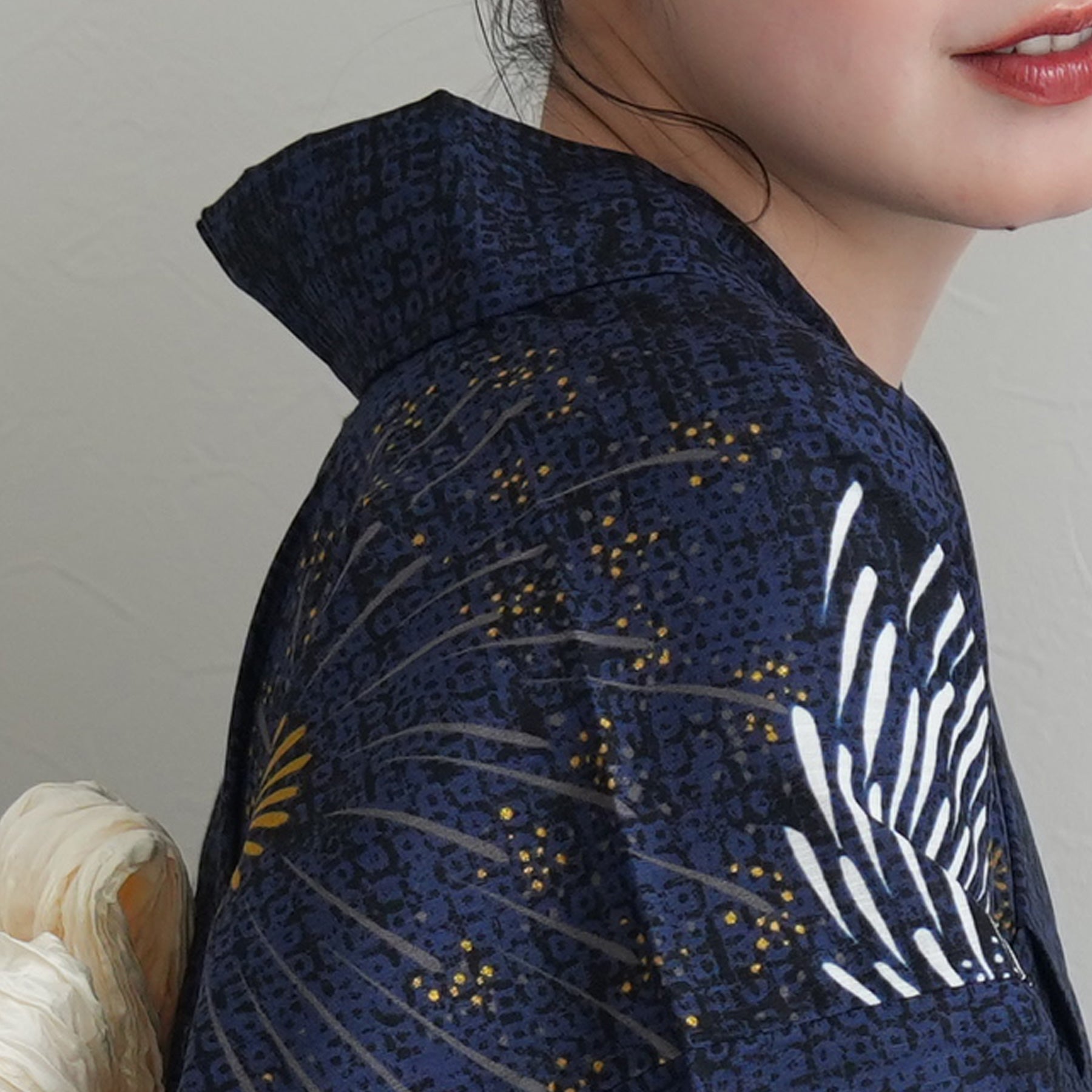 帯には清潔感あふれる白を差し色に。凛としたネイビーとのコントラストが、まとう人の透明感を引き立てます。