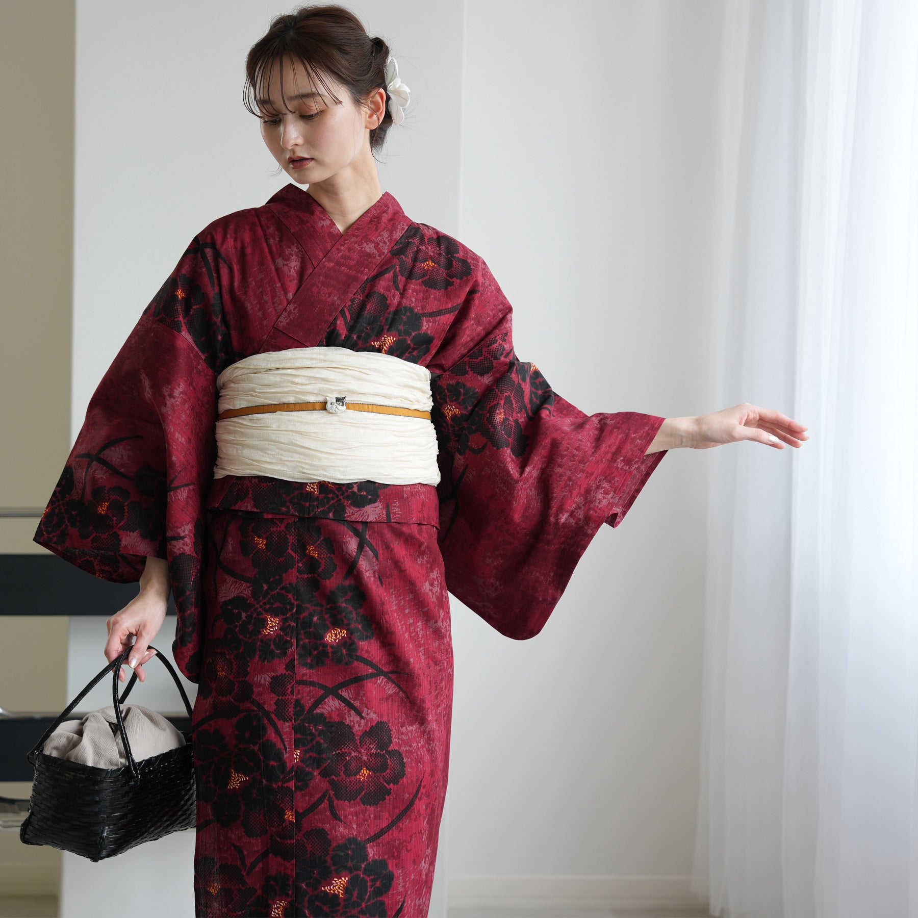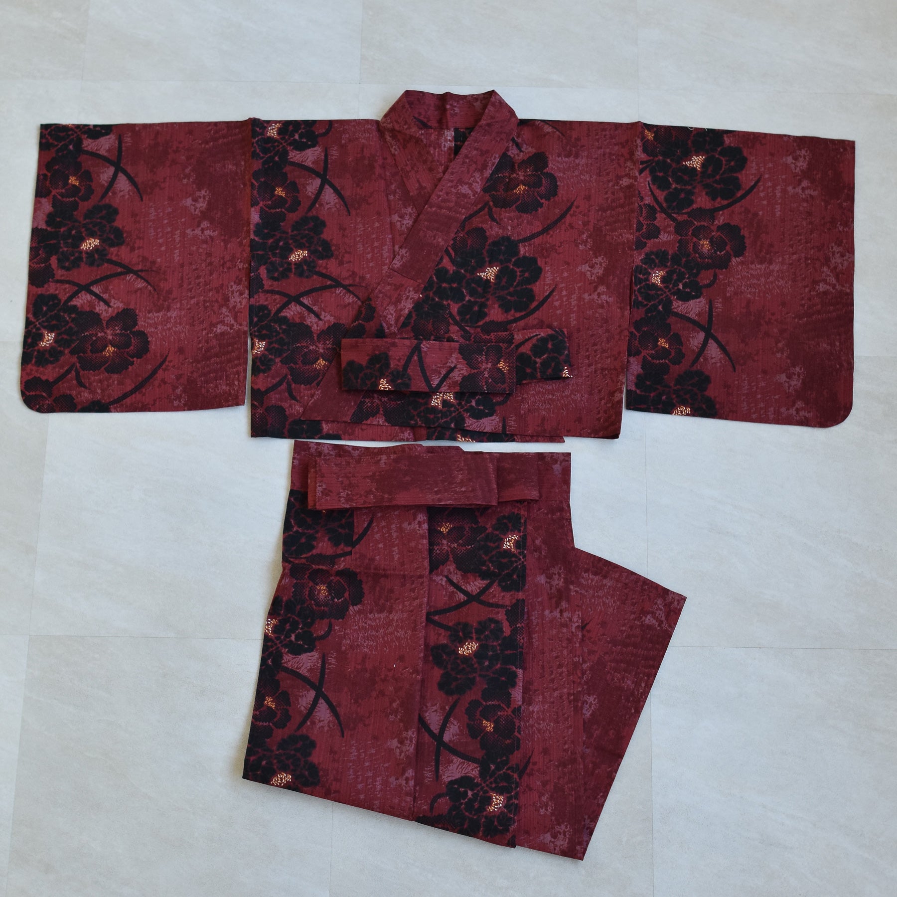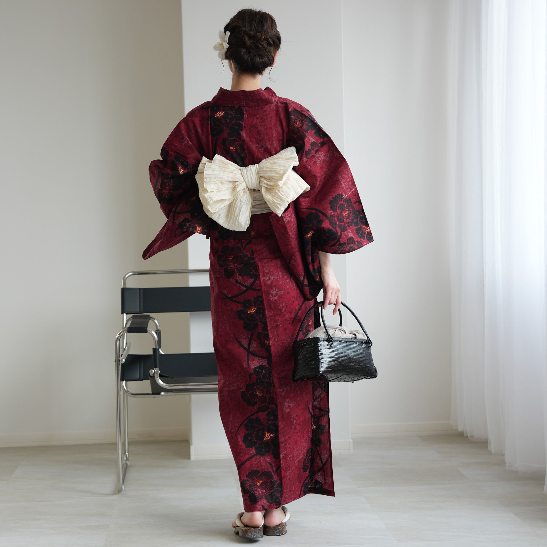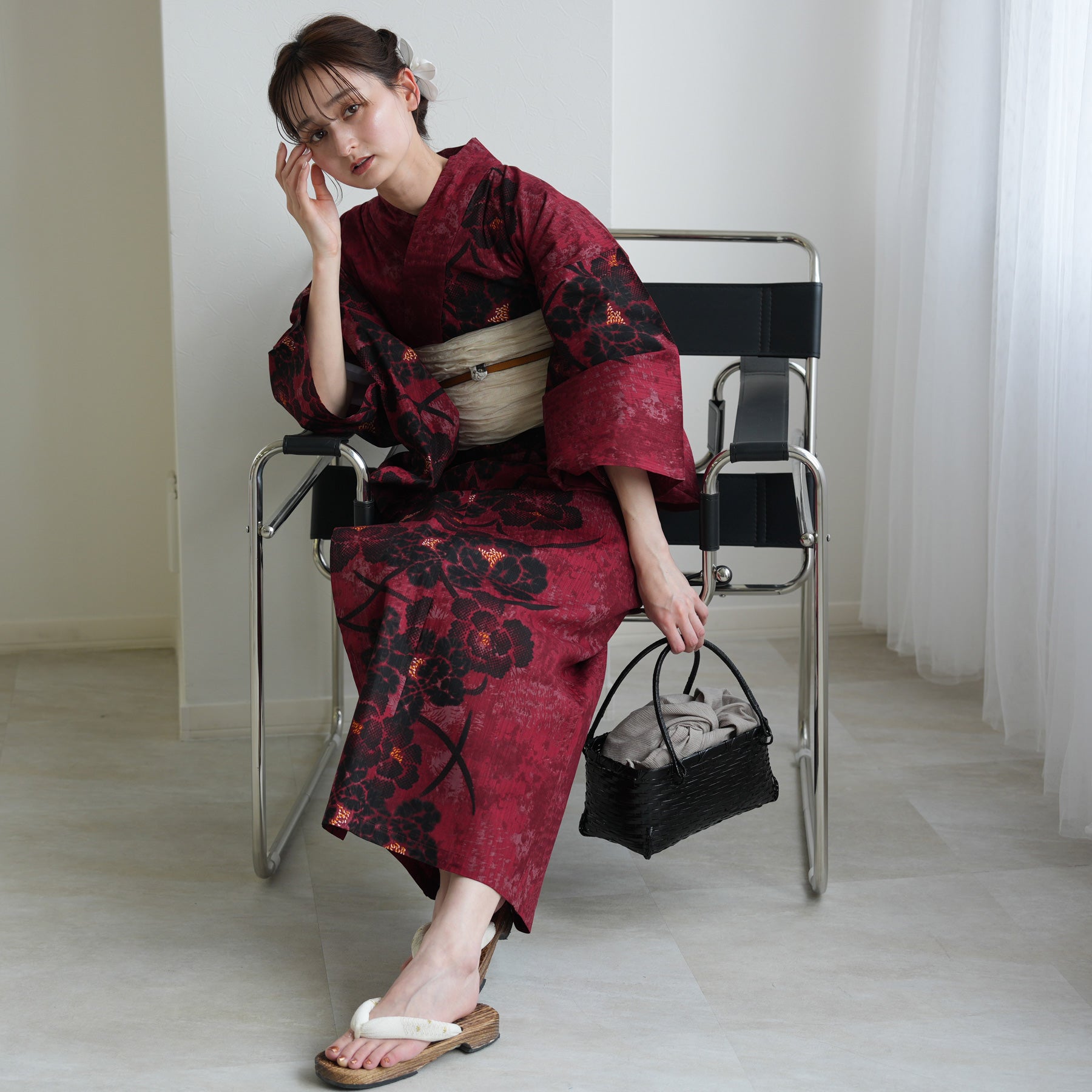 【セパレート高級変わり織 二部式浴衣3点セット ( ゆかた上下・帯・下駄 )ガーネットに牡丹の絞り柄】フリーサイズ  国産生地 国内染色 昭和初期アンティーク復刻版 (5016277311)