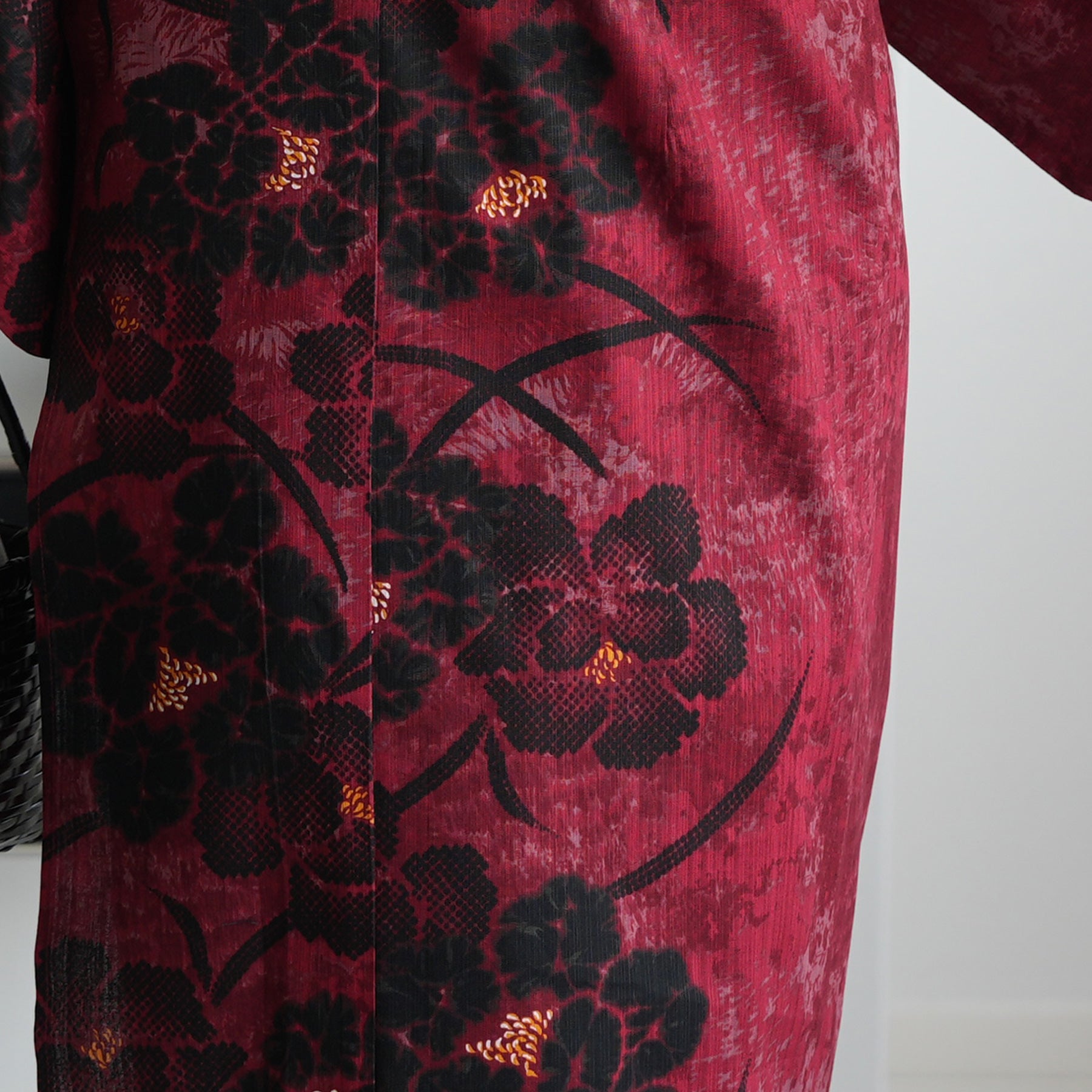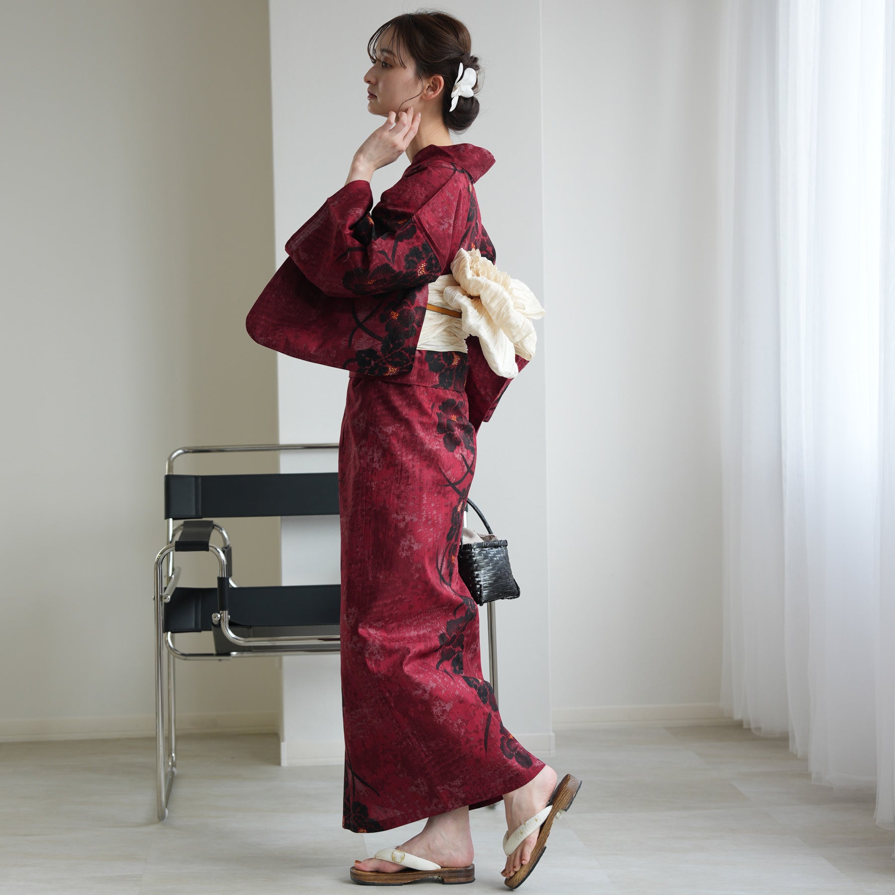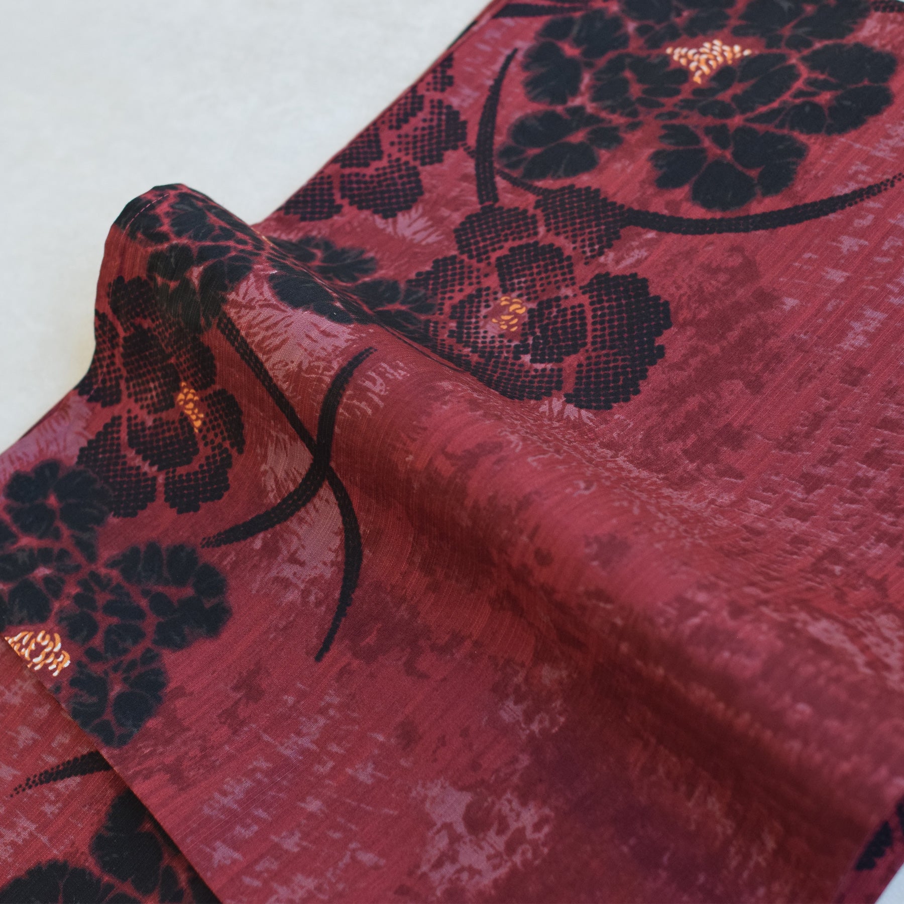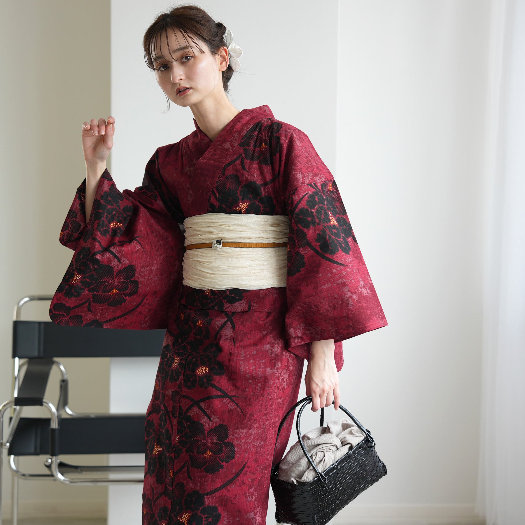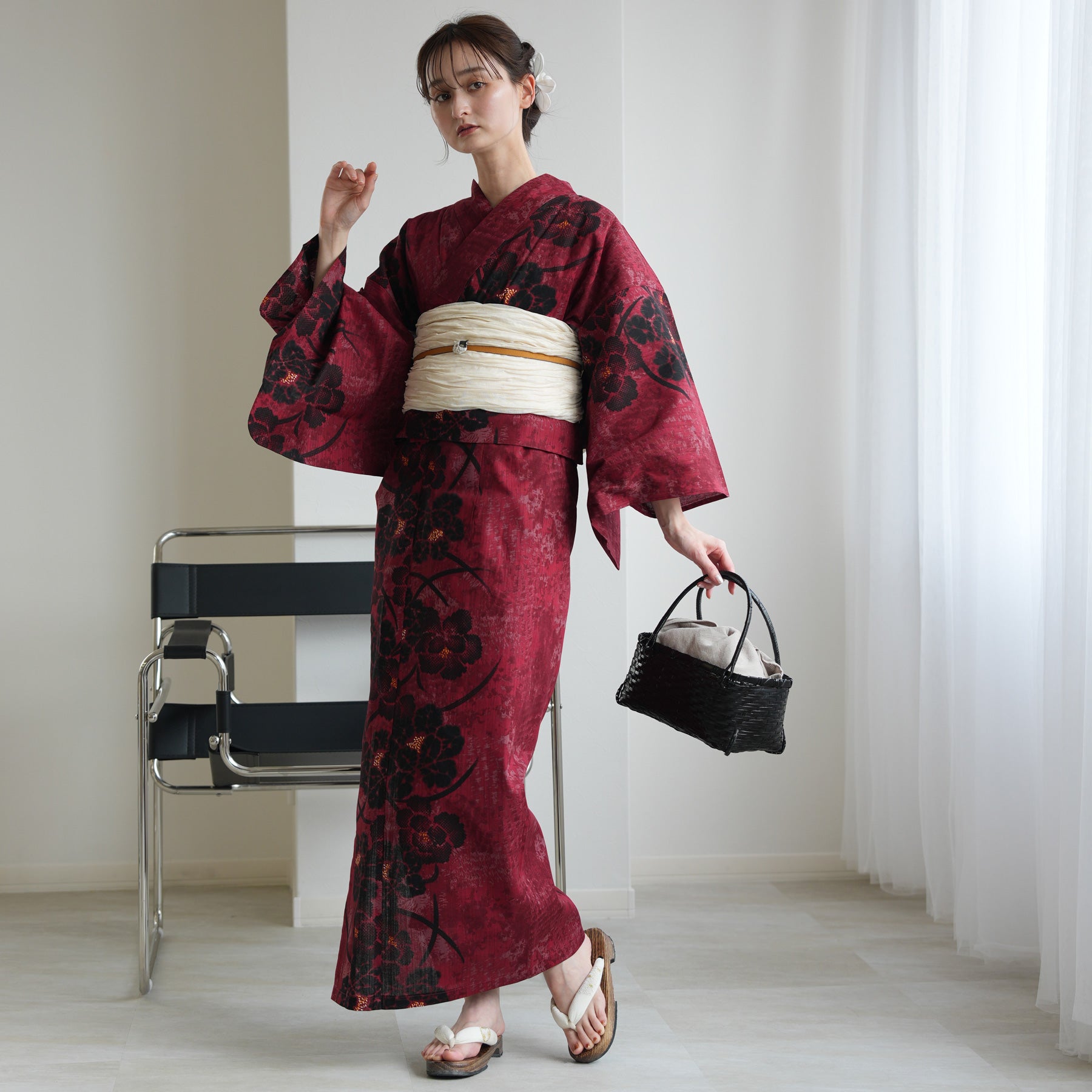 【セパレート高級変わり織 二部式浴衣3点セット ( ゆかた上下・帯・下駄 )ガーネットに牡丹の絞り柄】フリーサイズ  国産生地 国内染色 昭和初期アンティーク復刻版 (5016277311)