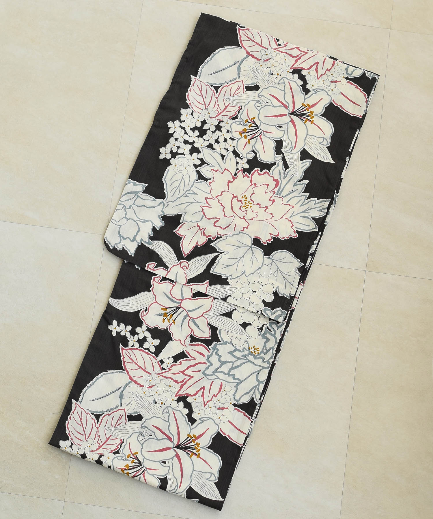 【単品浴衣 高級変わり織 鈍鉄紺に敷き詰められた百合と芍薬】フリーサイズ 国産生地・国内染色 (5000220200)