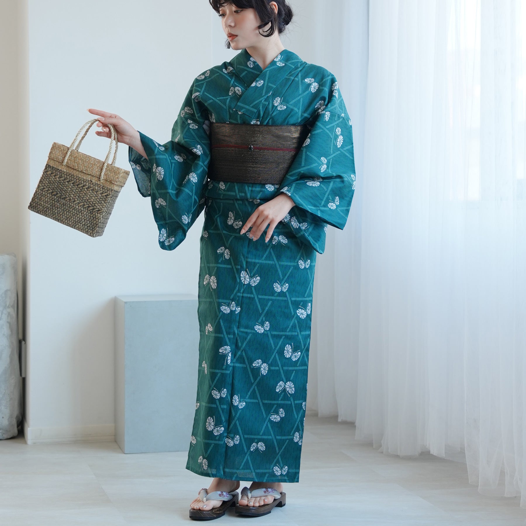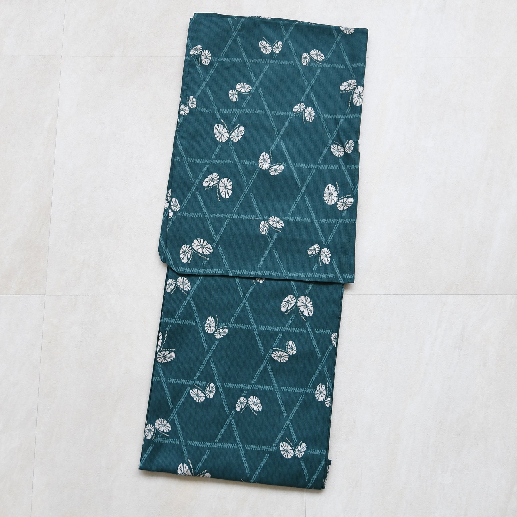 【単品浴衣 高級変わり織 碧にかごめ絞り柄の紋白蝶】フリーサイズ 国産生地・国内染色 ニコアンティーク (5000274300)