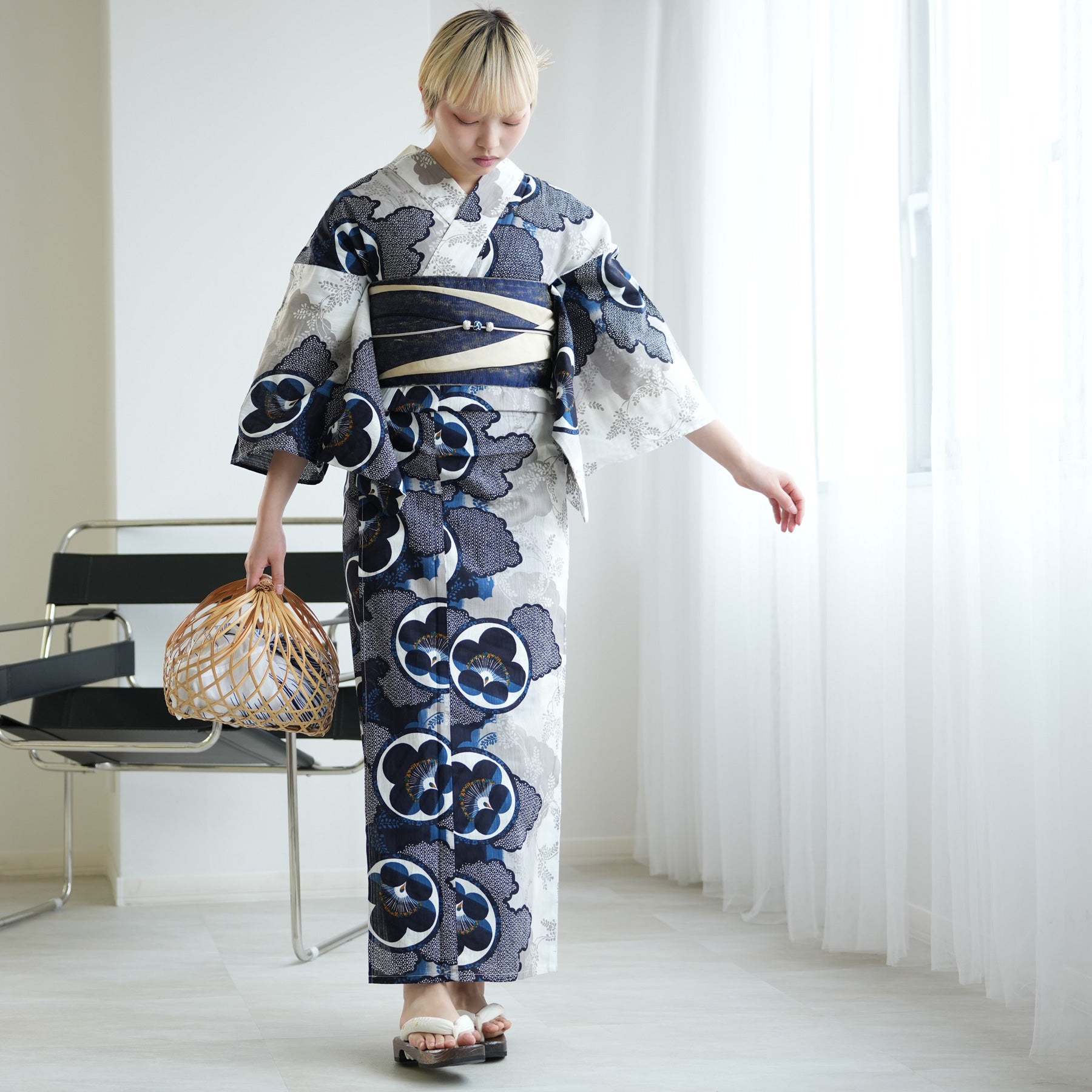 【単品浴衣 高級変わり織 ディープネイビーの梅と雲取】フリーサイズ 国産生地・国内染色 (5000277400)