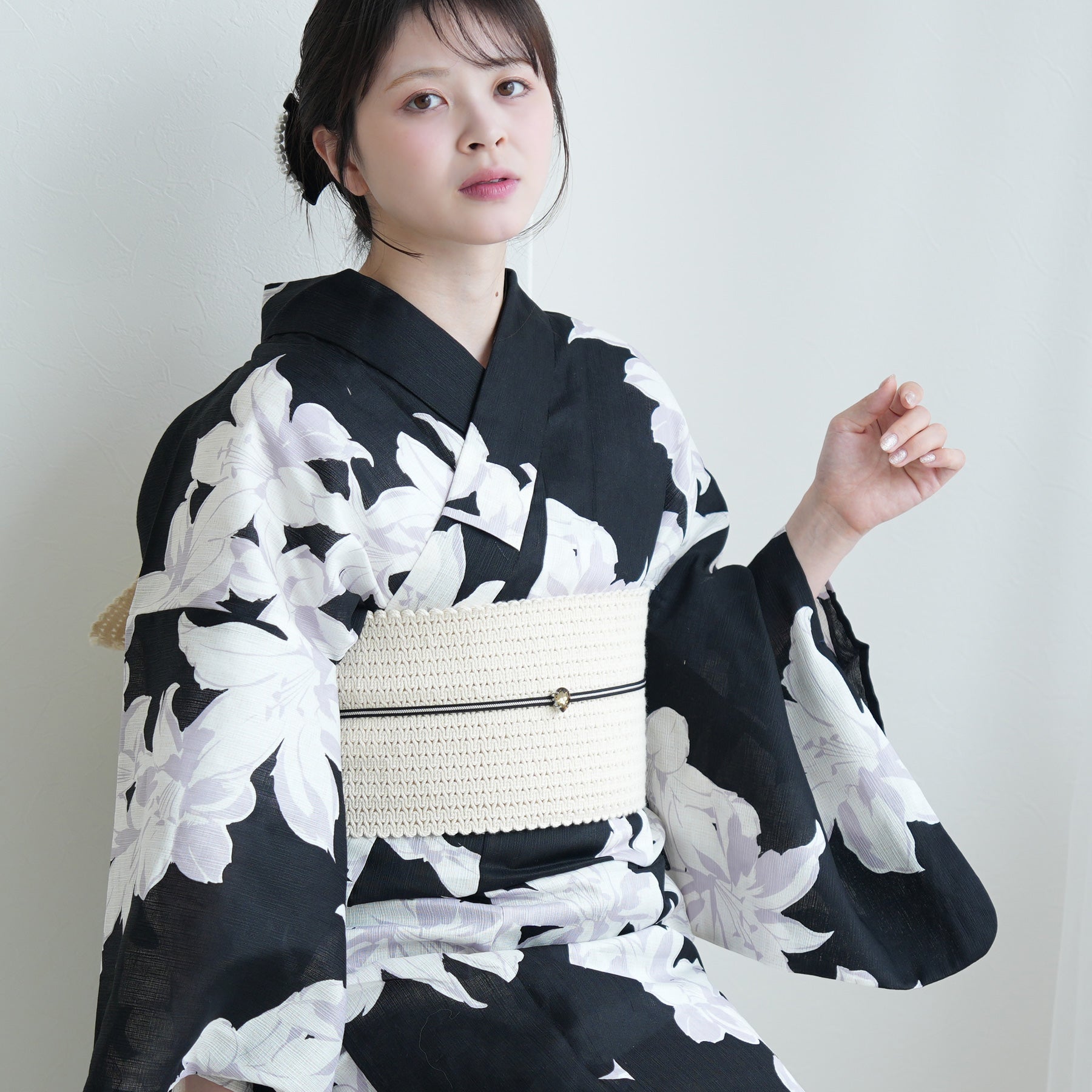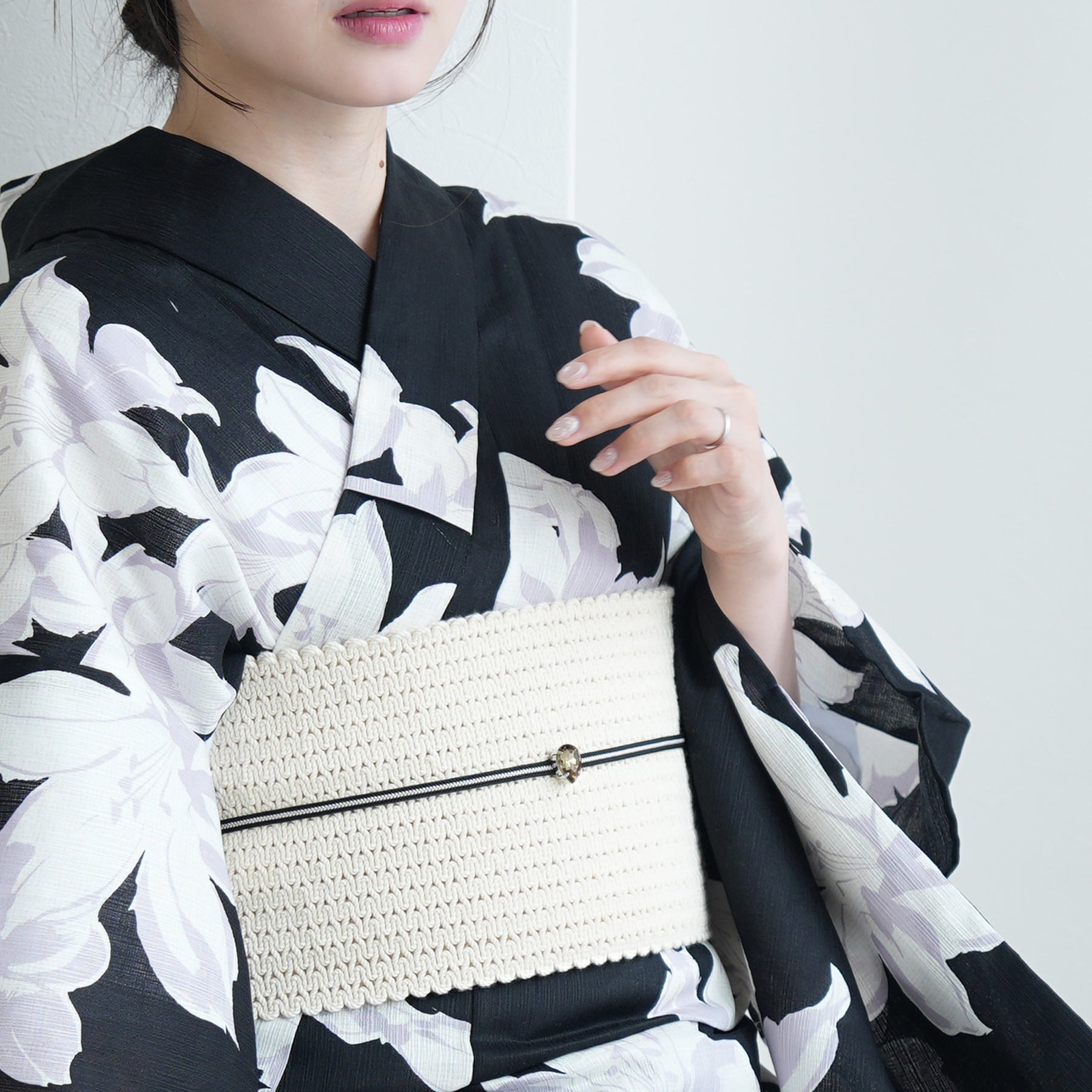 帯にはあえて軽やかなアイボリーを合わせることで、重たくなりすぎず、どこか都会的な抜け感をプラス。