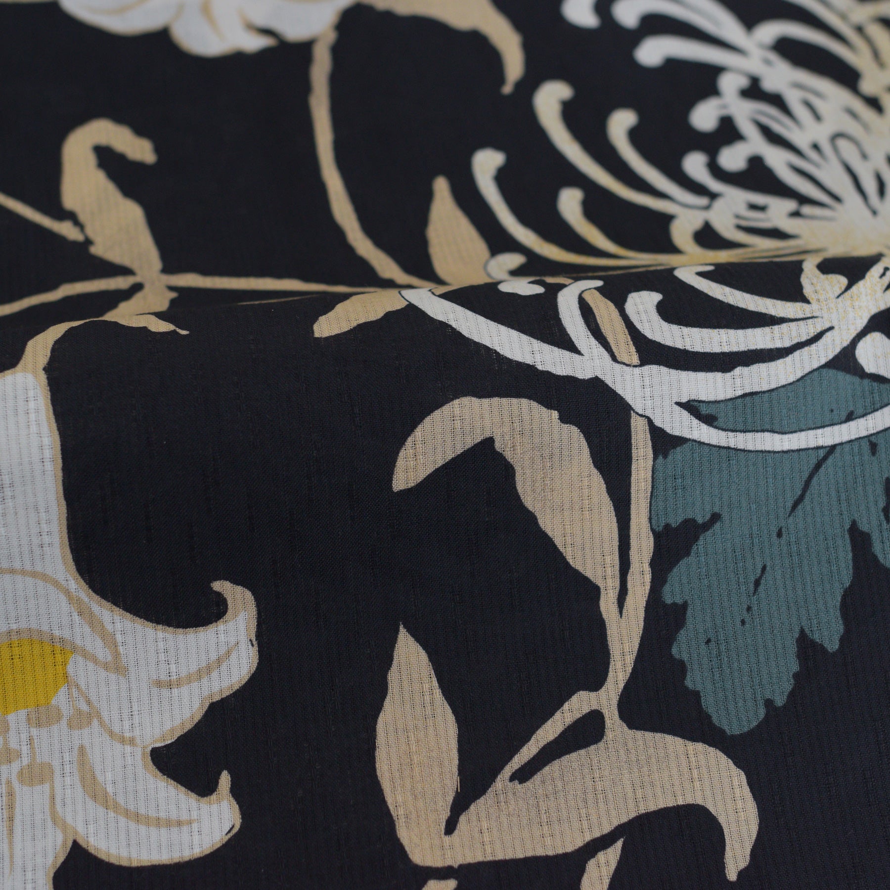 落ち着いた濃紺地は肌を白く見せ、華やかな糸菊の線が顔周りを明るく彩ります。