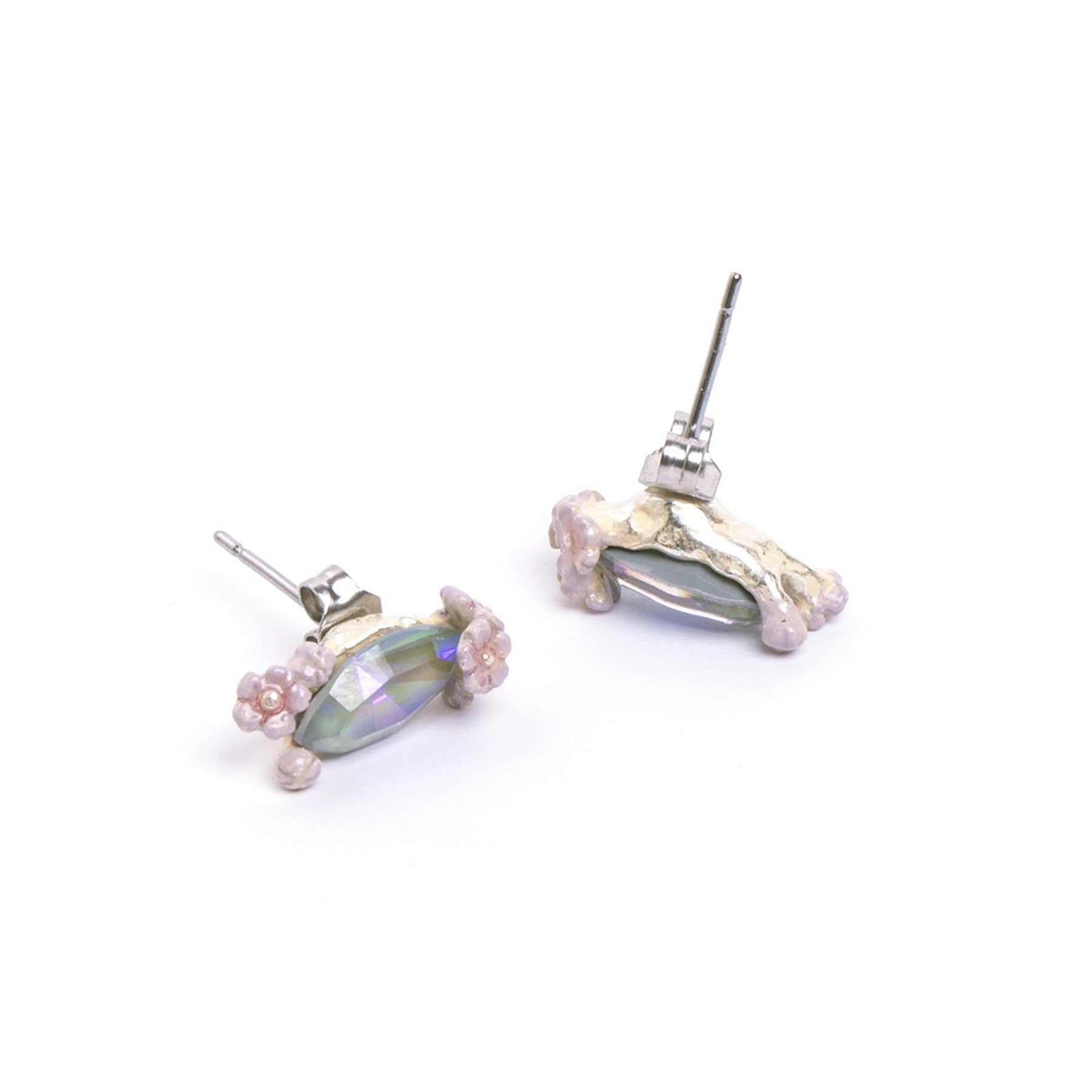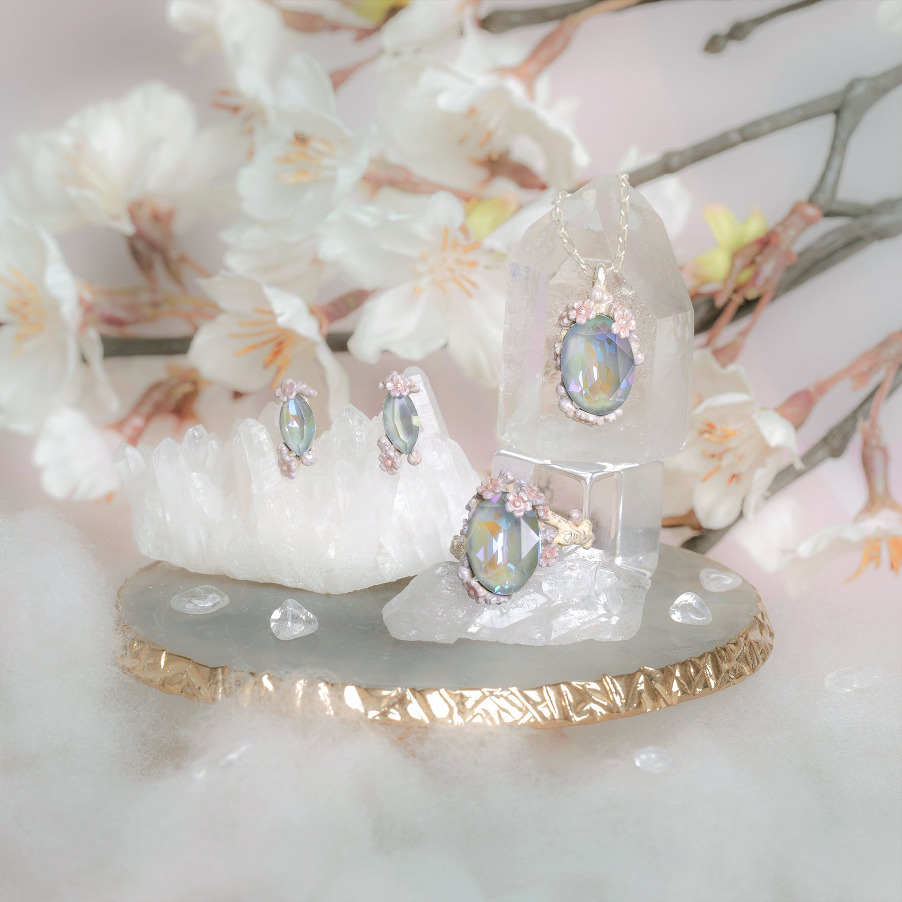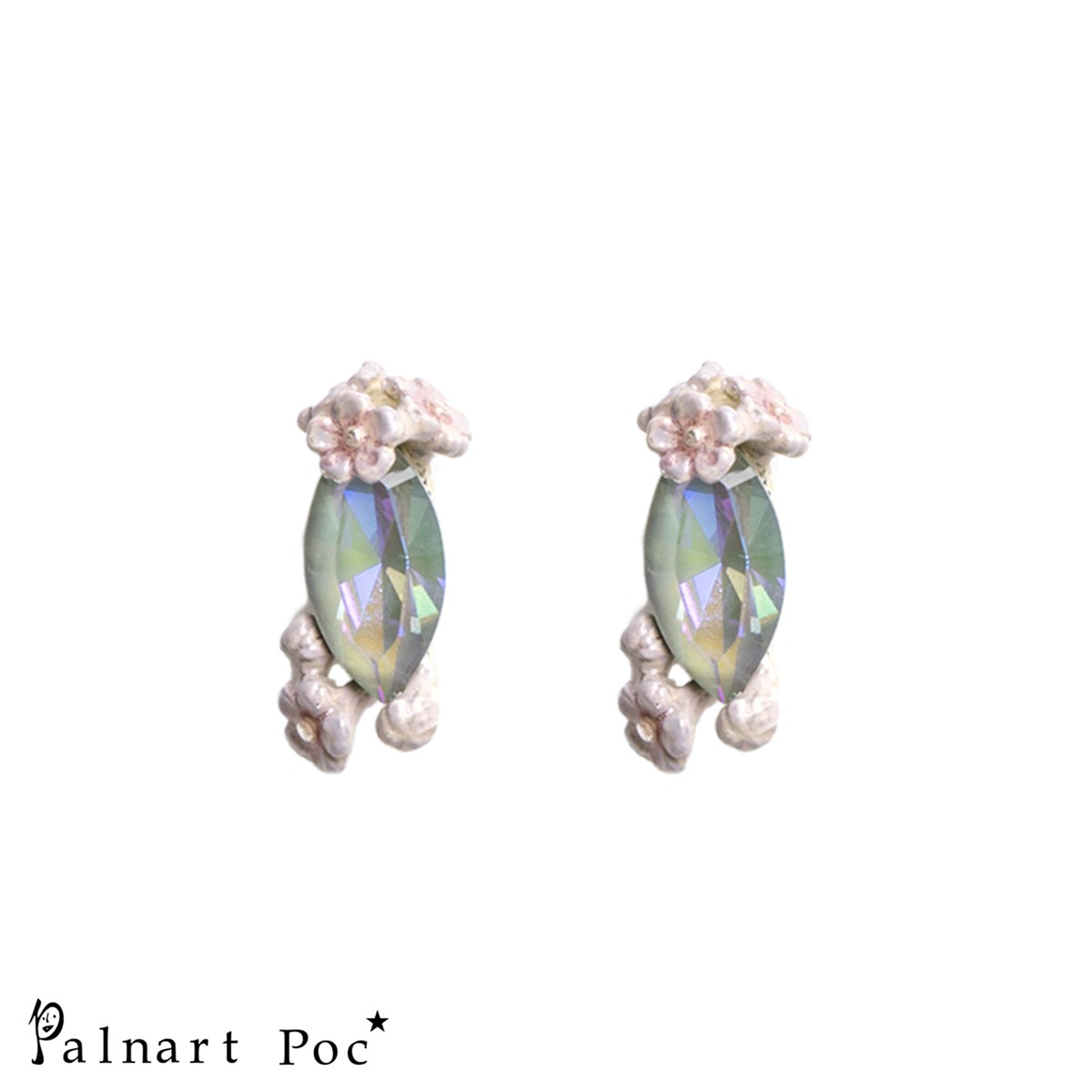 大きなカットガラスを桜の花が包み込んだようなデザインの可憐で儚げなピアス。