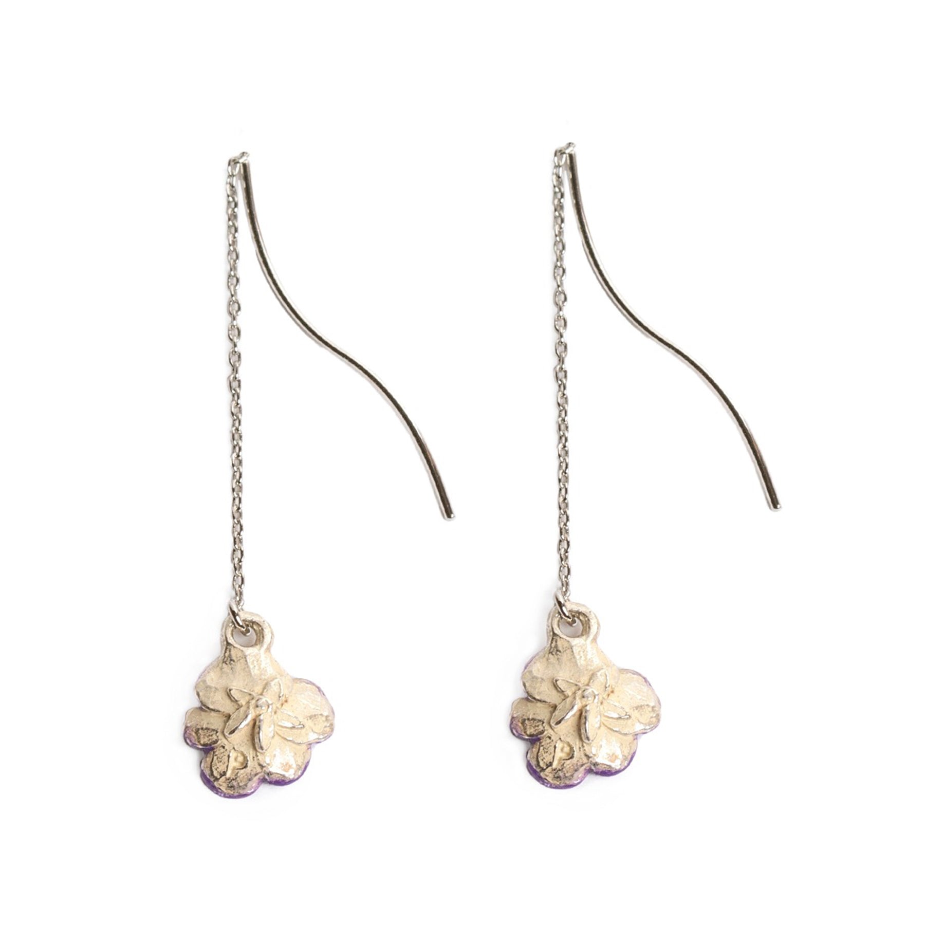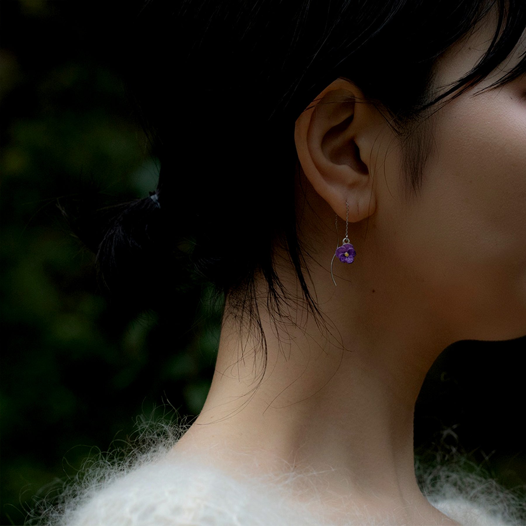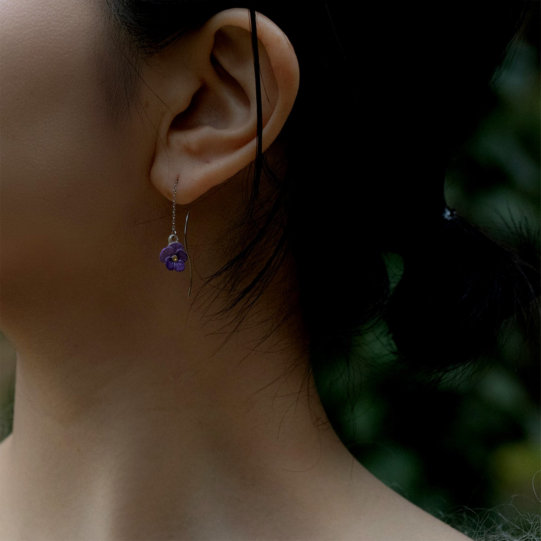 小ぶりなビオラが耳元で揺れる、アメリカンピアス。