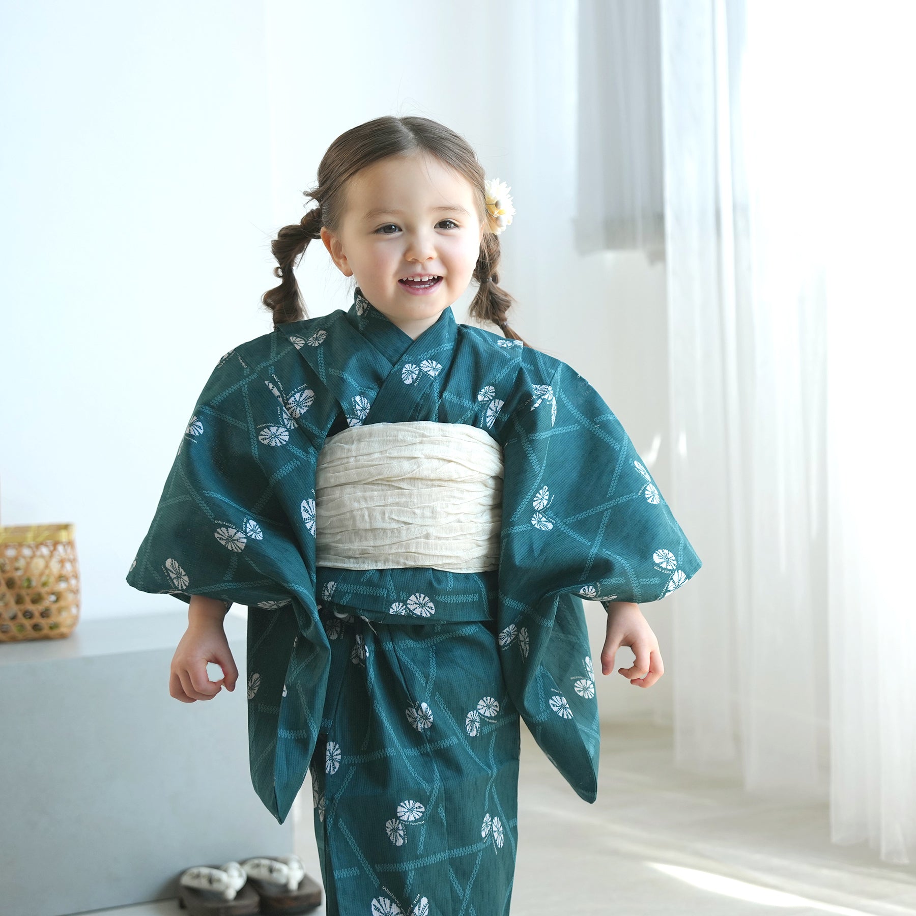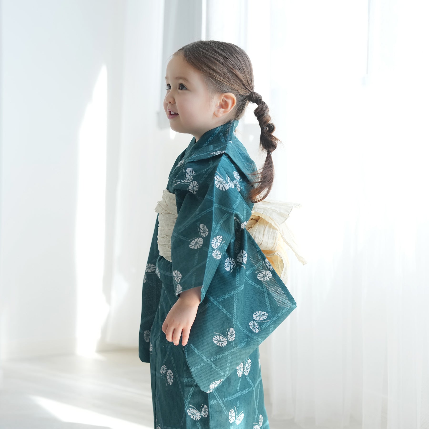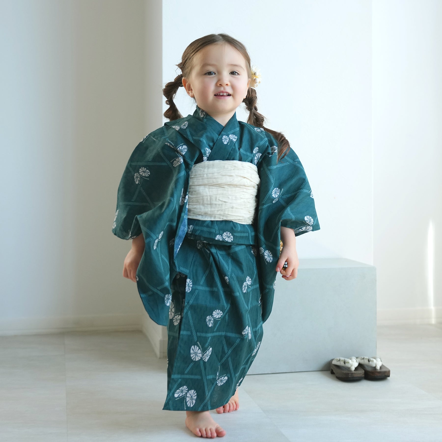 【ニコアンティーク kids 高級変わり織 子供浴衣3点セット(ゆかた・帯・下駄)女の子 碧にかごめ絞り柄の紋白蝶】 キッズ浴衣 国産生地 国内染色 (6510274301)