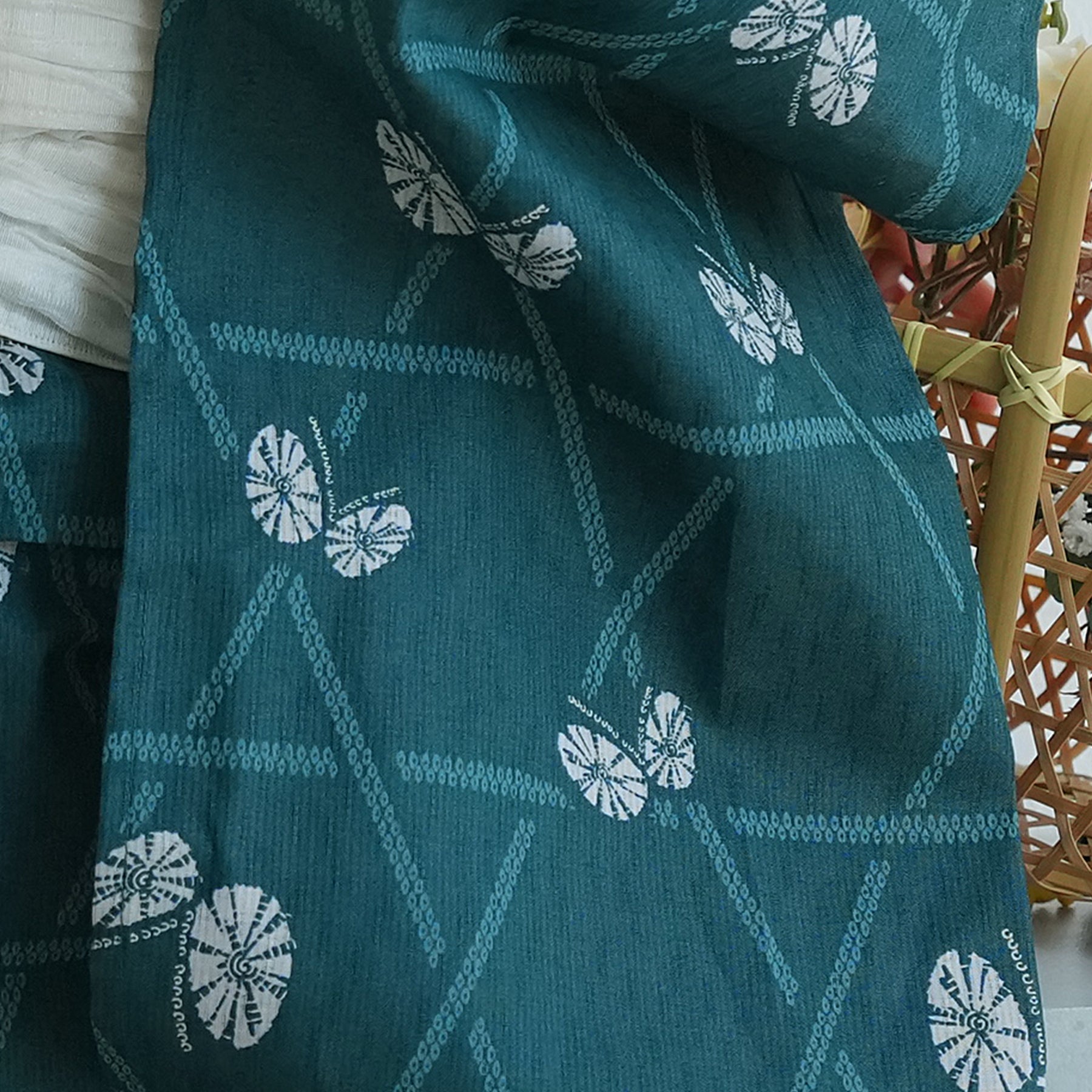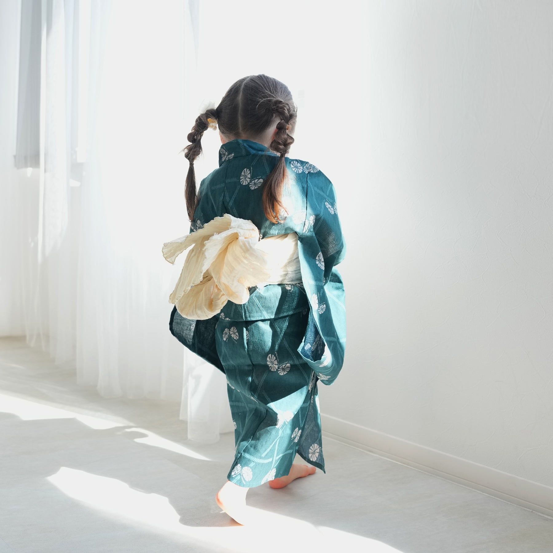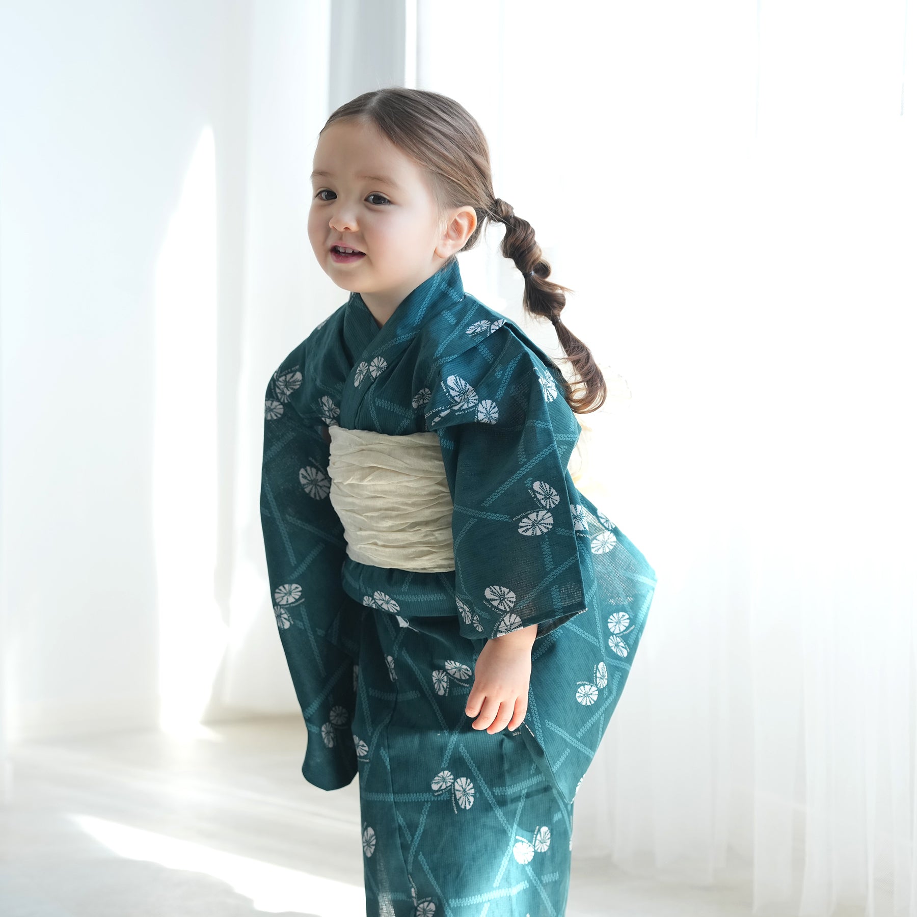 【ニコアンティーク kids 高級変わり織 子供浴衣3点セット(ゆかた・帯・下駄)女の子 碧にかごめ絞り柄の紋白蝶】 キッズ浴衣 国産生地 国内染色 (6510274301)